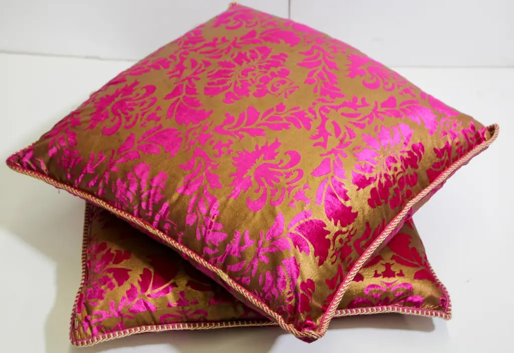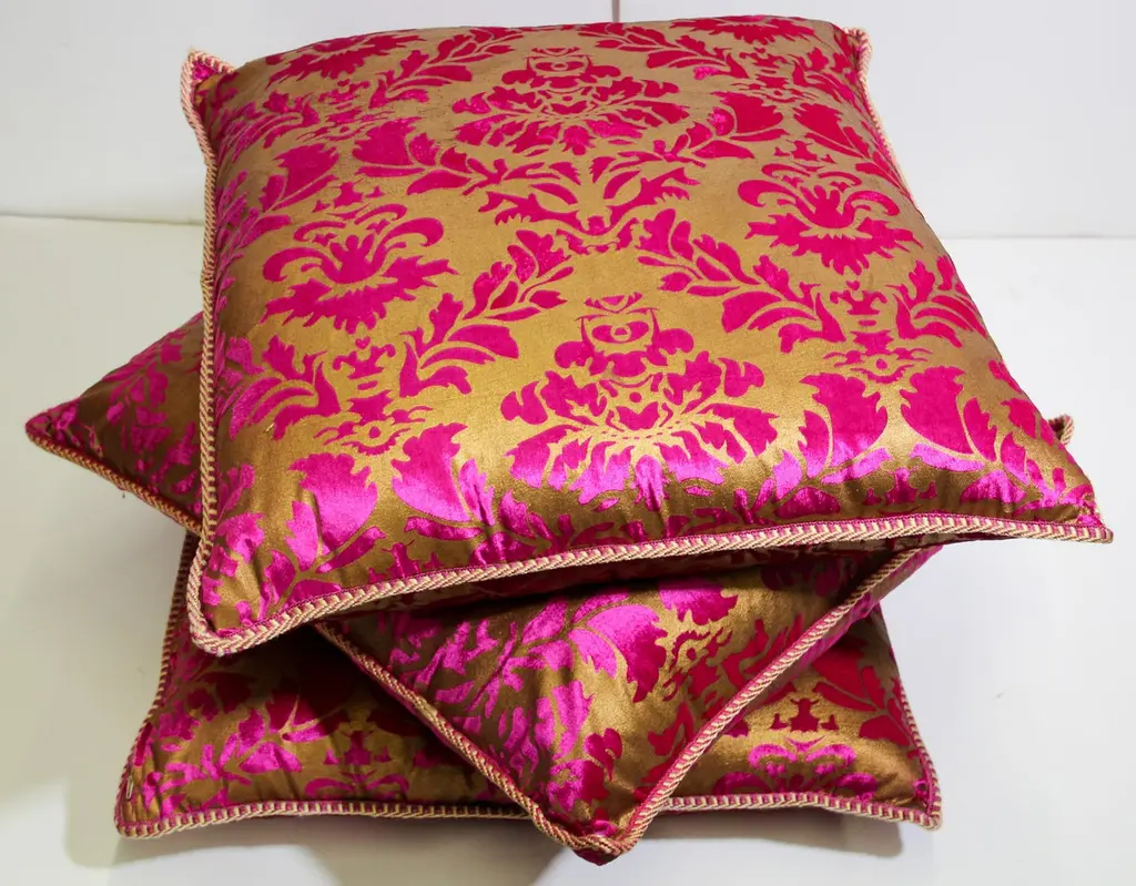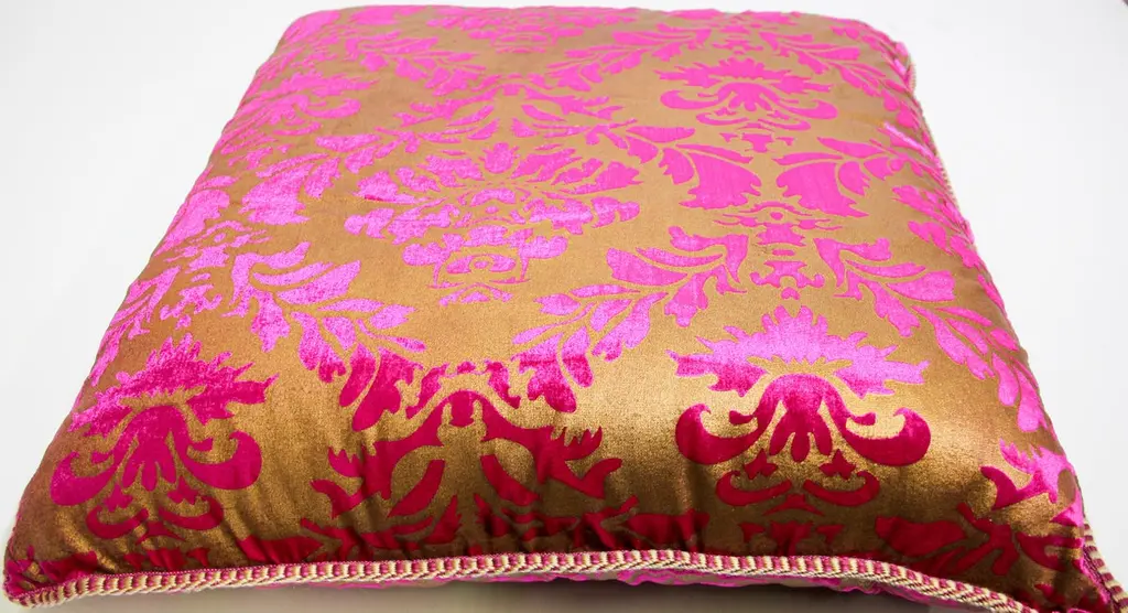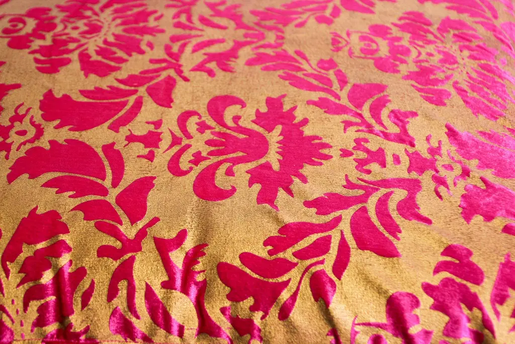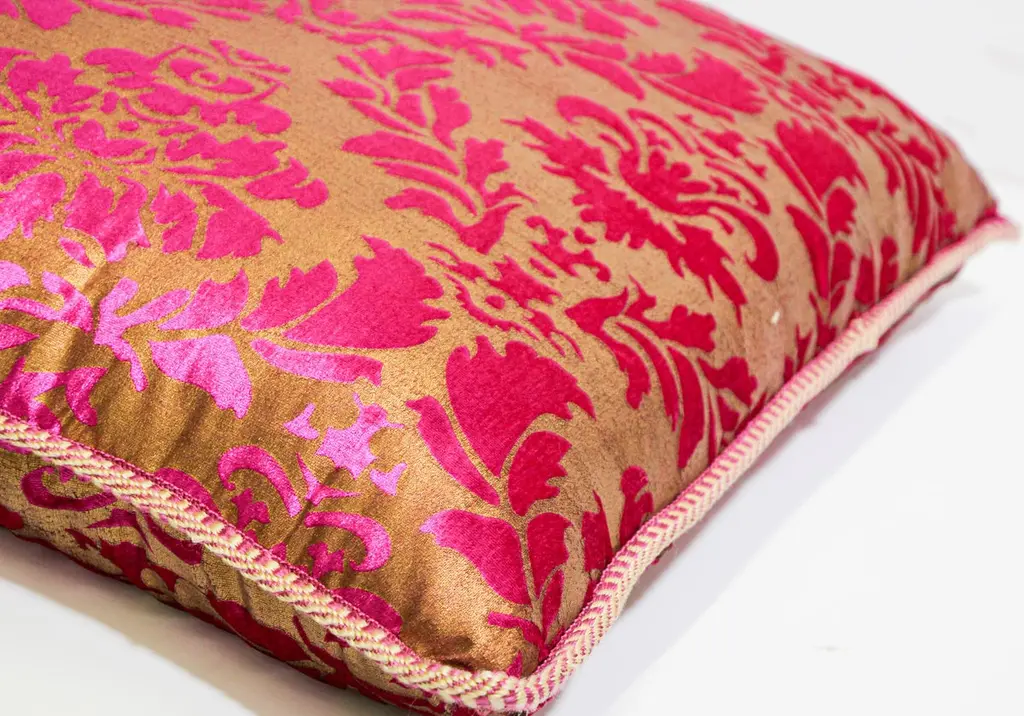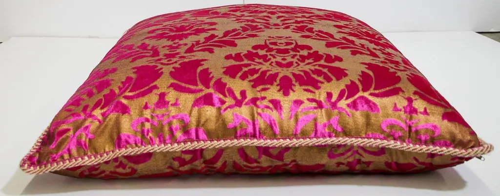 Oversized silk square pink and gold floor seat pillow.Handcrafted from silk velvet cut fabric, these Moorish style floor seat cushions are great to use in kids room or around your yoga Bohemian or Moroccan room or for your pet.Large oversized: 24" x 24" x 7".Moroccan square floor pillow cushion, use as ottoman or pouf.Zipper on side.Moroccan pouf great to use as an Ottoman or floor pillow for a modern or Bohemian decor.A meditation pillow, something to throw down and pull up to the fire, or up to the TV, for a party, a cozy seat for reading, an extra seat to pull up for a party, or even the most luxe dog bed ever.Multiple available, great to stack them and use them for your next Moroccan party.
