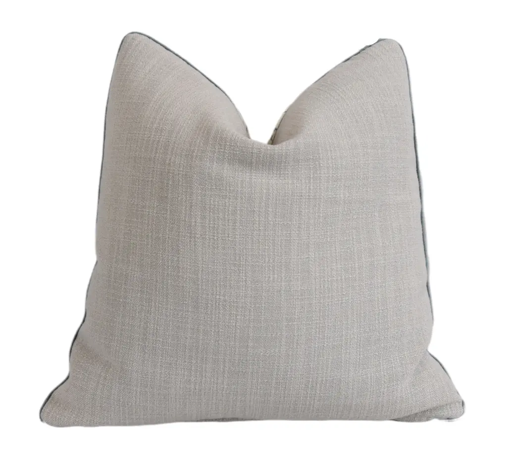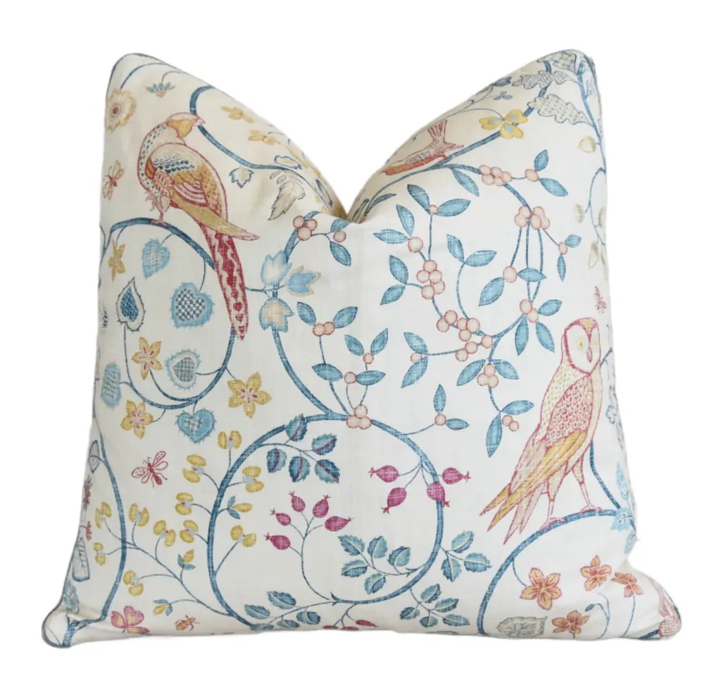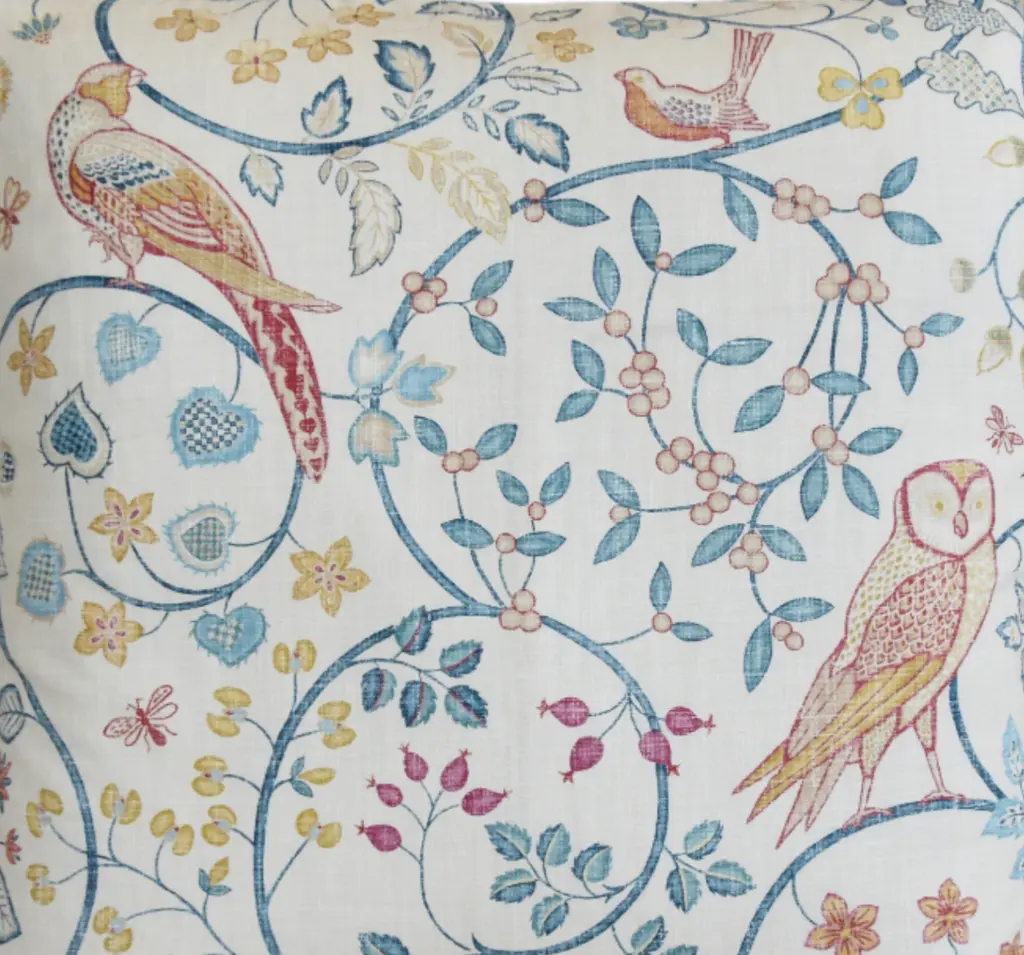 Custom-tailored pillow in English Morris & Company Fabrics linen blend fabric called "Newill" with beautiful birds and intertwining floral theme. Taupe-colored linen fabric back. Custom cord piping trim. Zipper closure. All pillows in this listing have an identical front and back fabric pattern design layout. New plump goose feather-and-down insert. Excellent new, unused condition!!!!