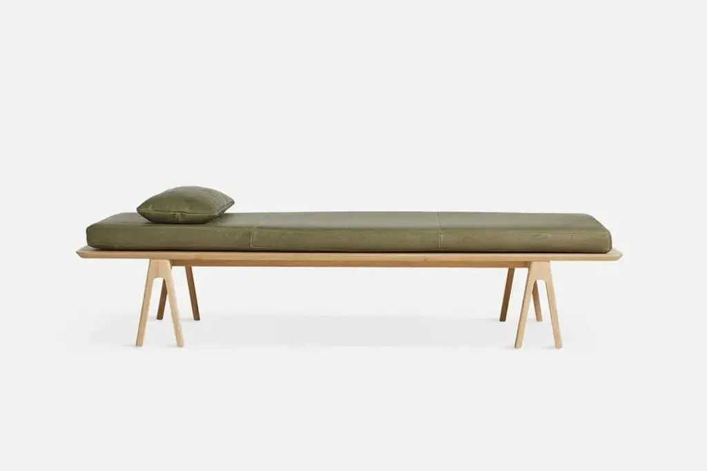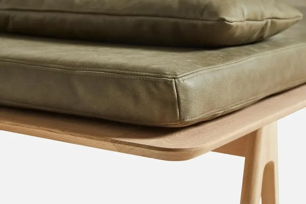 Moss green leather level pillow by msds studio. Materials: camo leather, fabric. Dimensions: d 23.5 x w 67 x h 8.5 cm. The founders, mia and torben koed, decided to put their 30 years of experience into a new project. It was time for a change and a new challenge. The challenge was to build an ambitious design brand from the ground up with high-quality materials and great attention to the little details. With a drive to create new originals, the woud collection is founded upon the idea to look ahead instead of looking back and share the love for honest design. Therefore, we are eager to discover and develop new ideas whether it being in form, function or choice of material.