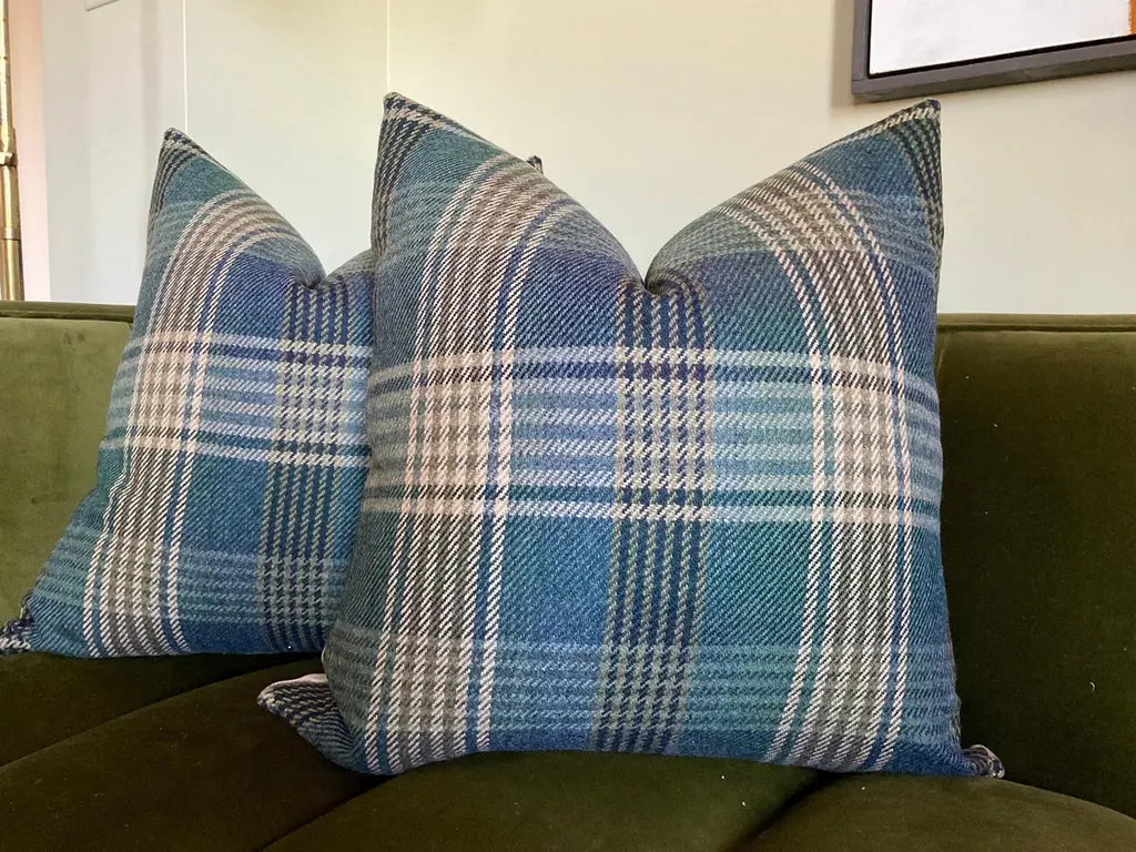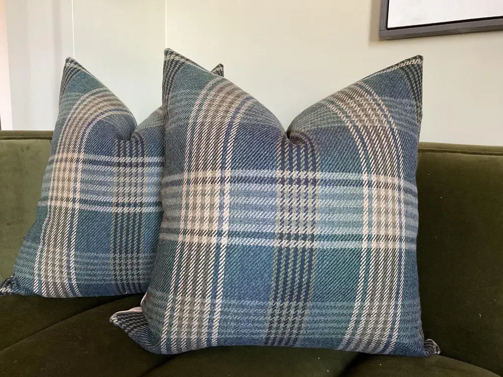 Such a lovely 100% British plaid in a heavenly shade of blue with tan accents! My current favorite item-From Mulberry’s collection for Lee Jofa.These gorgeous woolen front pillows will feature the plaid front with a sumptuous tan velvet back. Wonderful hand and rich colors make these covers perfect additions!This listing is for a pair(2) 22” pillows complete with plush down inserts!About UsAt AccentMarks, each designer pillow is crafted with care using the finest hand-selected fabrics and trims, paired with durable, discreet invisible zippers. We specialize in creating beautiful, high-quality pieces that elevate your home decor. While most of our listings feature 22" pillow pairs, we also offer a range of sizes and single pillow options to suit your needs. All of our pillows are proudly made in the United States.If you don't see the fabric you're searching for, please reach out via message as we have other fabrics available upon request and can create anything that you like. Thank you for visiting AccentMarks!