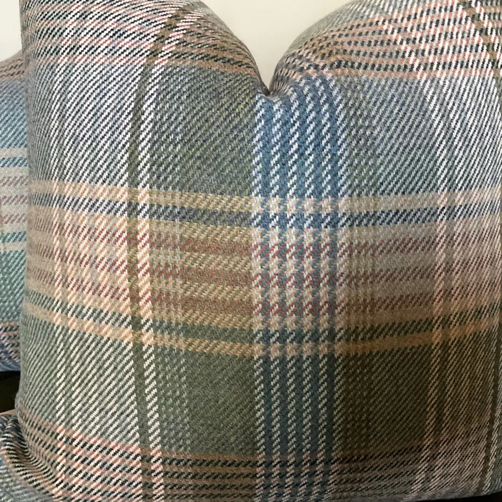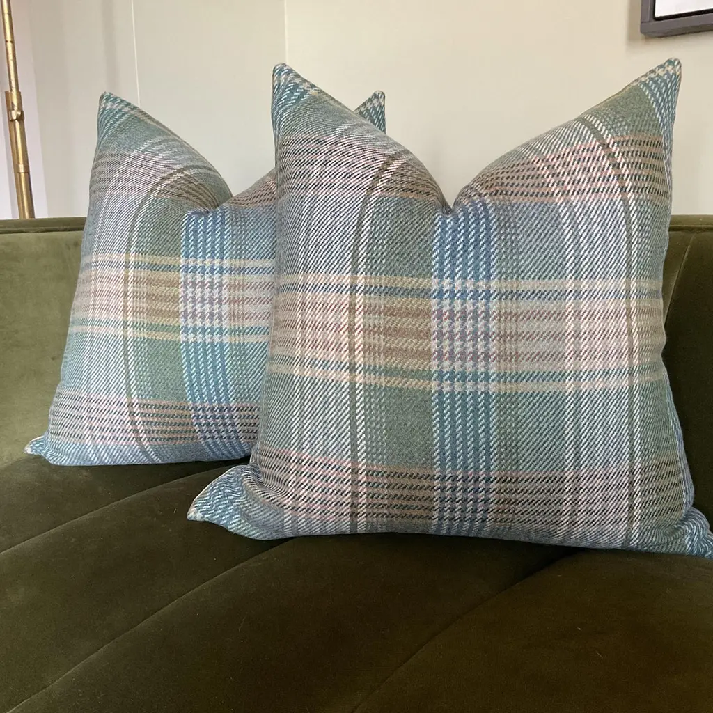 Such a lovely 100% British plaid in a heavenly shade of light teal with tan accents! My current favorite item from Mulberry’s Collection for Lee Jofa .These gorgeous woolen front pillows will feature the plaid front with a sumptuous tan velvet back. Wonderful hand and rich colors make these covers perfect additions!This listing is for a pair(2) 22” pillows complete with plush down inserts!About UsAt AccentMarks, each designer pillow is crafted with care using the finest hand-selected fabrics and trims, paired with durable, discreet invisible zippers. We specialize in creating beautiful, high-quality pieces that elevate your home decor. While most of our listings feature 22" pillow pairs, we also offer a range of sizes and single pillow options to suit your needs. All of our pillows are proudly made in the United States.If you don't see the fabric you're searching for, please reach out via message as we have other fabrics available upon request and can create anything that you like. Thank you for visiting AccentMarks!