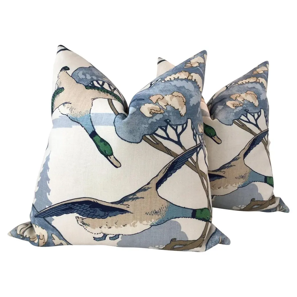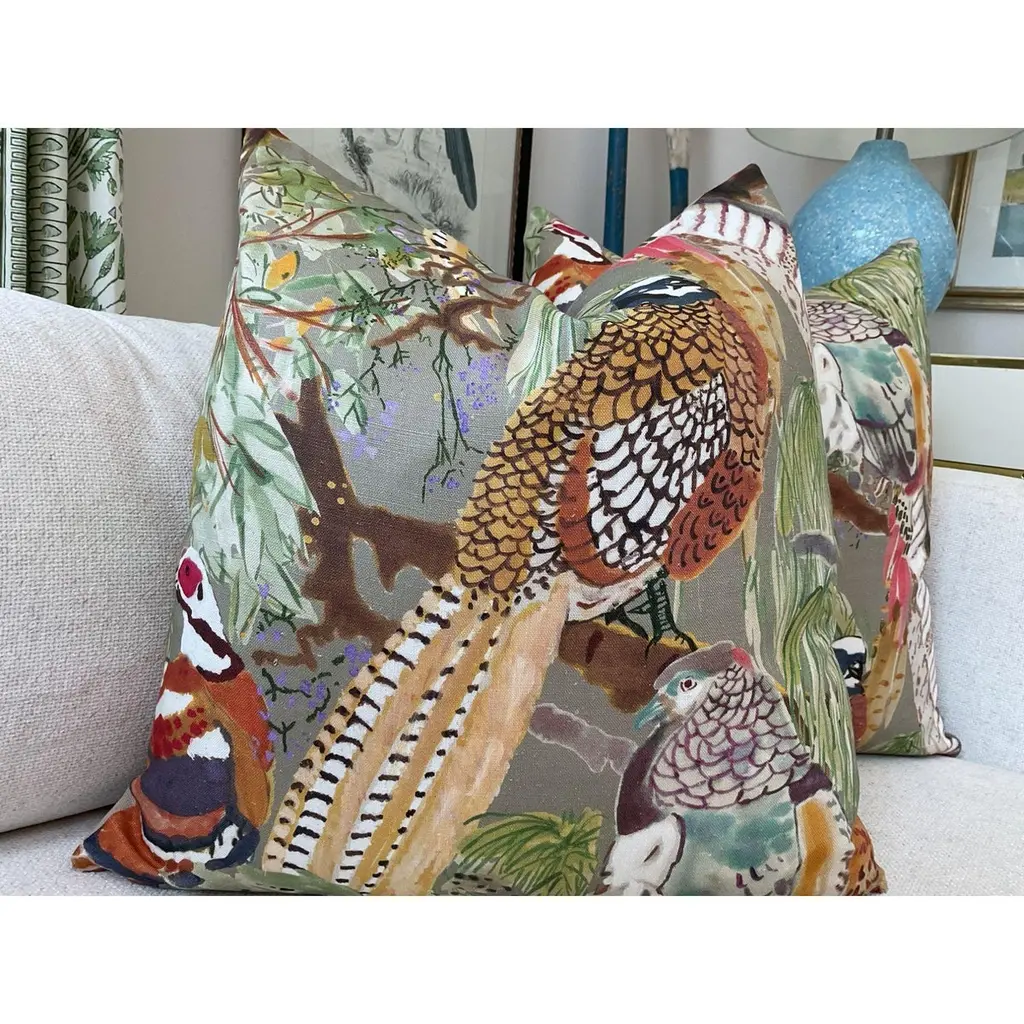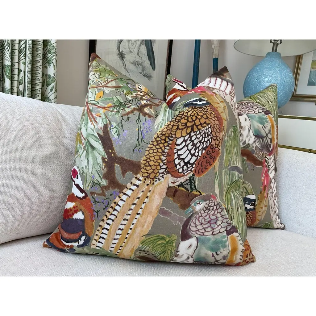 Lovely linen rich and luxurious fabric from Mulberry by Lee Jofa in the Bohemian Romance Collection. Game Birds features birds in wonderfully saturated shades of cinnamon, brown, and black with foliage in deep green and straw tan. Pillows will come as a 22" pair with plush down inserts featuring the fabric on the front with a coordinating soft linen back. . Closure is by way of an invisible zipper. Important to note that pattern placement will vary given the geometric nature of the design. Please request a photo prior to cutting if this is something you are concerned about.About UsAt Accent Marks, each designer pillow is crafted with care using the finest hand-selected fabrics and trims, paired with durable, discreet invisible zippers. We specialize in creating beautiful, high-quality pieces that elevate your home decor. While most of our listings feature 22" pillow pairs, we also offer a range of sizes and single pillow options to suit your needs. All of our Accent Marks pillows are proudly made in the United States.If you don't see the fabric you're searching for, please reach out via message as we have other fabrics available upon request and can create anything that you like. Thank you for visiting Accent Marks!