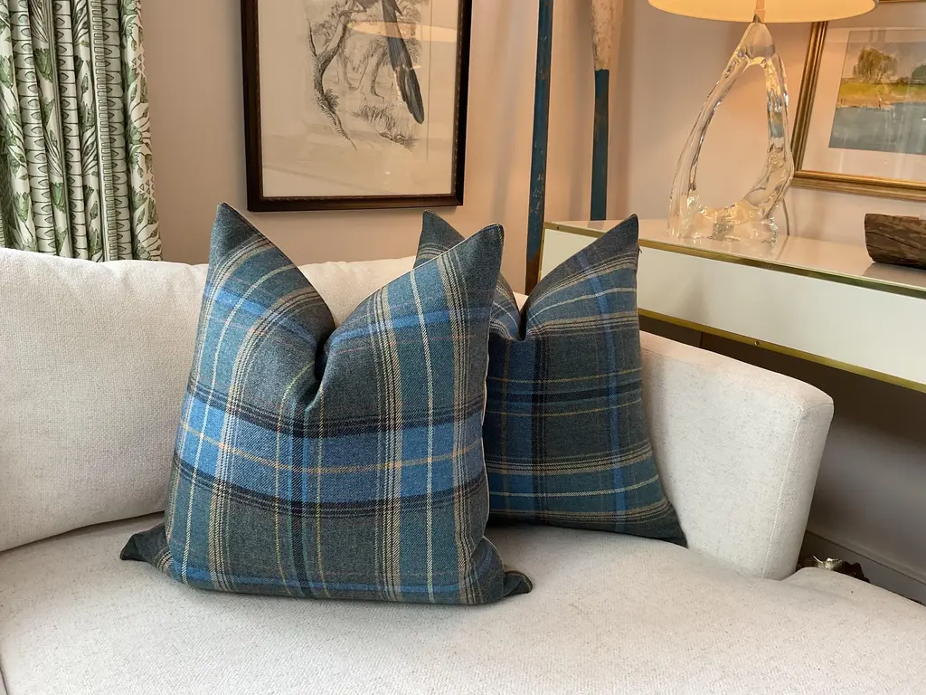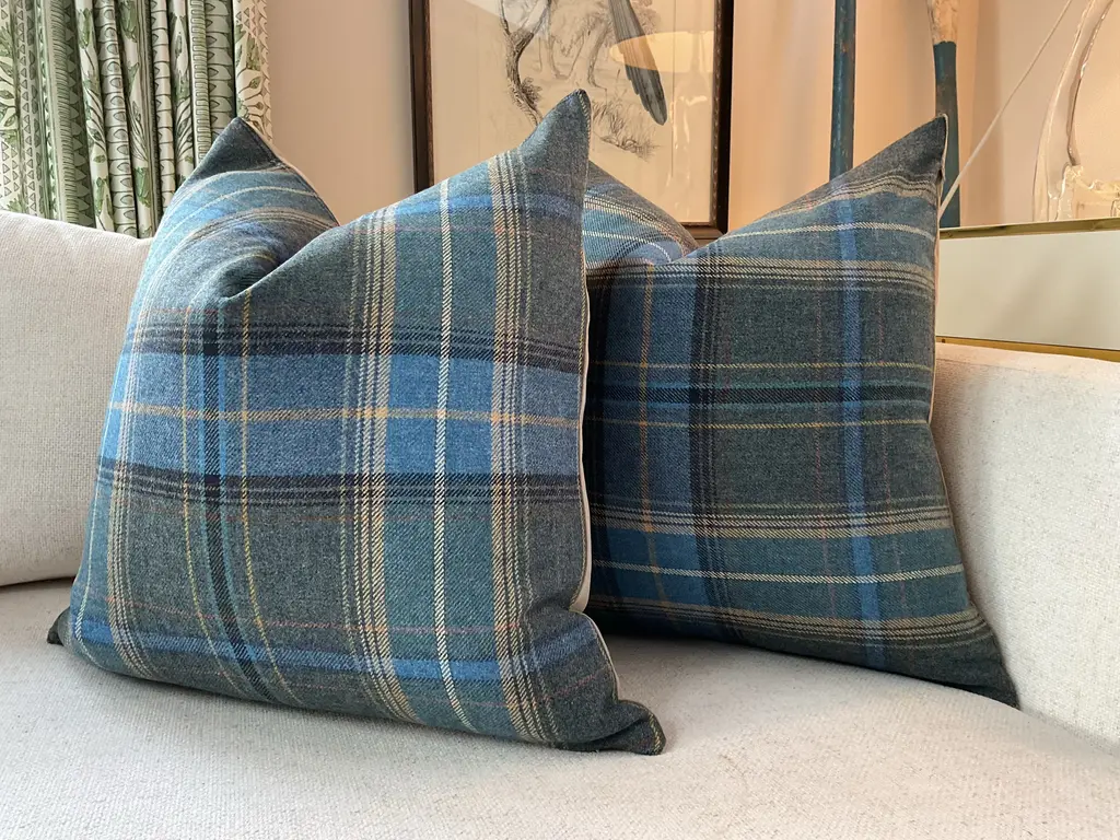 Such a lovely 100% British plaid in a heavenly shade of light blue with tan accents! My current favorite item-From Mulberry’s Bohemian Romance collection for Lee Jofa . These gorgeous woolen front pillows will feature the plaid front with a sumptuous tan velvet back. Wonderful hand and rich colors make these covers perfect additions! This listing is for a pair(2) 22” pillows complete with plush down inserts!