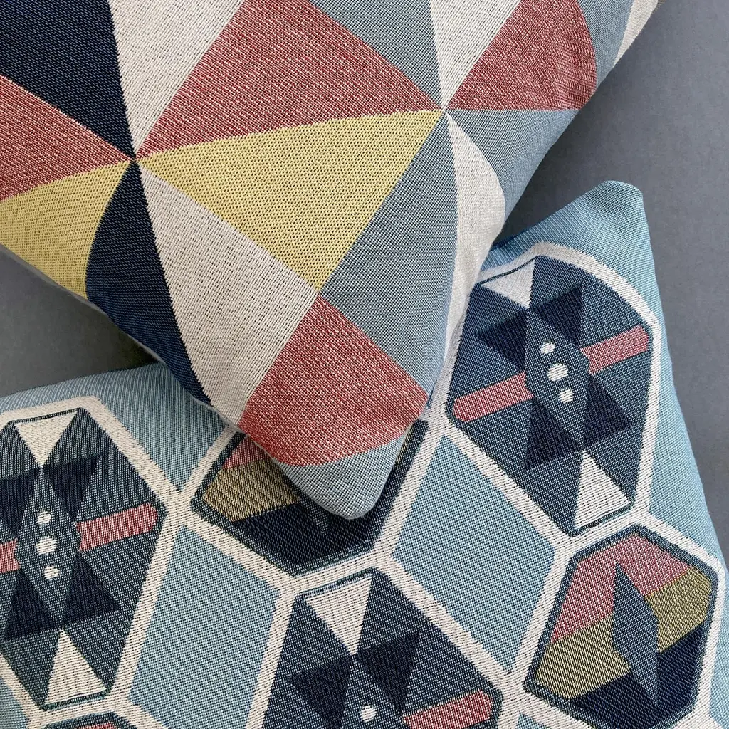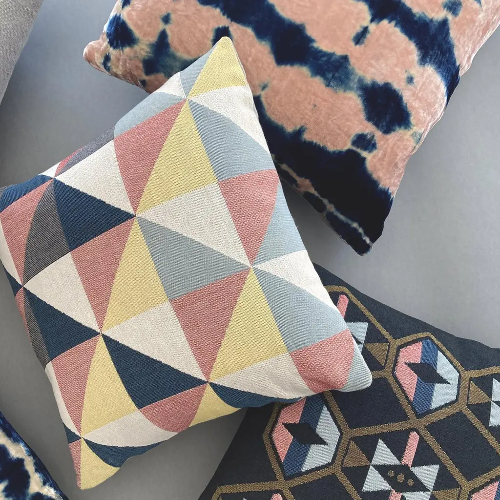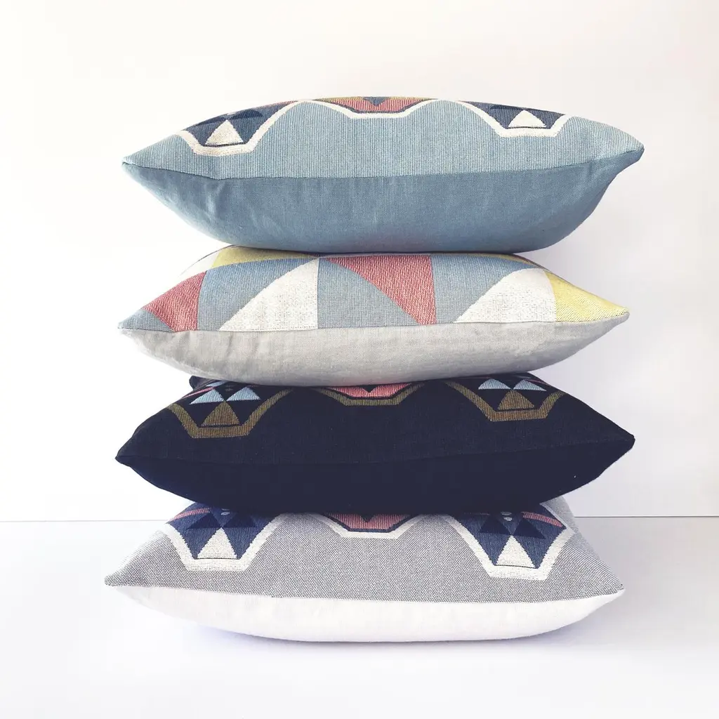 The Sixteen upholstered pillow in navy, pink, ochre and gray print with light gray linen backing, down pillow insert made locally in NYC. Cotton upholstered fabric woven on a jacquard loom, made in the US. Pillow measures 17 x 17 inches.This geometric patterned pillow is inspired by a painting we created for our New York City Studio.Note: Invisible zip closure at bottom of pillow. Care Instructions: Spot treat only. Do not dry clean or machine wash.