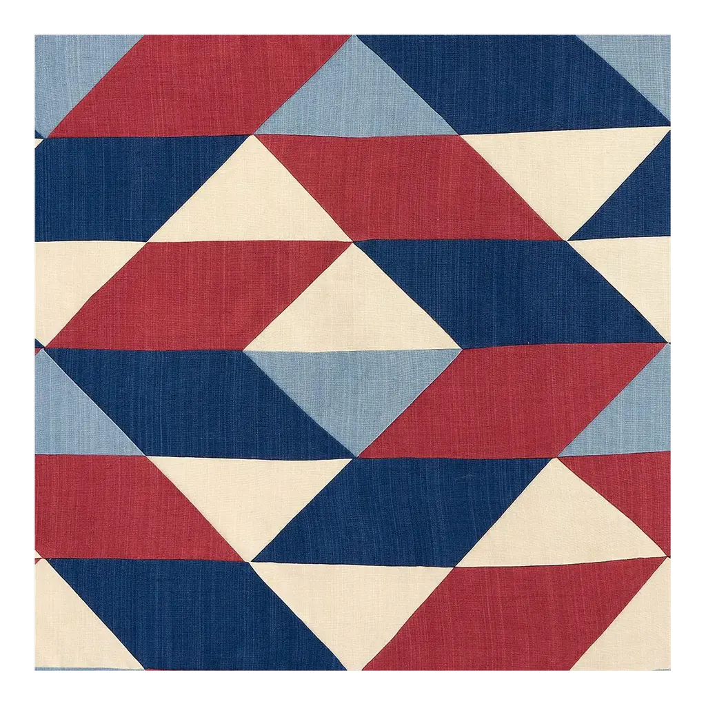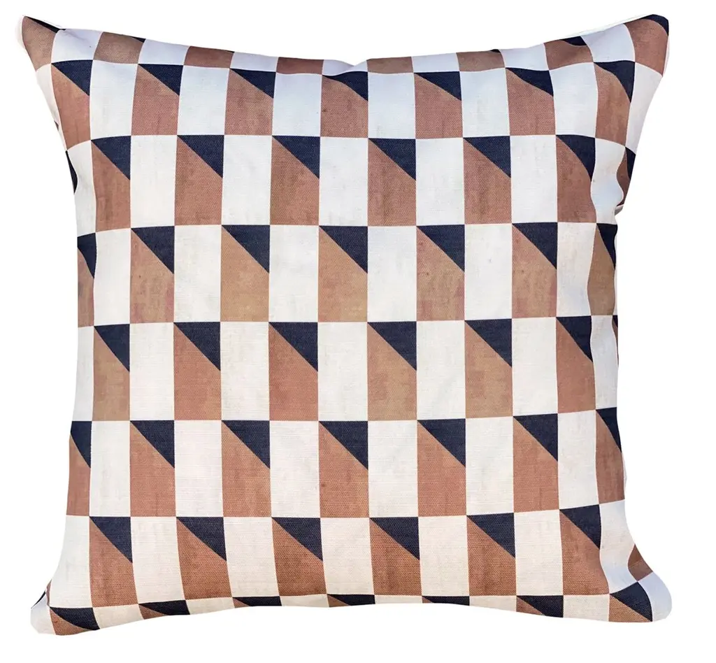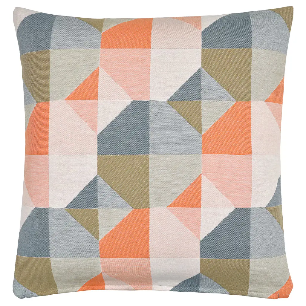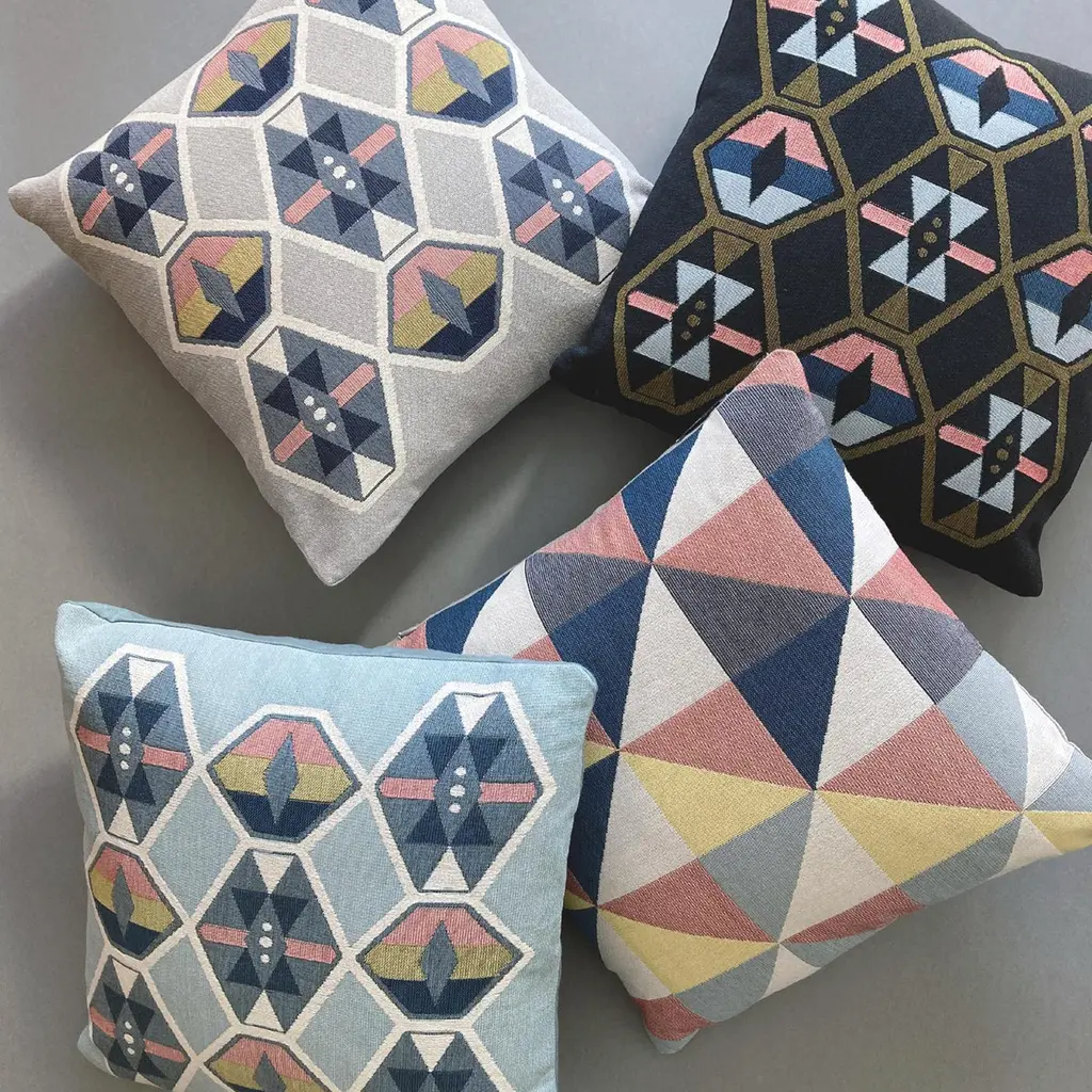 The Sixteen upholstered pillow in navy, pink, ochre and gray print with light gray linen backing, down pillow insert made locally in NYC. Cotton upholstered fabric woven on a jacquard loom, made in the US. Pillow measures 17 x 17 inches.This geometric patterned pillow is inspired by a painting we created for our New York City Studio.Note: Invisible zip closure at bottom of pillow. Care Instructions: Spot treat only. Do not dry clean or machine wash.
