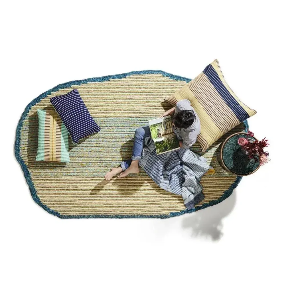 Musgo chumbes pillow 2 by Mae Engelgeer. Materials: 100% Cotton. Technique: hand-woven in Colombia. Dimensions: W 80 x H 80 cm Available in colors: musgo/banana/silver/pasto. Also available in sizes: small, large, and cylinder pillow. The Chumbes cushion is a sumptuous accessory created by Dutch textile designer Mae Engelgeer. A lively addition to any sofa or lounge chair, its very intricate stripe pattern is inspired by the Chumbe Inga, a traditional Colombian garment. The cushion features two different hand-woven motifs that have a ribbed structure, making it a joy to touch. Thanks to the metallic threads that have been woven into the cotton, the cushion has a gentle lustrous shine.