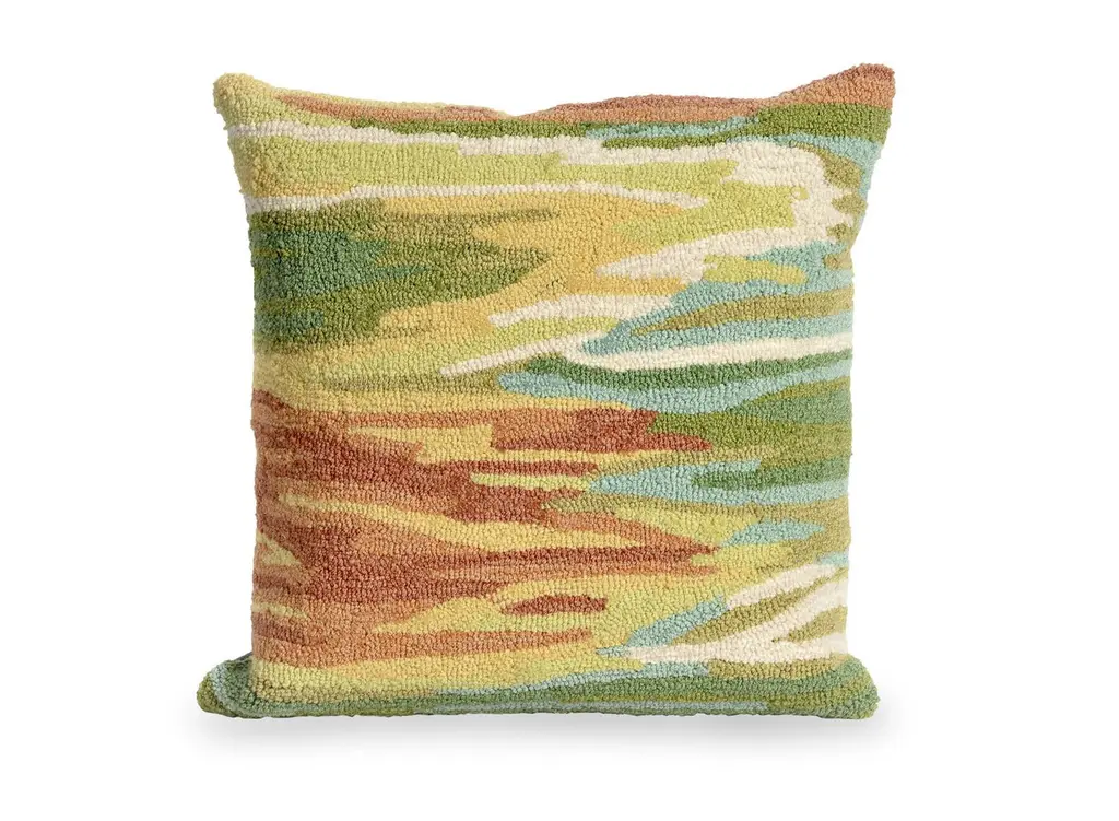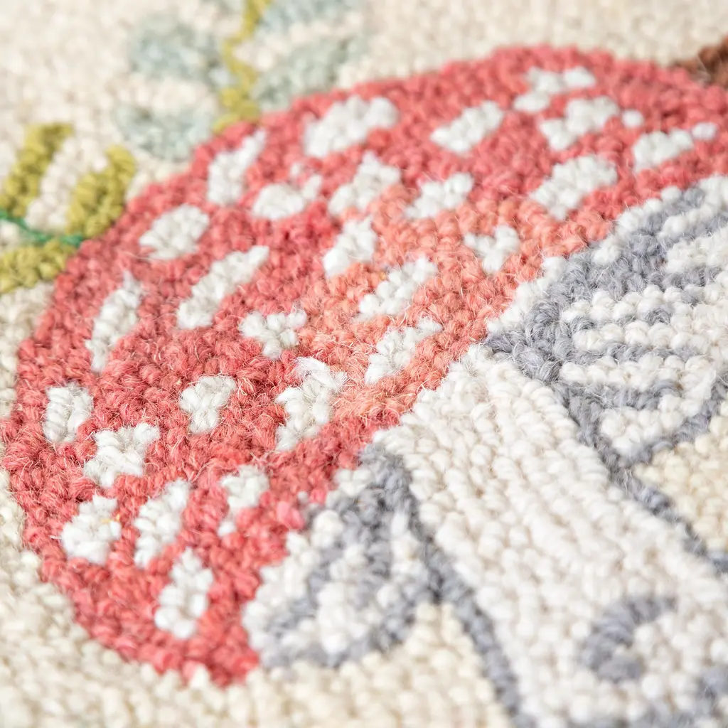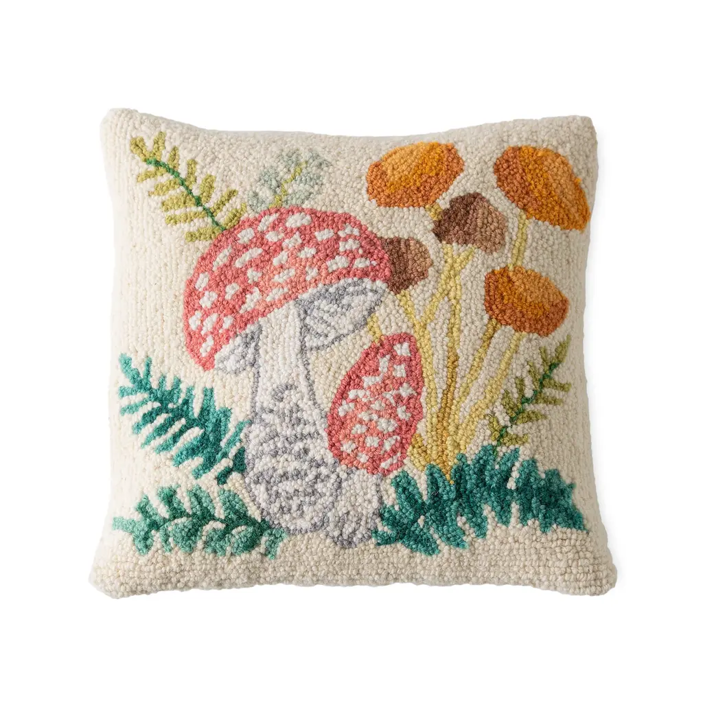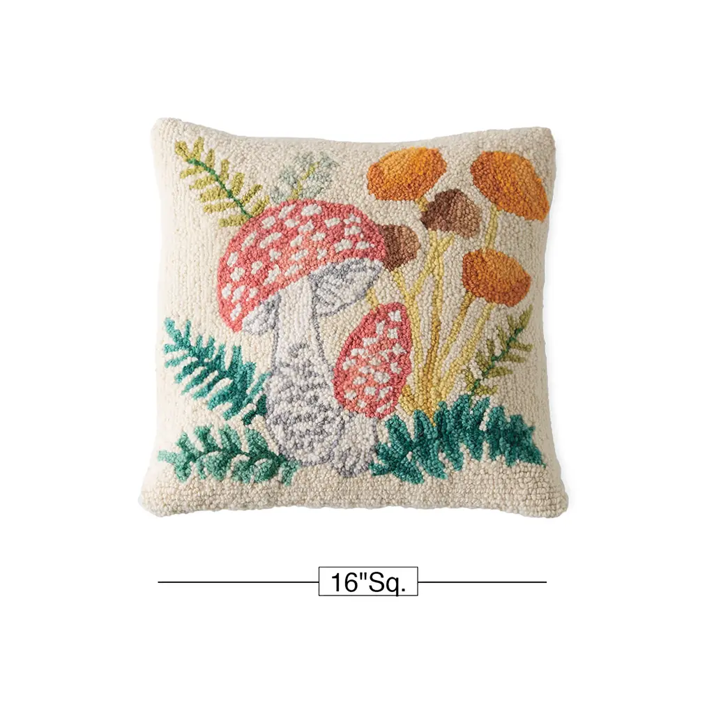 This whimsical throw pillow is hand-hooked with mushrooms in a warm autumnal palette. Shades of gold, green, brown, and orange on an ivory background will fit perfectly in any home decor, from farmhouse to bohemian. The design is rendered in 100% hooked-wool and finished with a cream linen back. Every pillow includes a removable polyester insert for a plush look and soft feel, and the covers zip open and closed for easy removal if needed. Perfect for a season full of bright color and rich texture, these pillows set the scene in any room in your home. Linen backing is composed of 95% ramie/5% cotton.