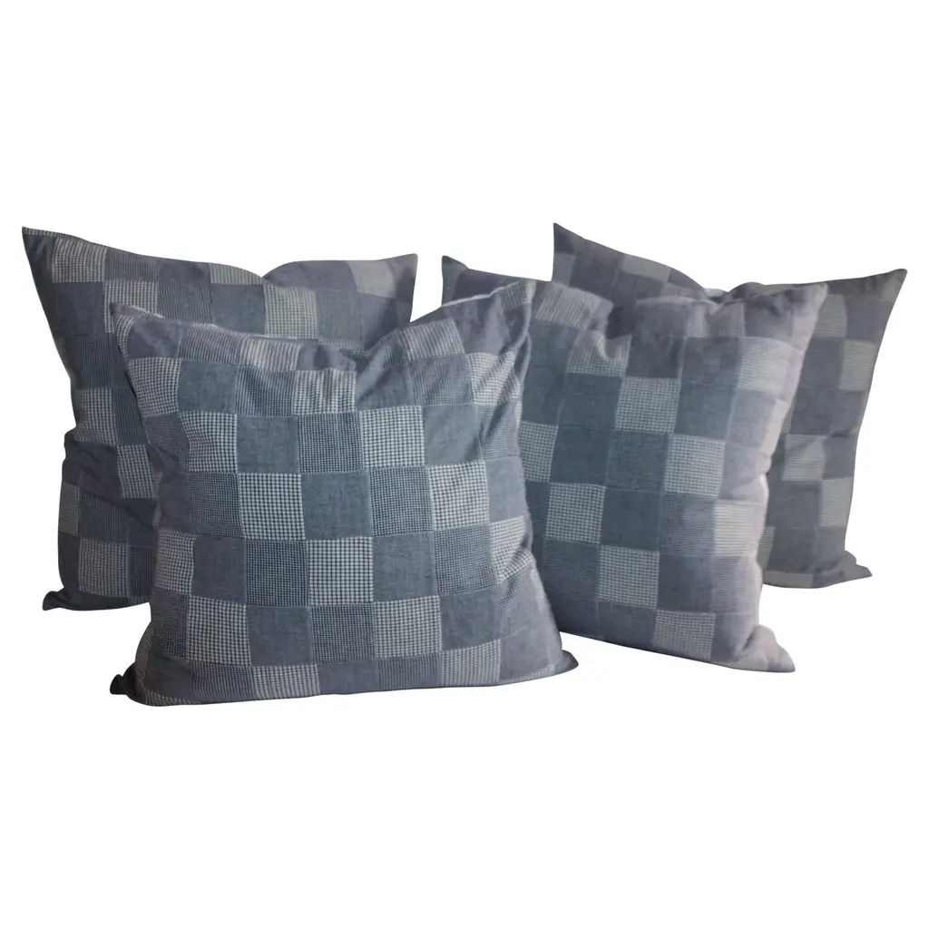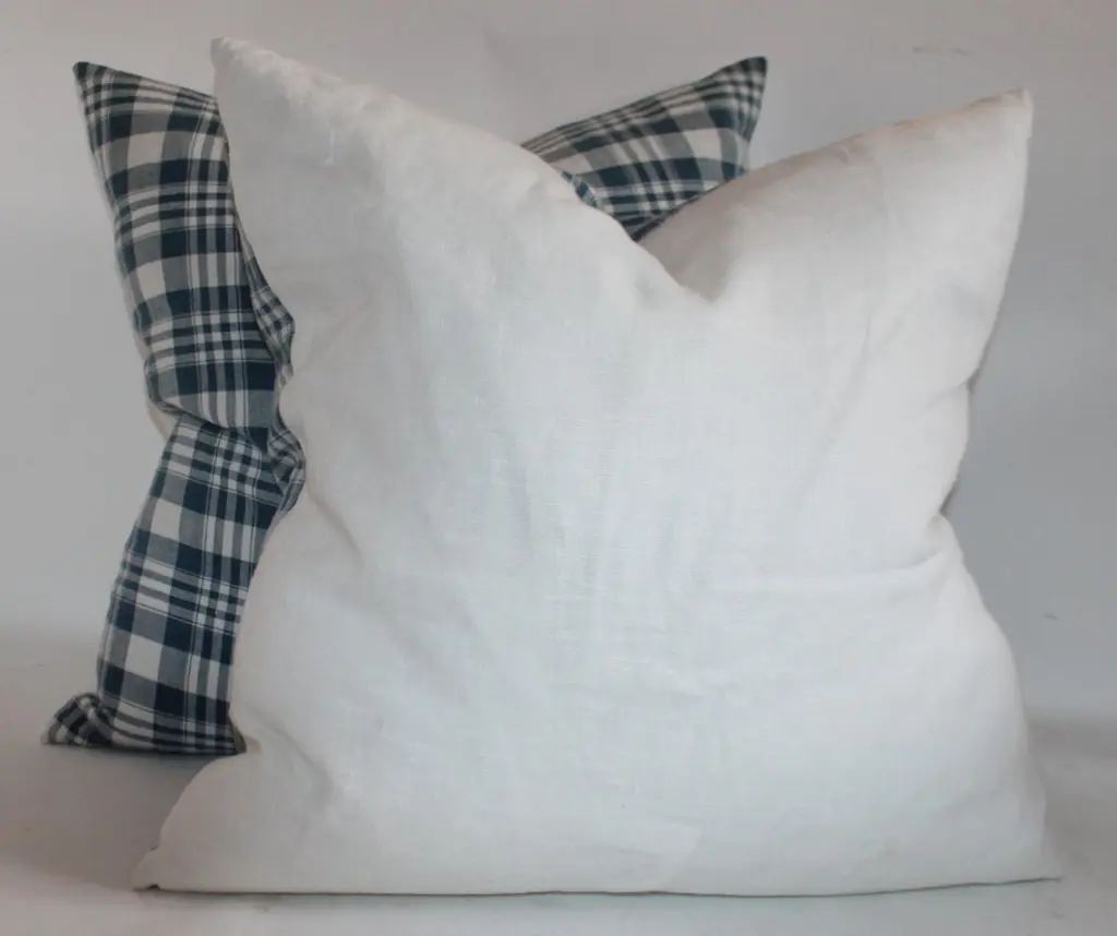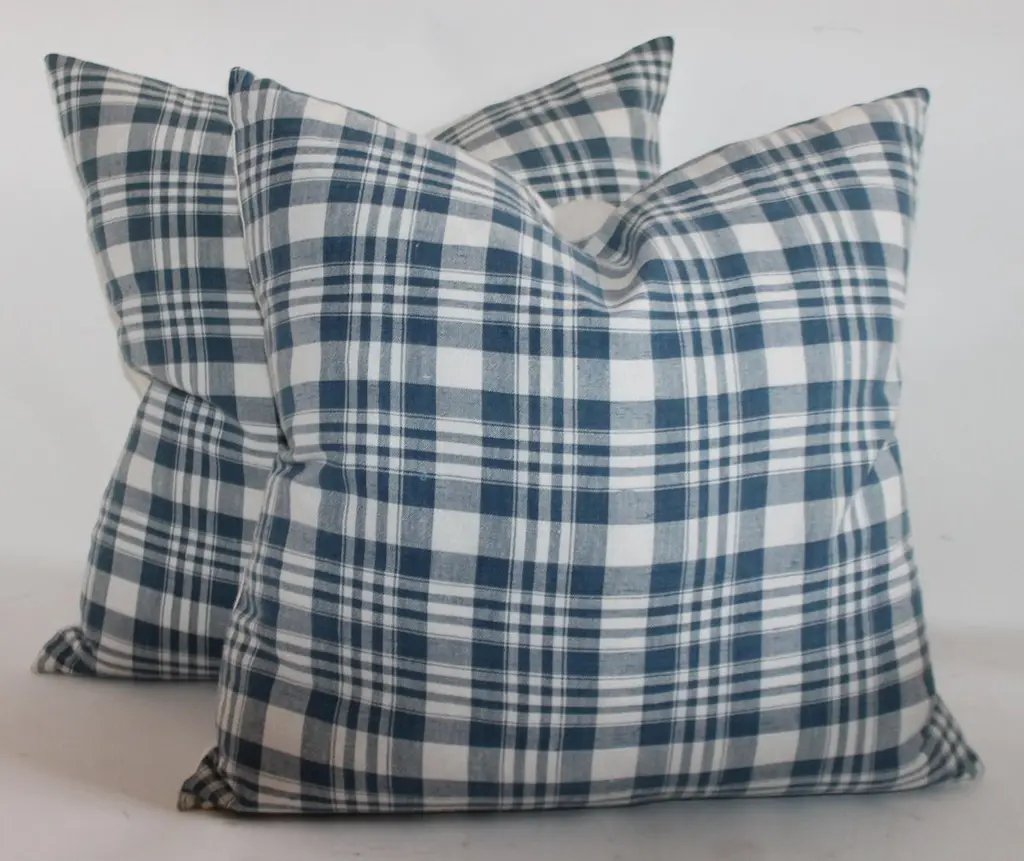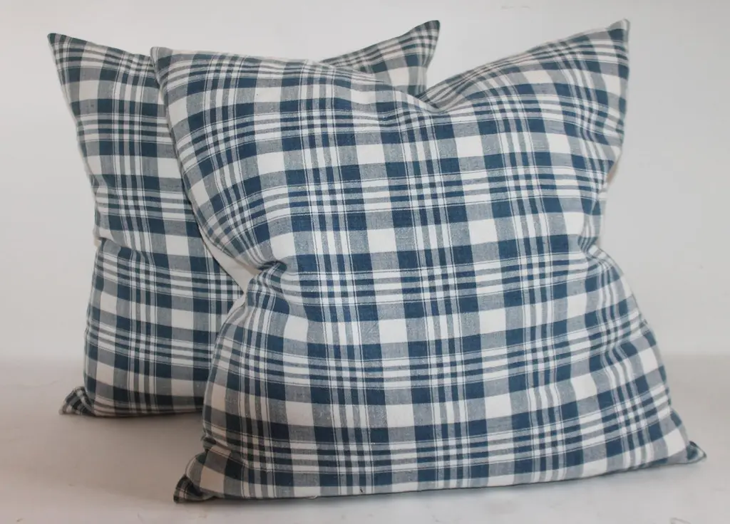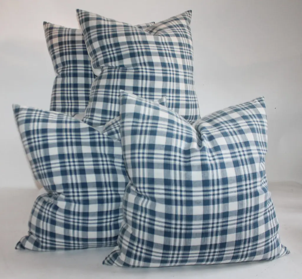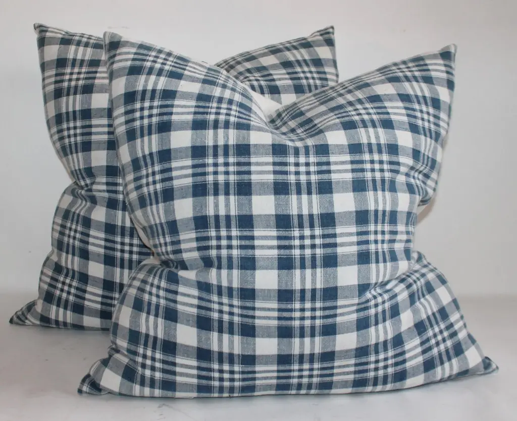 19h century blue & white homespun linen pillows with white linen backing. Down and feather fill inserts.Larger pillows measure: 22 x 22Smaller pillows measure: 20 x 20.