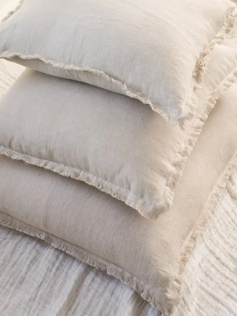 Our Beige Fringe So Soft Linen Pillow is Soo soft- you won’t believe it's linen! This yarn has a slight nub which gives it a beautiful natural texture. Edges have a self-fringe on all sides. Details Front & Back Color: Natural Beige Front & Back side: 100% Linen (washed) Concealed zipper closure on back side. Hand washing or a delicate cycle with like colored fabrics recommended. Hang to Dry. Made in India Pillows are available in 3 options:Pillow Cover Only, with a Down Alternative insert, or with a Down InsertDown Alternative InsertBenefits: Allergen free, Better back support, Retain their shapeInside Fill: 1.2 denier x1.25" polyester gelOuter Shell: 65% polyester/ 35% white cotton blendMade in the USA Down InsertBenefits: Durable, Easy to fluff and re-style, Retains heatInside Fill: 95% gray duck feathers and 5% goose downOuter Shell: 233-thread count 100% cotton fabric Made in the USA