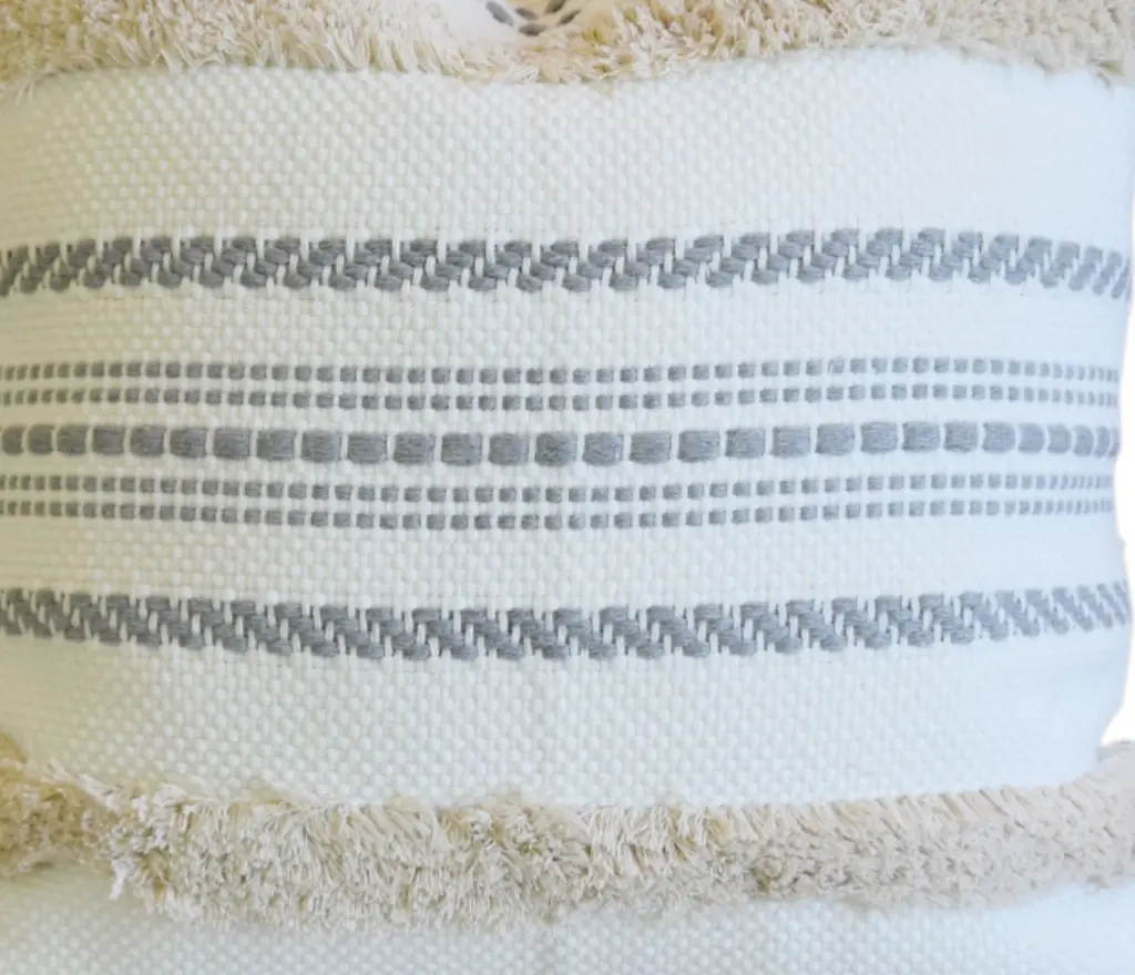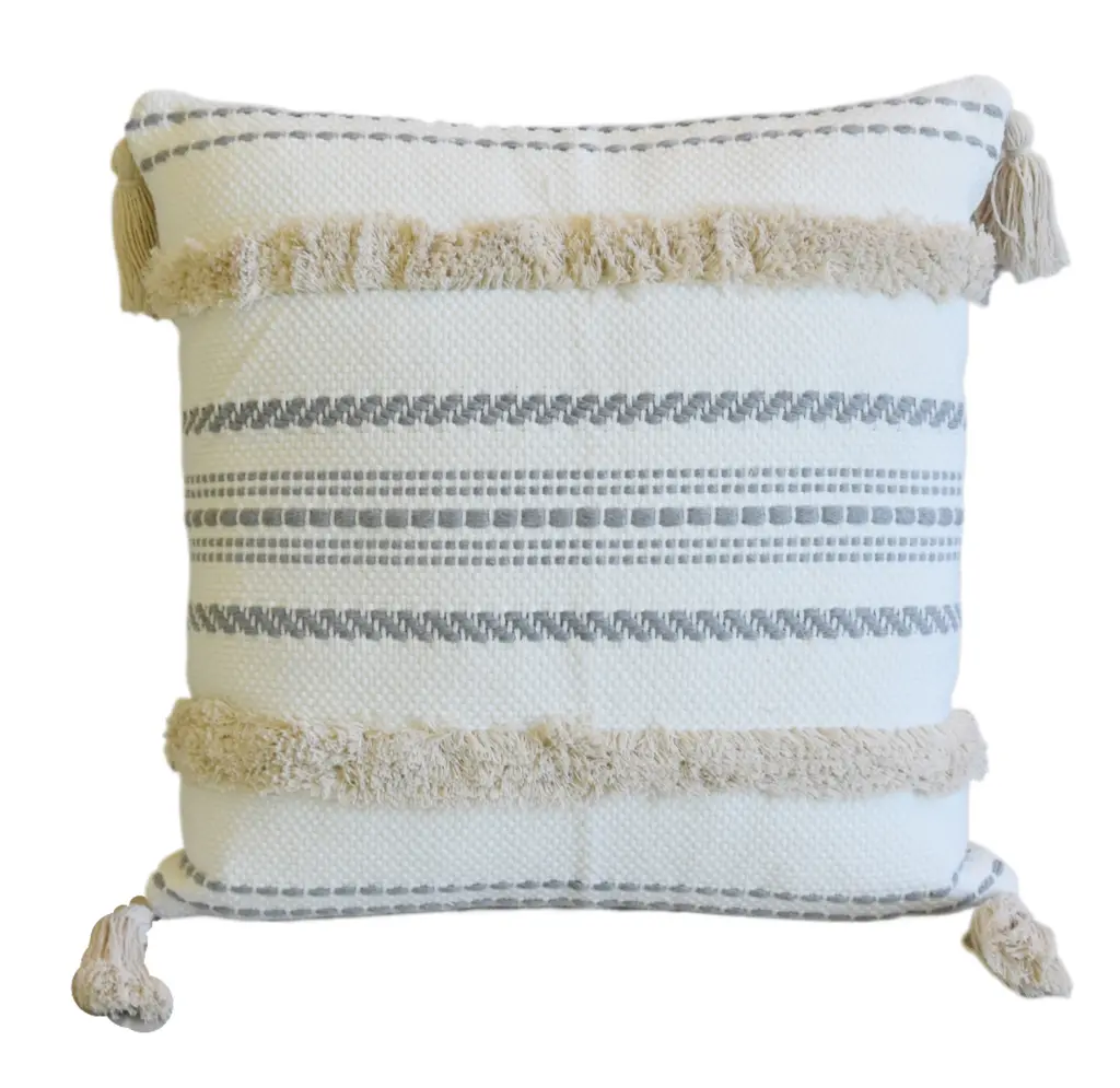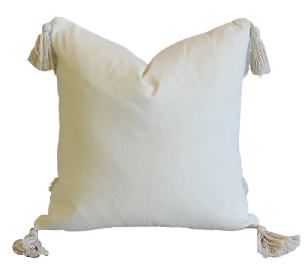 Custom-tailored pillow in a textured woven and tufted cotton fabric depicting a beautiful nautical beach design accented with tassels on each corner. Cream colored cotton fabric on the reverse. Hidden zipper closure. Plump generous goose down-and-feather insert. Excellent new unused condition!!