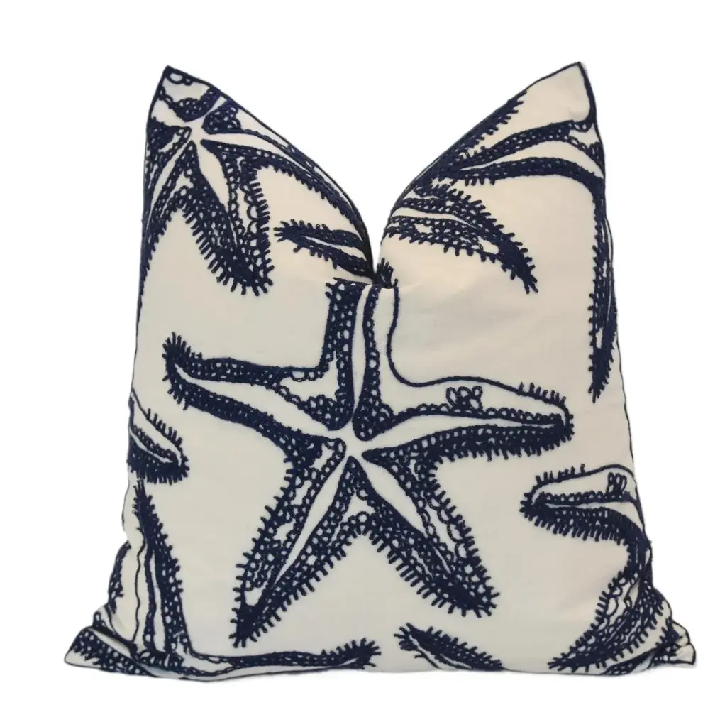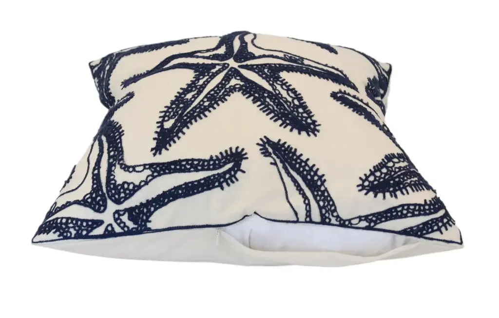 Custom-tailored designer pillow in a cotton woven crewel-style fabric depicting a nautical coastal blue starfish shell design. Complementary off-white cotton fabric on the reverse. Hidden zipper closure. Generous plump goose feather-and-down insert. Excellent new, unused beautiful condition!!!! ***PLEASE NOTE: I will combine shipping whenever possible if you purchase multiple items from my shop. Warm regards, Mike Seratt ***Also don't forget to take a peek at my other current listings...you just might find something you can't live without!!! It's easy just click on my name to the right of any listing highlighted in black "Mike Seratt of The Prized Pig" and presto it will bring you to my storefront!!! Cheers!!! Mike Seratt I SHIP OUT IMMEDIATELY, SO THE ESTIMATION YOU SEE FOR THE DELIVERY TIMELINE IS CHAIRISH'S OVERALL GENERAL TIMELINE, BUT I WILL GET THIS OUT THE NEXT DAY AND DELIVERY IS USUALLY 5-7 DAYS AT MOST
