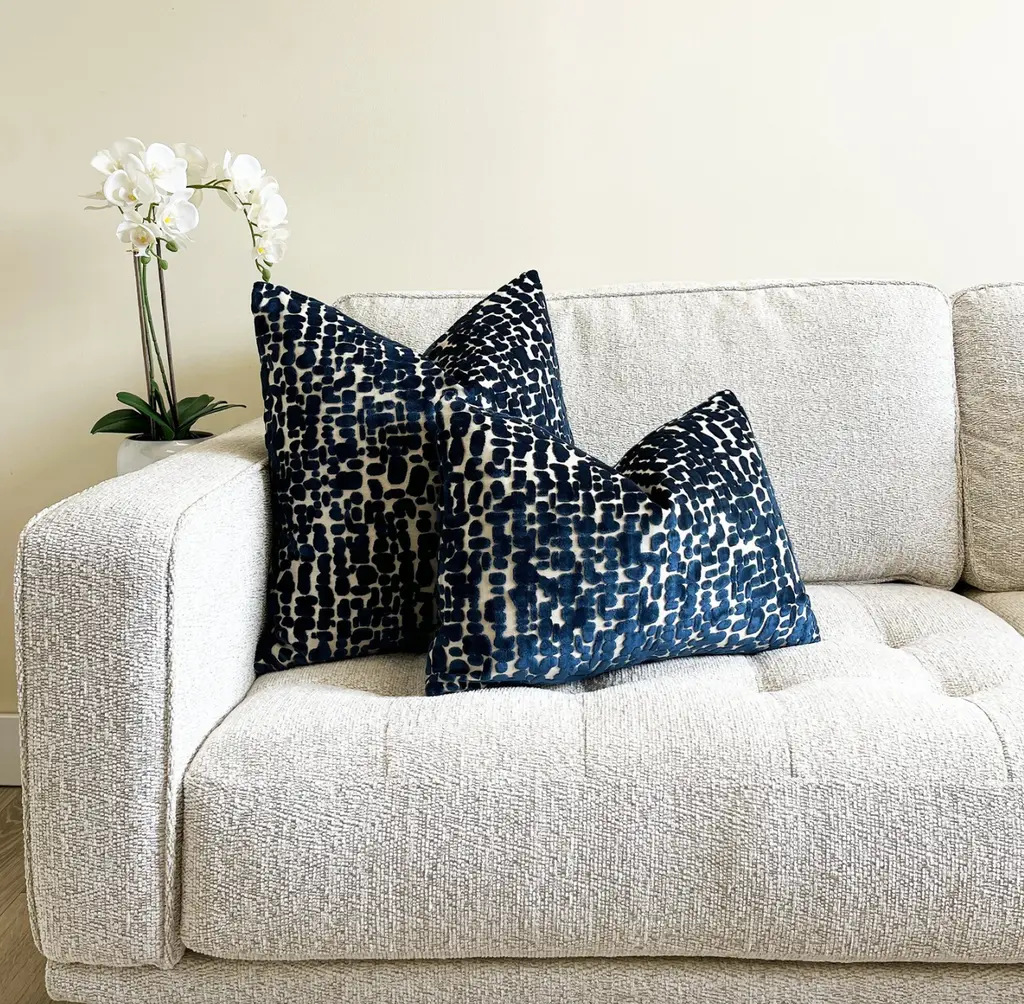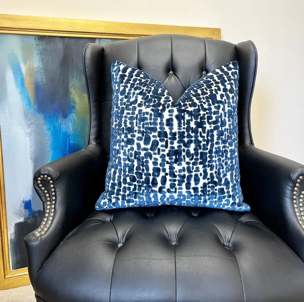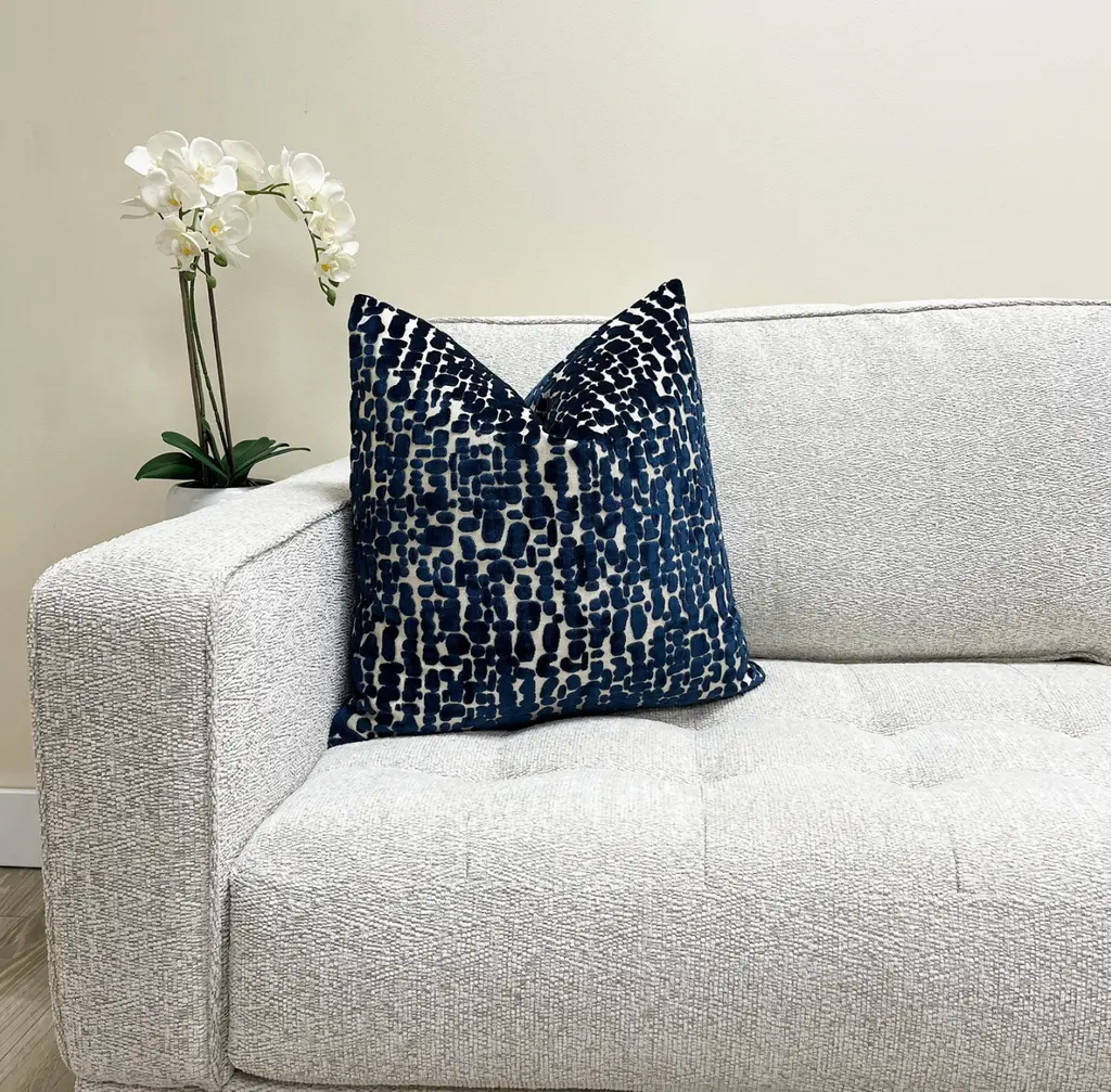 Give your space a luxurious feel with this navy cut velvet on a light gold background pillow. It is made with a durable designer fabric with a soft sheen finish. This decorative pillow cover works well with many shades and other prints. It is truly versatile. Each pillow cover is handcrafted with a durable designer fabric that has a soft sheen finish. This decorative pillow cover compliments many other shades and prints. For easy stuffing and cleaning, each pillow cover is equipped with a matching invisible nylon zipper enclosure at the bottom. All pillow covers are tapered at the corners to prevent dog ears. When stuffed your pillow will be a perfect square. This pillow comes stuffed with a Feather down insert. Fabric: Velvet Stuffing: 95/5 Feather Down Insert Care: Dry Clean Closure: Nylon zipper closure Made to order Will ship within 5 business days