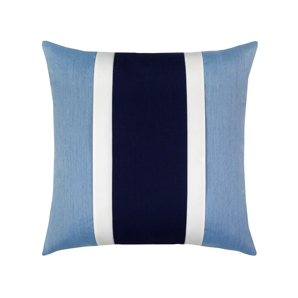 The Nevis pillow offers a contemporary, color blocked design in a classic blue and white palette. It features soft, cast ocean side pieces and a center panel in deep navy, set off with natural binding, giving it dimension and texture. Features