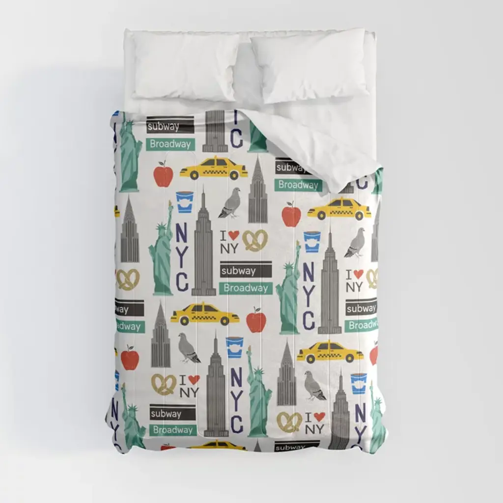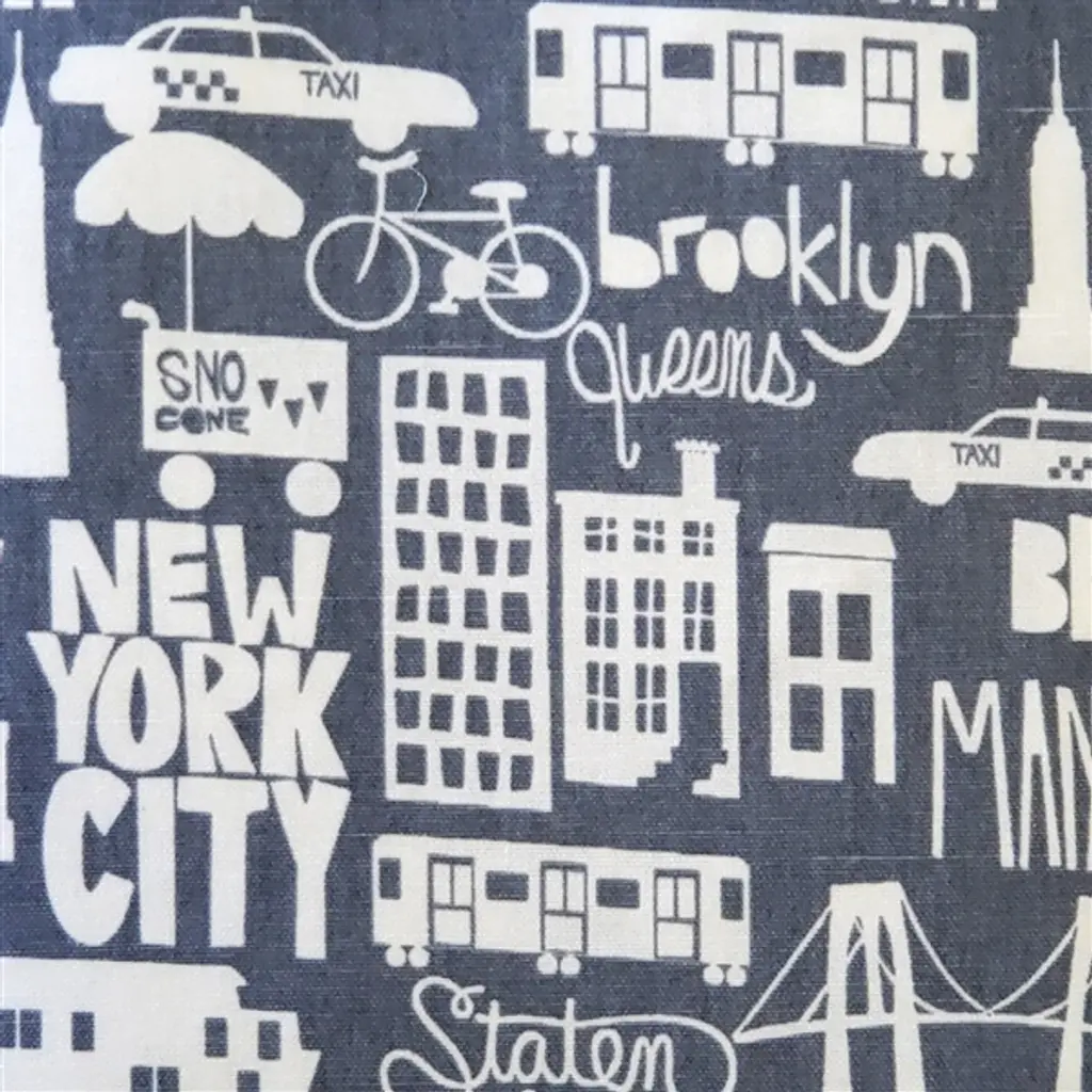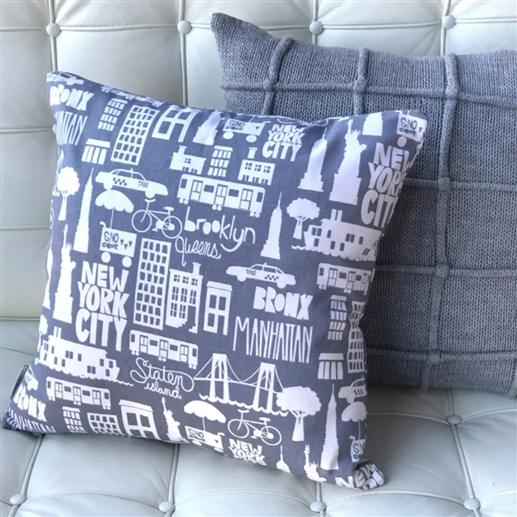 Whether you refer to New York as the City That Never Sleeps, Fun City or the Capital of the World, this New York City throw pillow captures it all. Printed in dark gray on a sturdy off-white cotton fabric, this 17" square pillow includes iconic New York images mingled with the names of the best know New York boroughs. Take a bite out of the Big Apple with this fun New York pillow! Size: 17"x17" Square Fabric: 100% Cotton Same front and back Knife edge seams Hidden zipper closure Cold water wash by hand, air dry Made in Canada: Designed and made in Pillow Decor's Vancouver workroom.