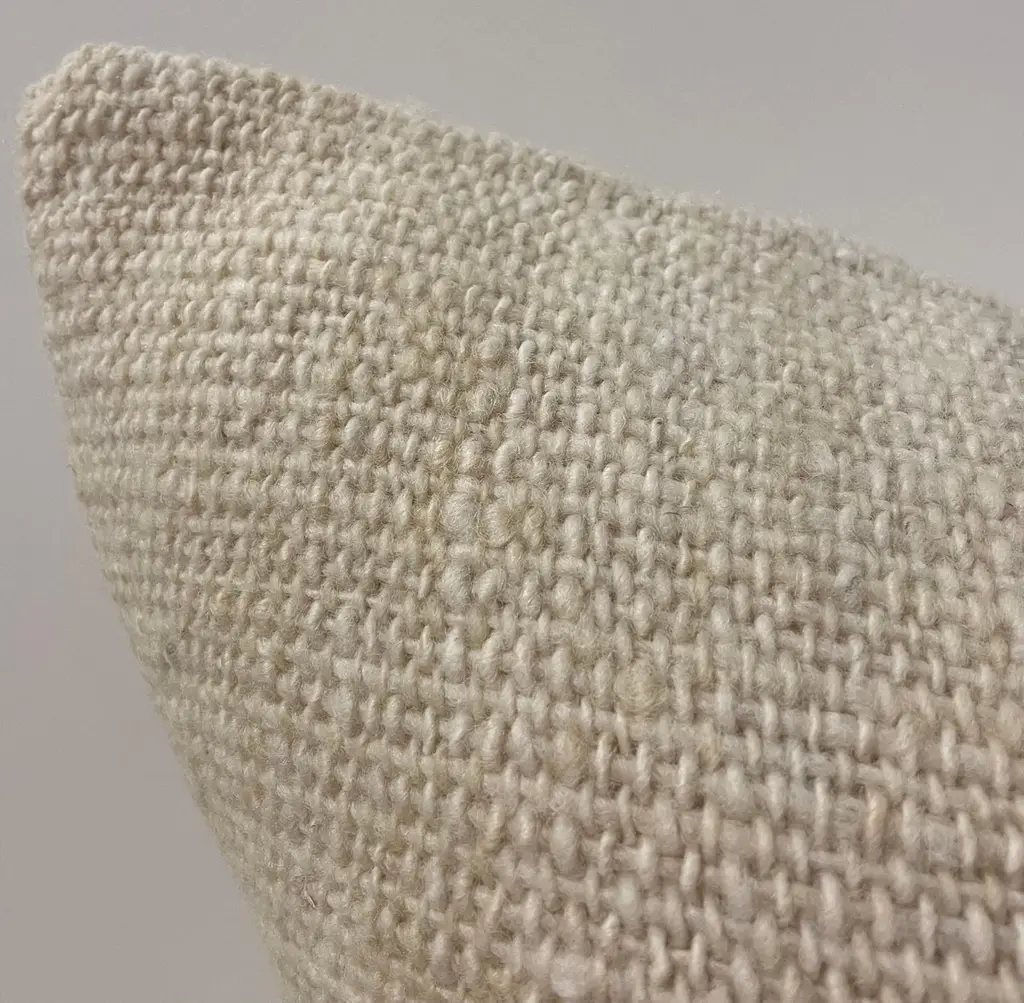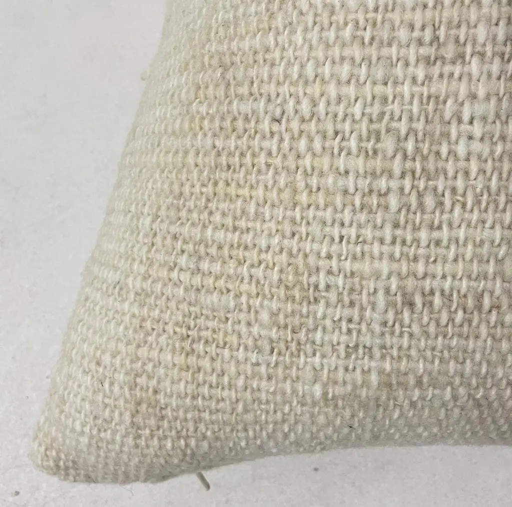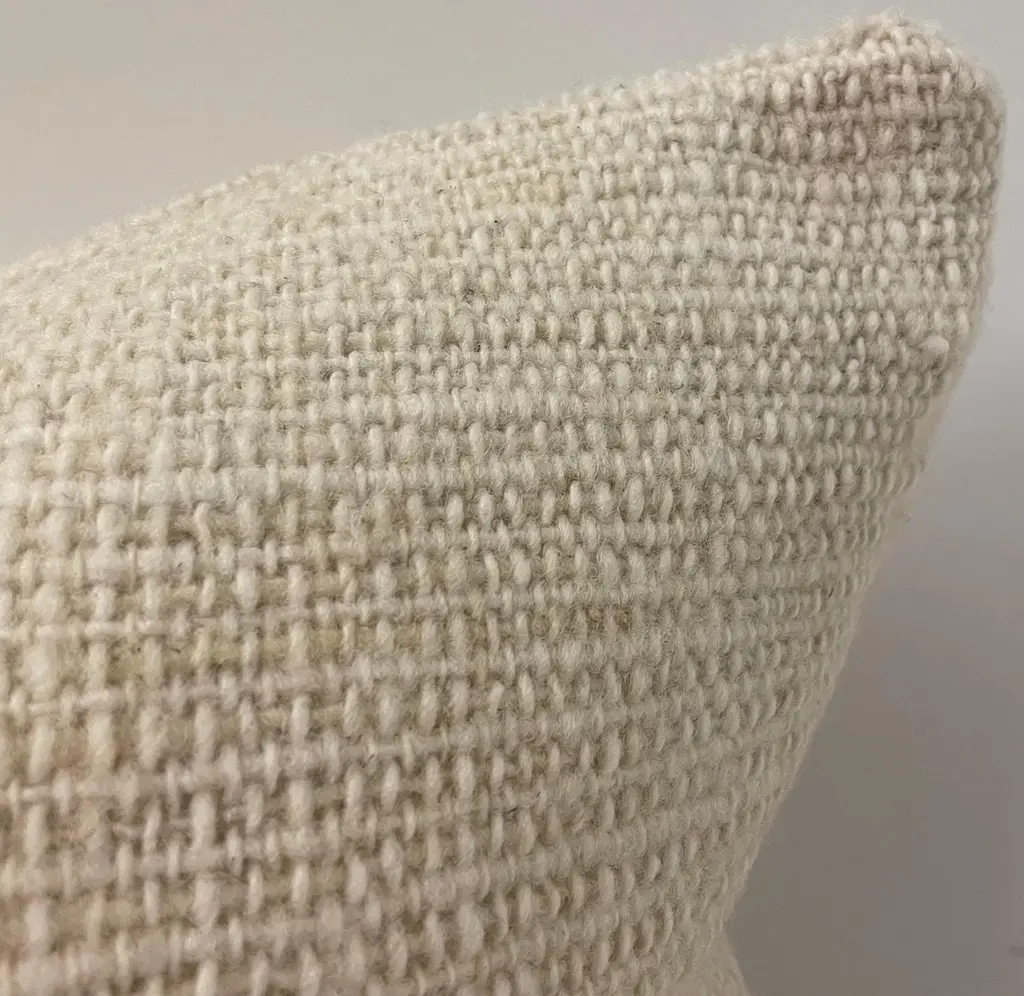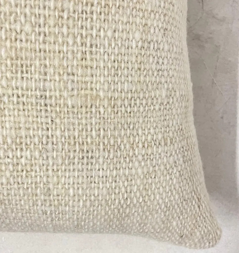 Nikko custom hand made pillow with stitched detailsColor: Undyed (natural ecru) with dark brown stitchingHidden Zipper closure. Large wood yarns woven to create a beautiful texture. Wool, Alpaca, semi soft to the touch. Dry clean or spot clean recommended.Size: 24” x 24” Includes insert.
