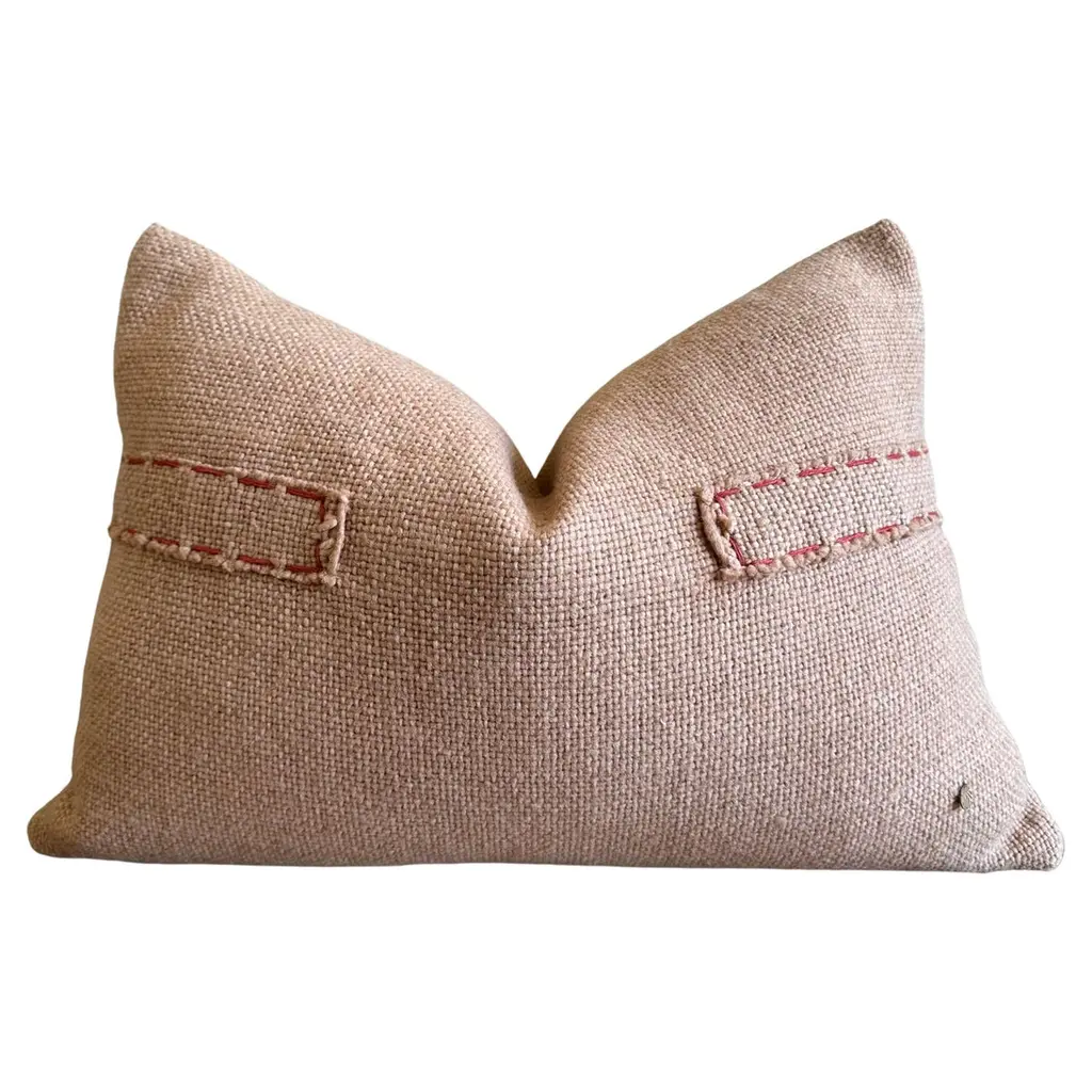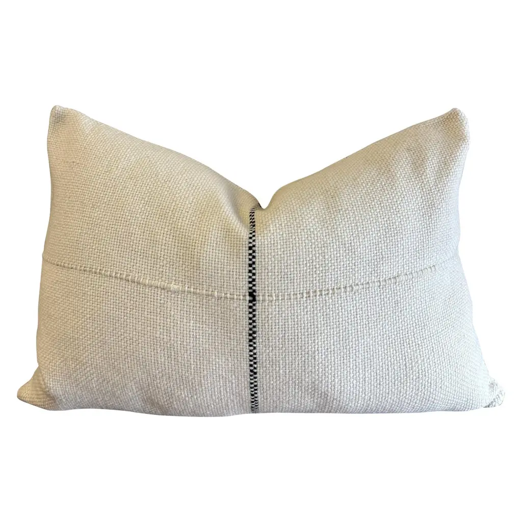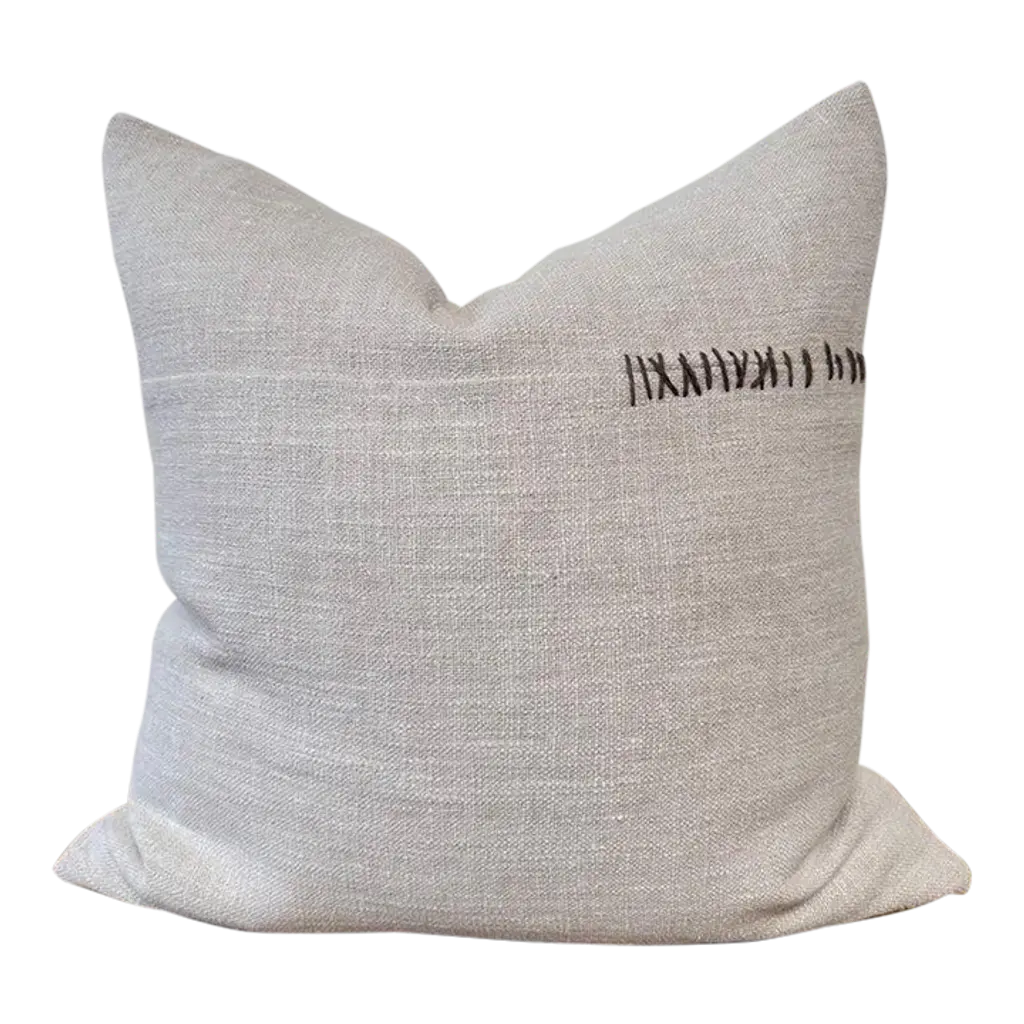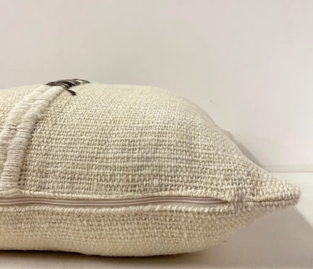 Nikko custom hand made pillow with stitched detailsColor: Undyed (natural ecru) with dark brown stitchingHidden Zipper closure. Large wood yarns woven to create a beautiful texture. Wool, Alpaca, semi soft to the touch. Dry clean or spot clean recommended.Size: 24” x 24” Includes insert.