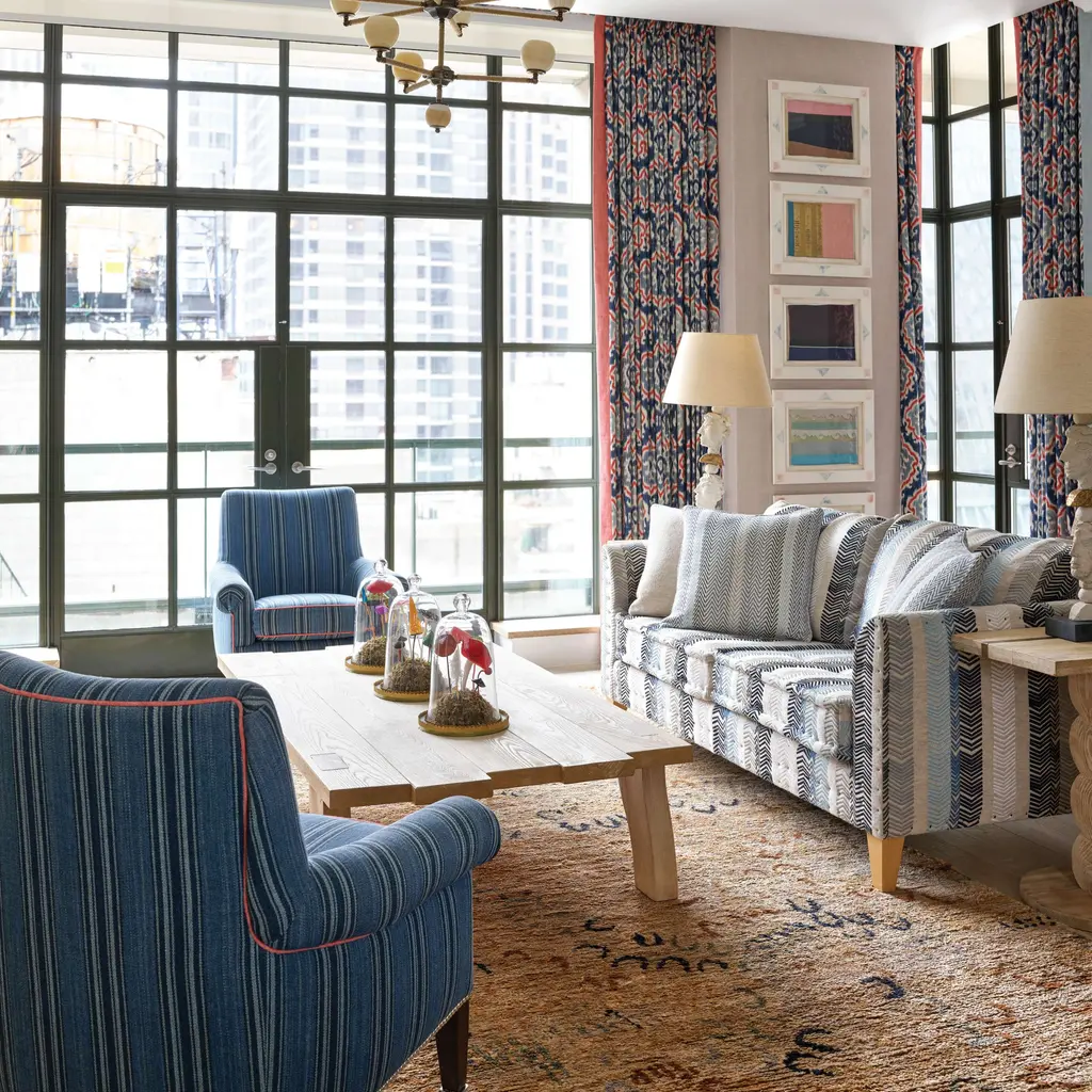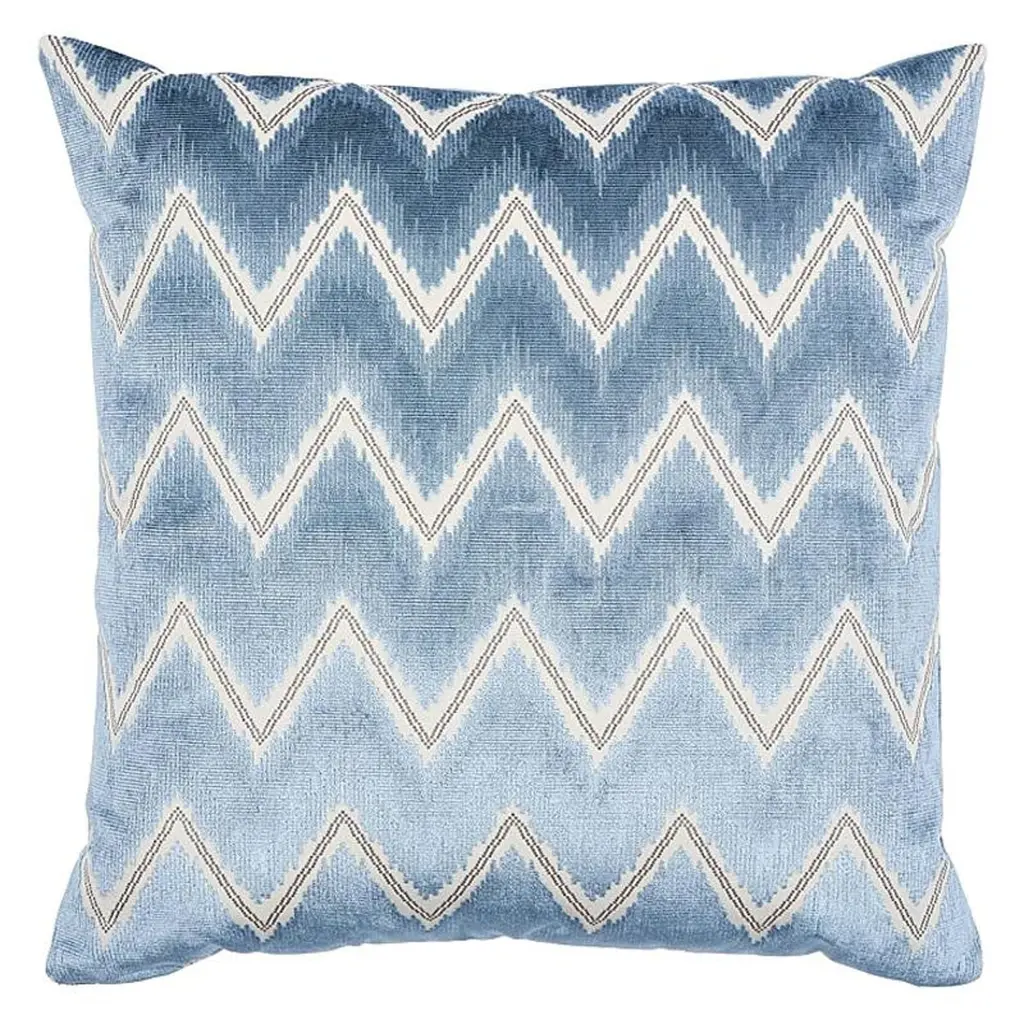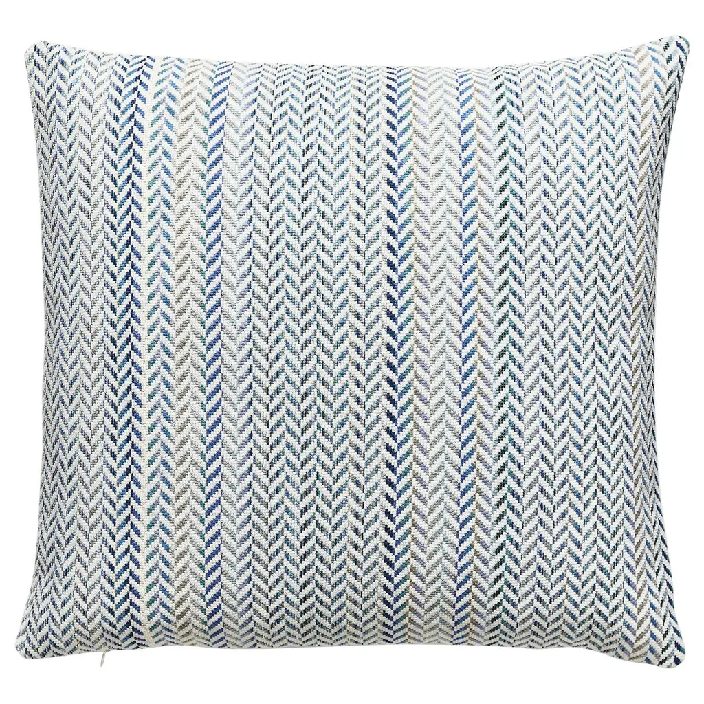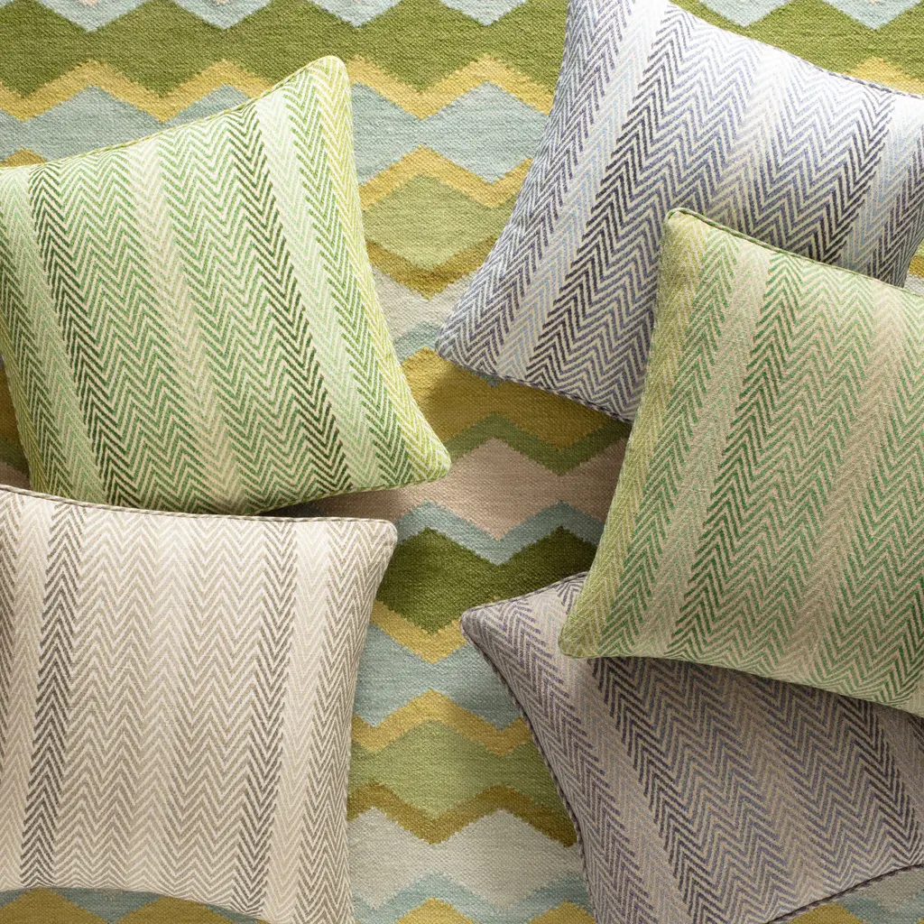 Fresh rik-rak chevron stripes in variegated shades are a dandy, tailored nod to a more staunch herringbone inspiration. The menswear suiting fabric is wittily re-imagined in this linen pillow by Kit Kemp, co-owner and Creative Director for Firmdale Hotels, whose style is defined by a reverence for artisans and a disdain for the rules. Digitally printed to fully capture the ombréed colors and marled effects of the original weaving. One of the modern creations from the design collaboration between Annie and Kit, united by their passion for colorful and carefree design.