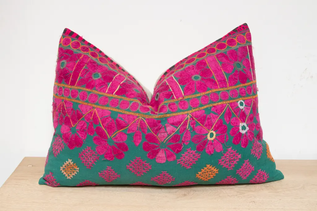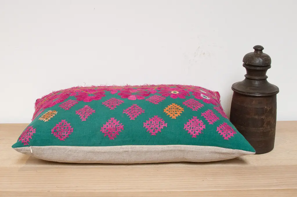 A lovely hand-embroidered pillow made from vibrant vintage tribal skirts coupled with a new linen back. This intricate lace-like and floral embroidered cotton pillow is the perfect splash of color to add to any space. This throw pillow has a hidden zipper and comes filled with a down-blend insert. For care and maintenance, remove the insert and dry clean only.