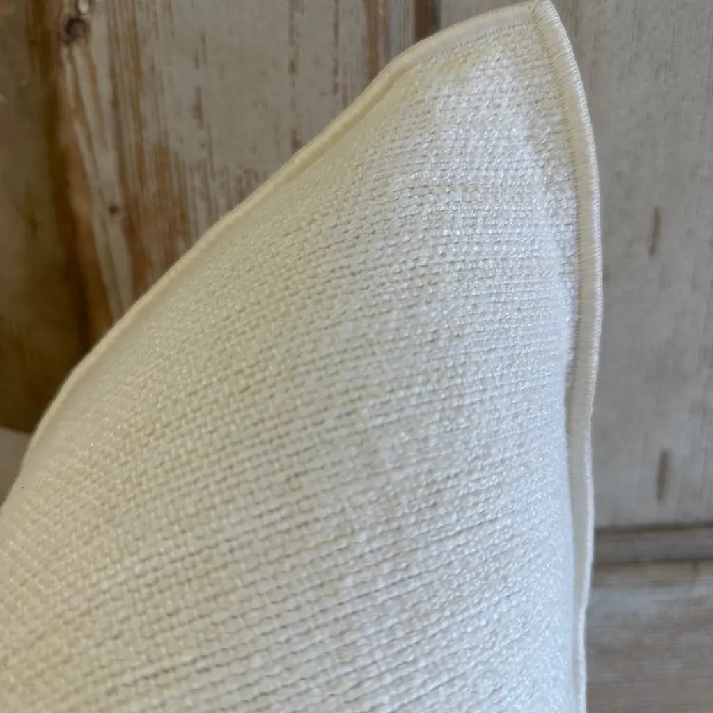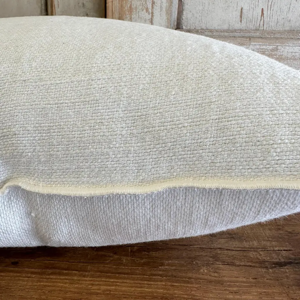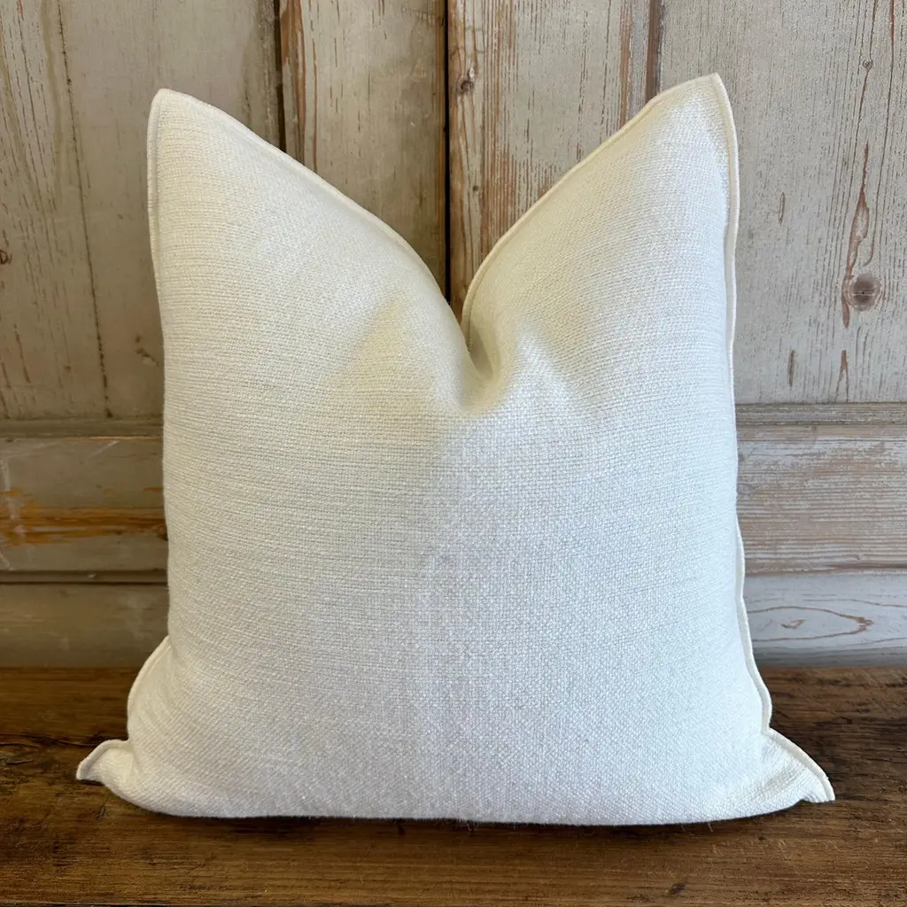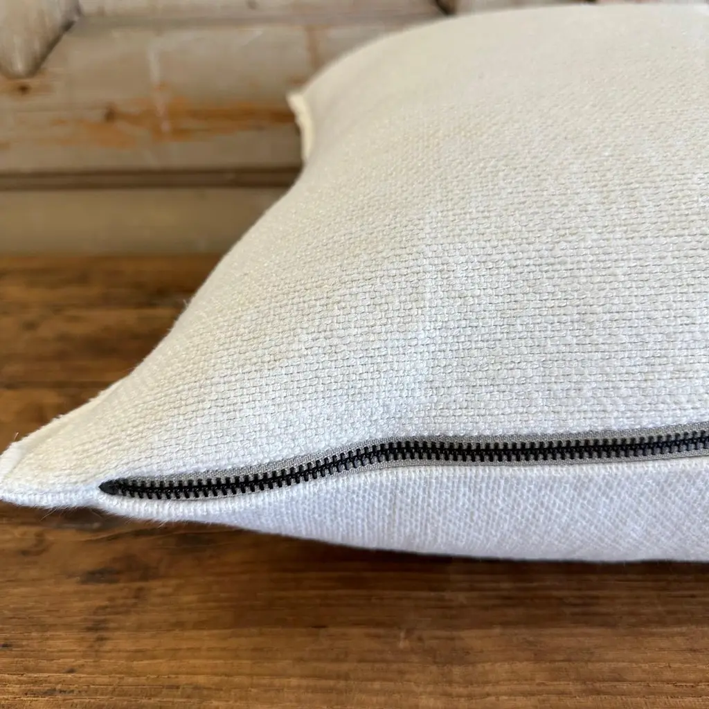 Nomade: Custom linen blend accent pillow. Color: WhiteA pretty oystery white color (not optic white)Includes insertTexture: nubby style pillow with a stitched edge, metal zipper closure. Our pillows are constructed with vintage one of a kind textiles from around the globe. Carefully constructed with the finest textiles, with hidden zipper closure, and overlocked seams. Limited quantities available. If this item is on backorder, please allow 6-8 weeks for production.