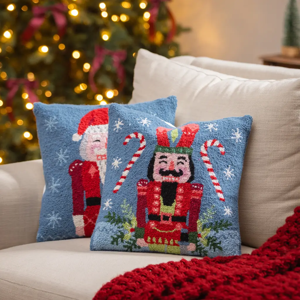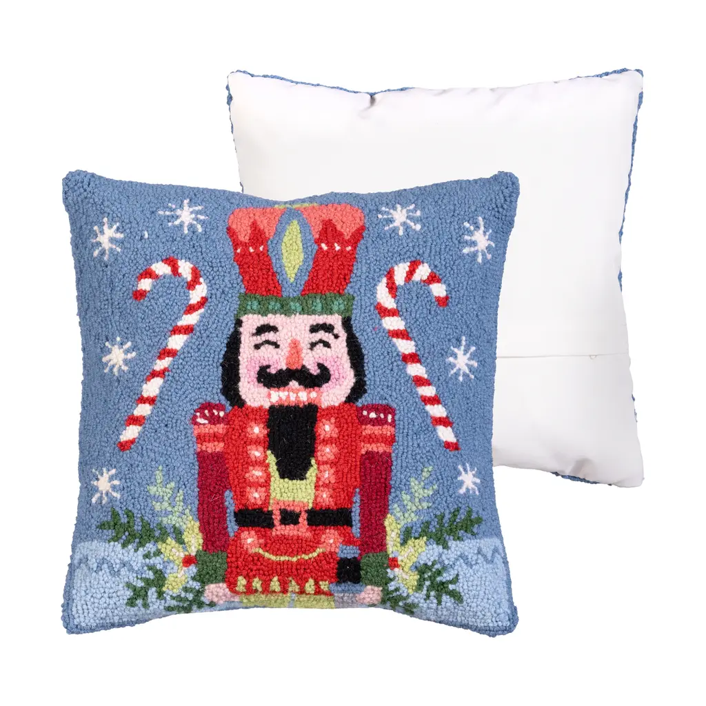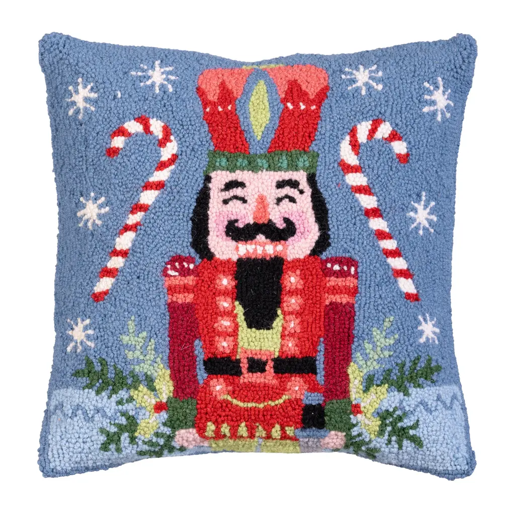 Bring holiday cheer to your home with our Hooked Nutcracker Throw Pillow!This charming holiday accent features a delightfully whimsical nutcracker dressed in classic red with a holly leaves in hand, all set against a snowy blue backdrop with candy canes. Made with traditional hand-hooked craftsmanship, the textured poly-blend front offers cozy charm and heirloom quality that celebrates the magic of the season.Perfect for a sofa, armchair, or guest bed, this pillow adds a nostalgic and playful touch to your Christmas décor.