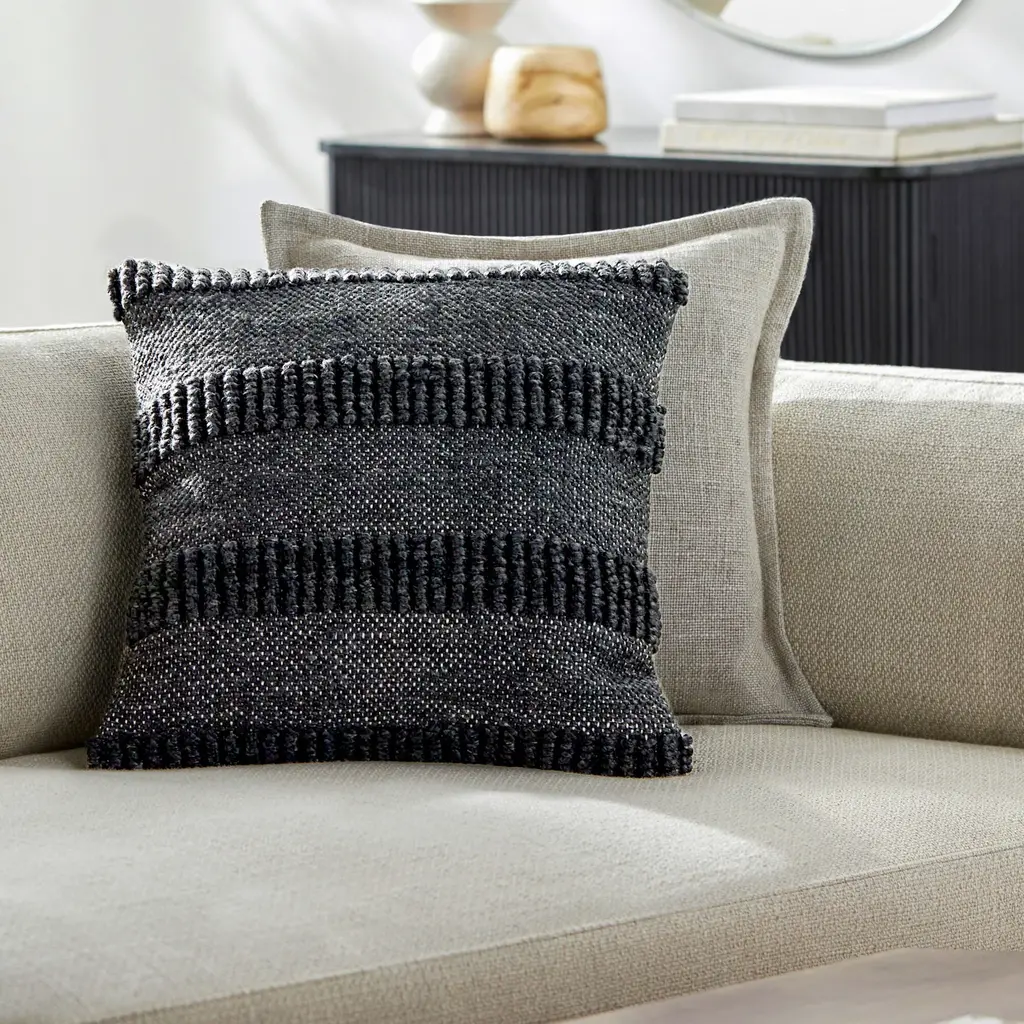 The Nysa Pillow from Surya combines modern style with sustainability, for a soft, luxurious feel. Handcrafted in India from recycled PET yarn and polyester, its sophisticated design adds texture and depth to any living room or bedroom. Easy to care for, this pillow is machine washable, ensuring it stays fresh and vibrant. Elevate your home decor with the elegant and eco-friendly Nysa Accent Pillow. Highlights