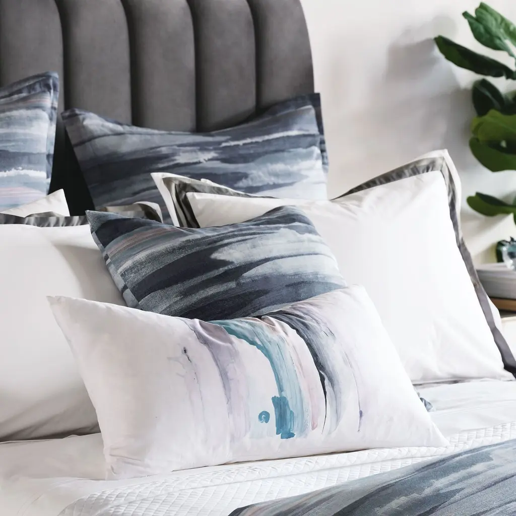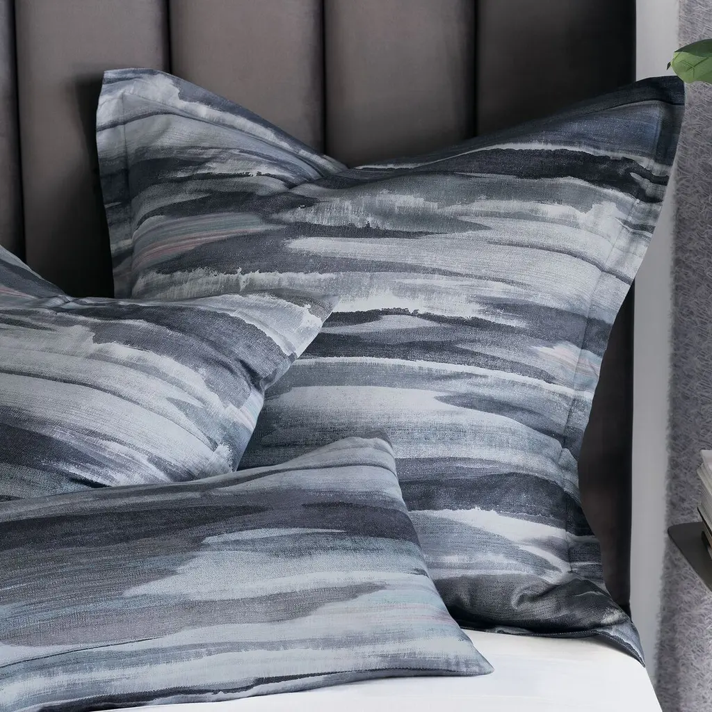 Abstract euro sham in 100% cotton sateen with a 300 thread count. Self-backed in coordinating fabric. Knife edge finish. Invisible zipper closure. Pillow insert included. Machine wash in warm water. Tumble dry low. Warm iron.