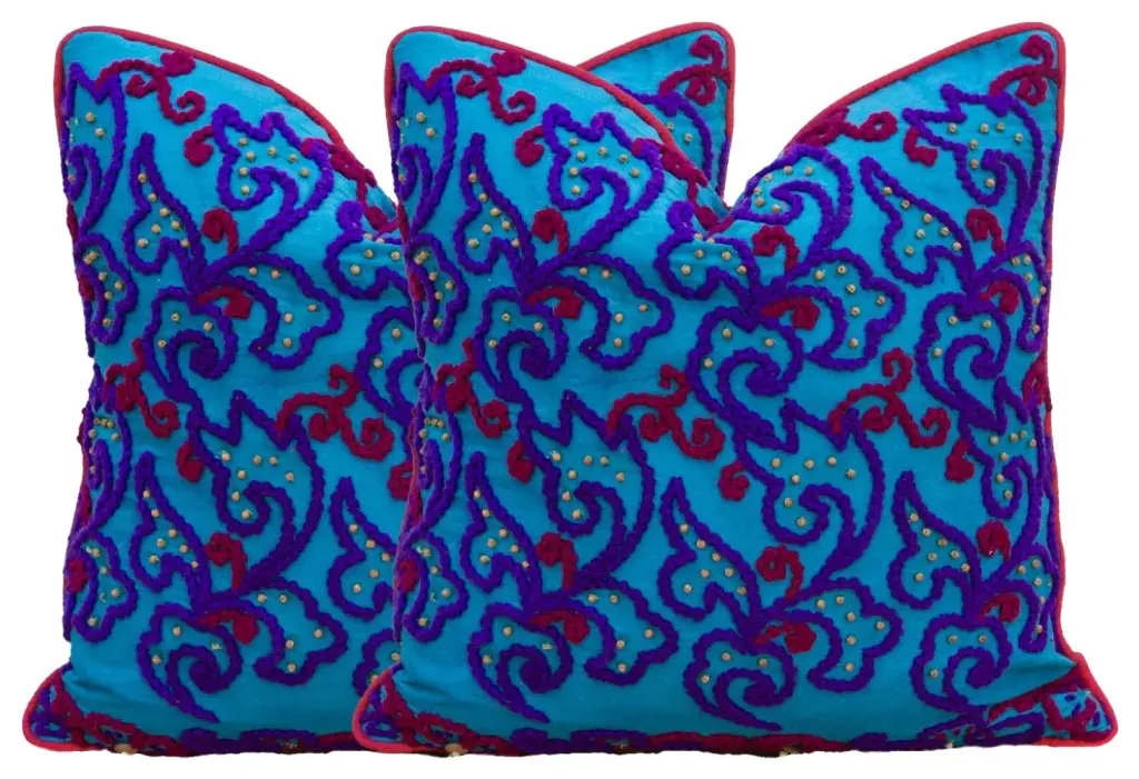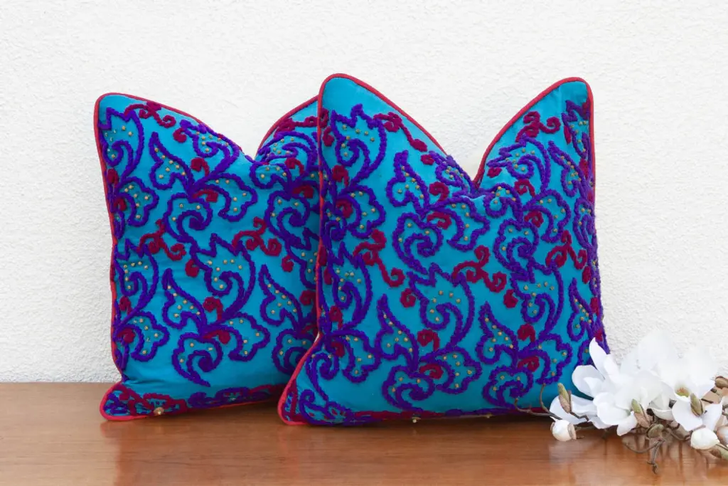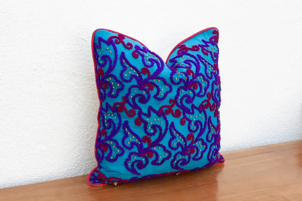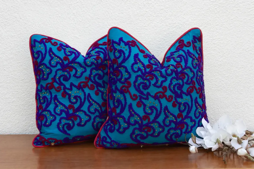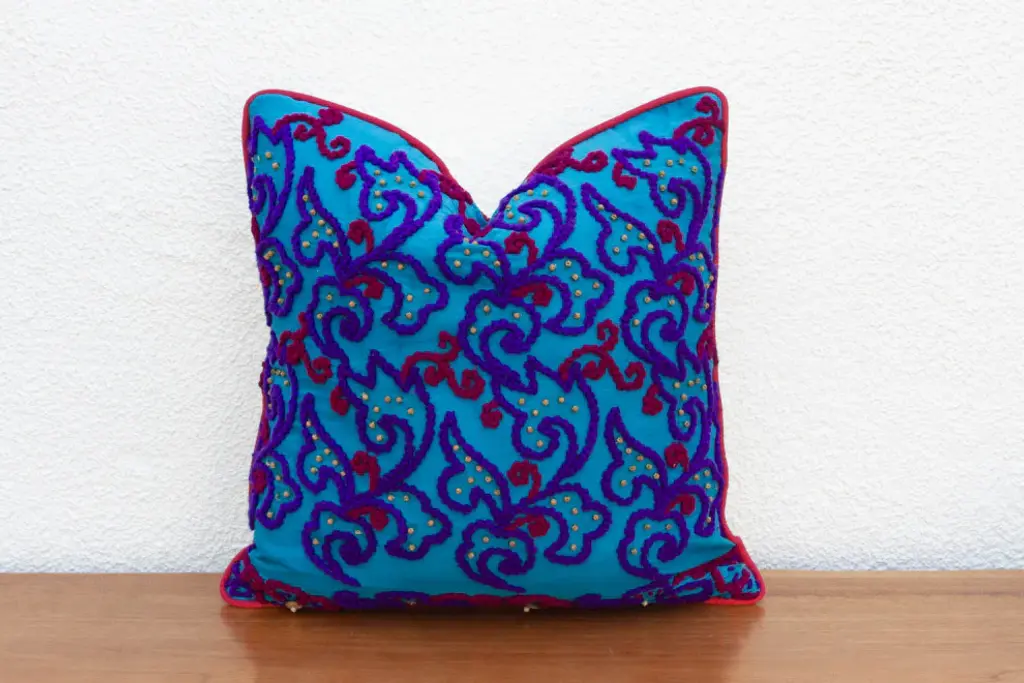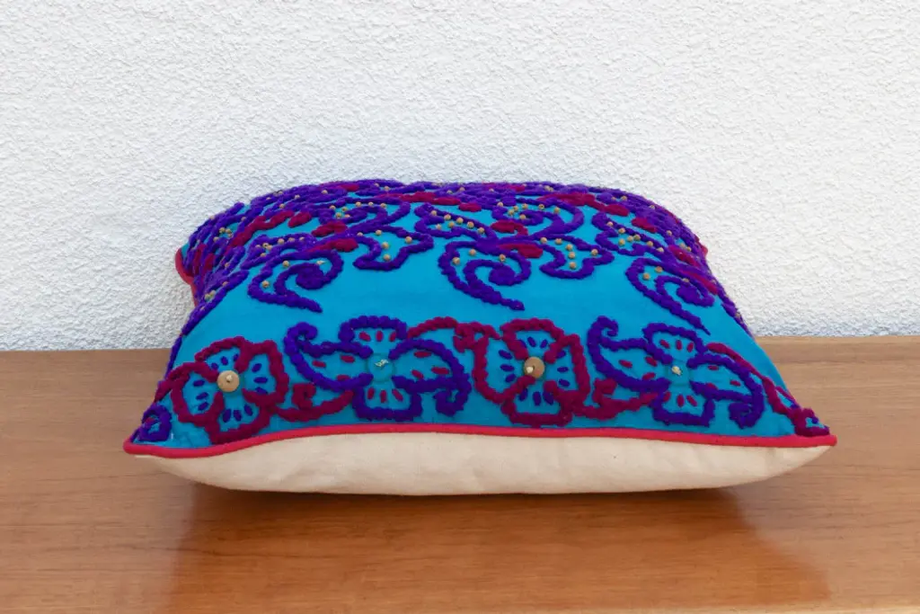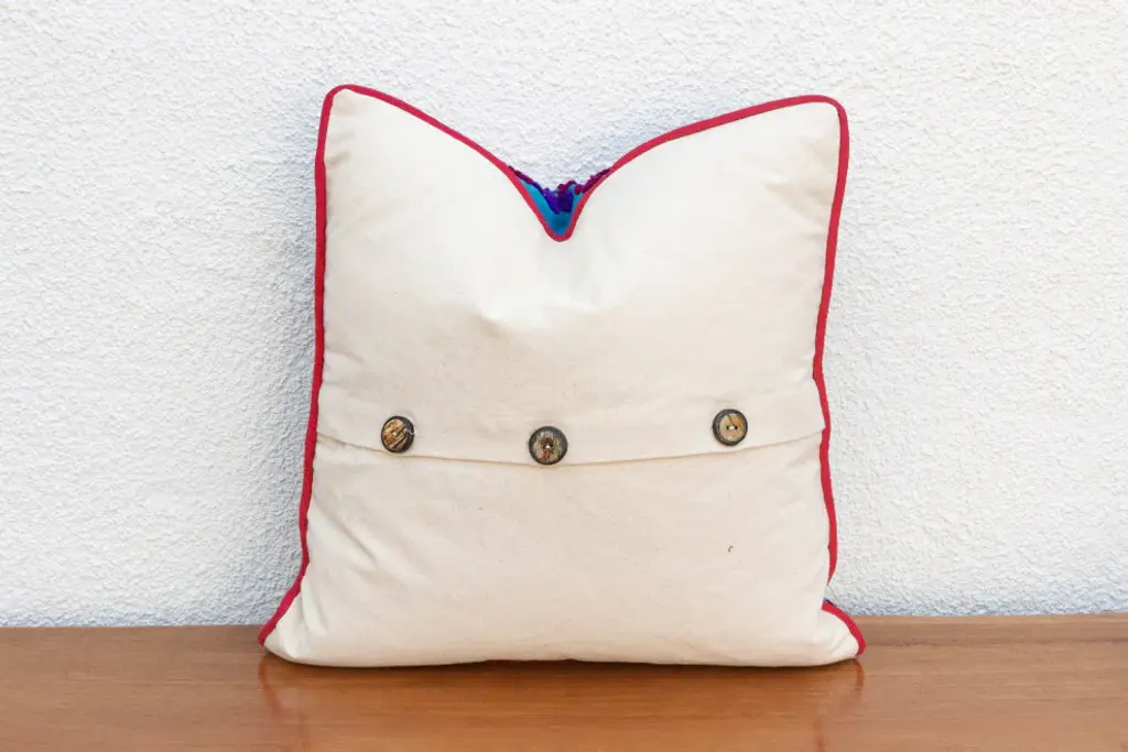 A lovely hand-embroidered pillow made from vibrant vintage tribal skirts coupled with a new cotton canvas back. This intricate lace-like embroidered cotton pillow is the perfect splash of color to add to any space. This throw pillow has wooden buttons and comes filled with a down-blend insert. For care and maintenance, remove the insert and dry clean only. Pillow insert included.