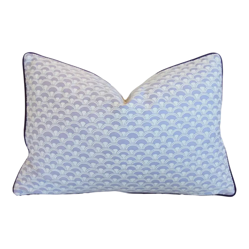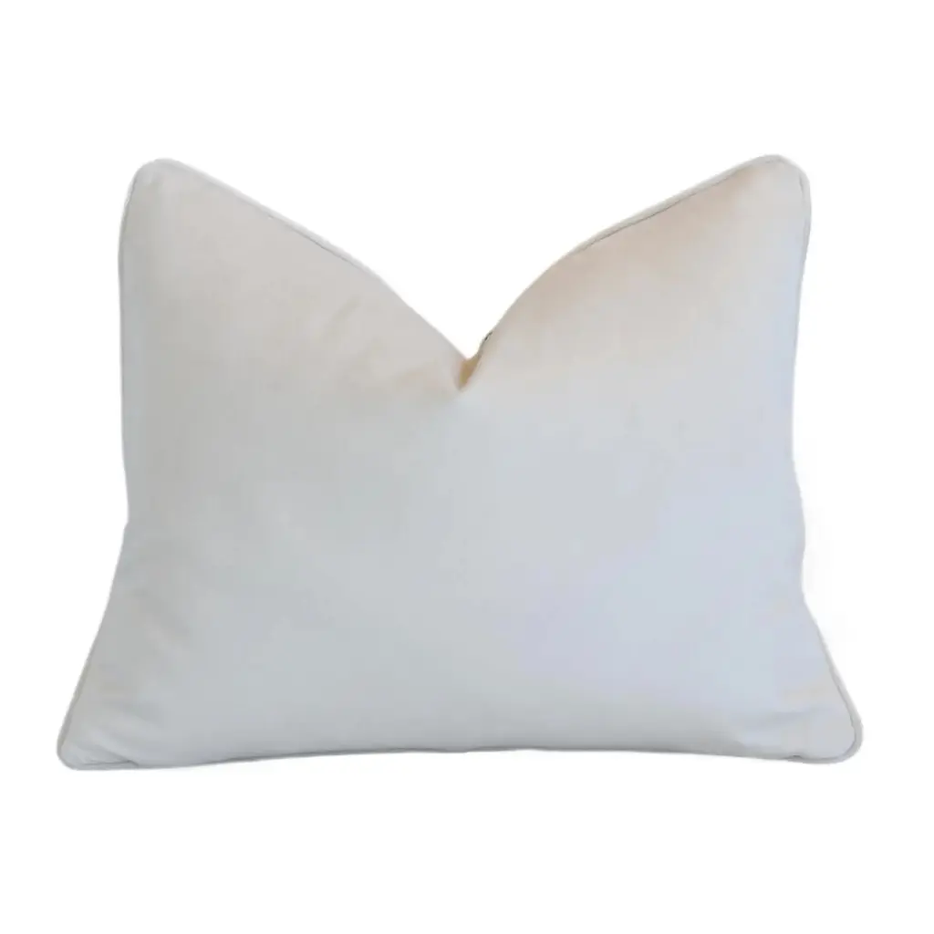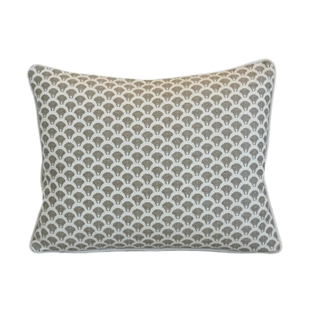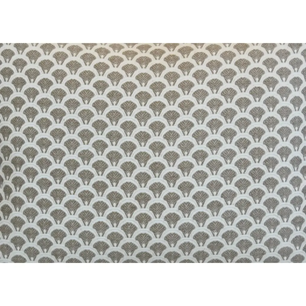Custom-tailored pillow by Mike Seratt of The Prized Pig in designer Old World Weavers cotton fabric in a creamy white and taupe coloway. The design is wonderful woven natural clamshell seashell design. Cream cotton-velvet fabric back. Custom cord piping trim. Invisible zipper closure. Plump generous plump goose down/feather insert. Excellent new unused!!!!