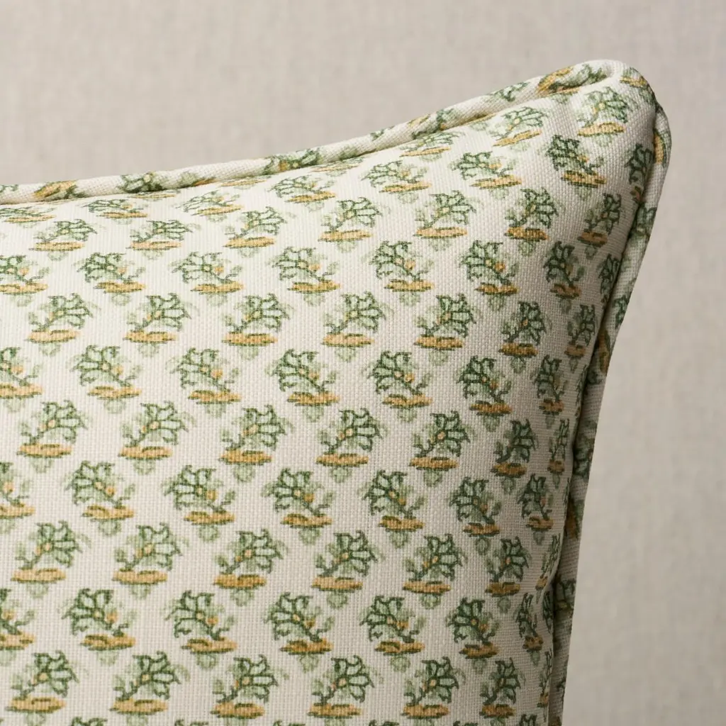 This pillow features Oleander Indoor/Outdoor by Mark D. Sikes with a self welt finish. Inspired by traditional Indian block prints, Oleander Indoor/Outdoor in leaf green by Mark D. Sikes is a stylish high-performance fabric that can stand up to the elements. Pillow includes a polyfill insert and hidden zipper closure.