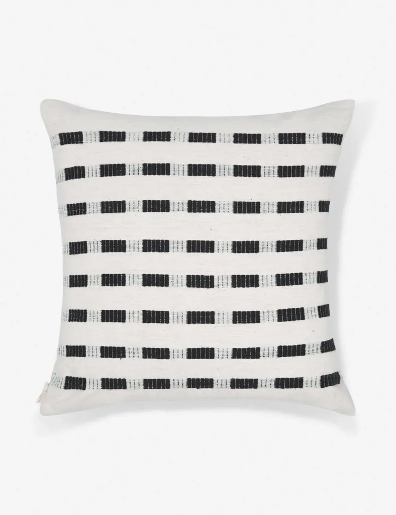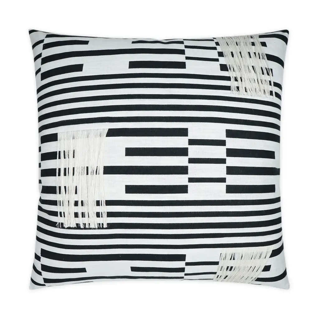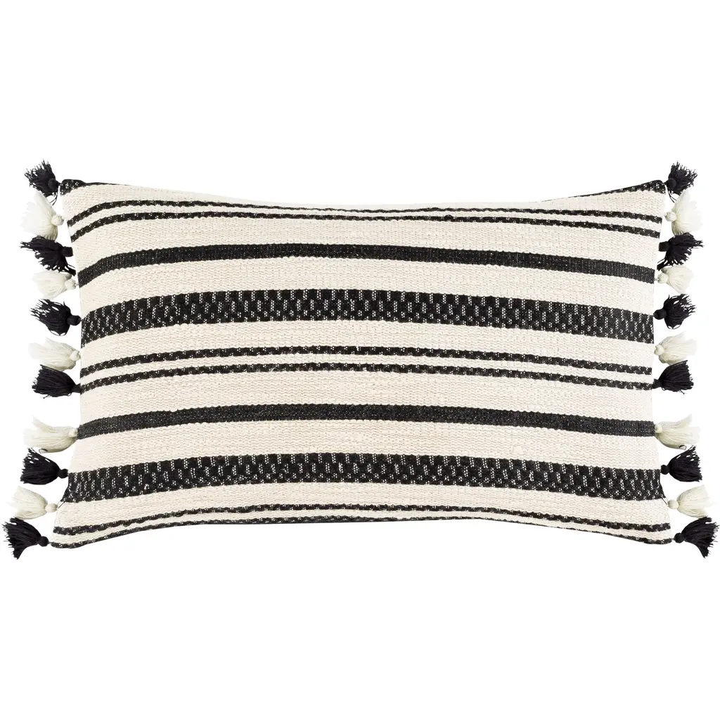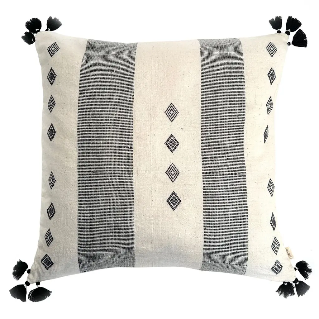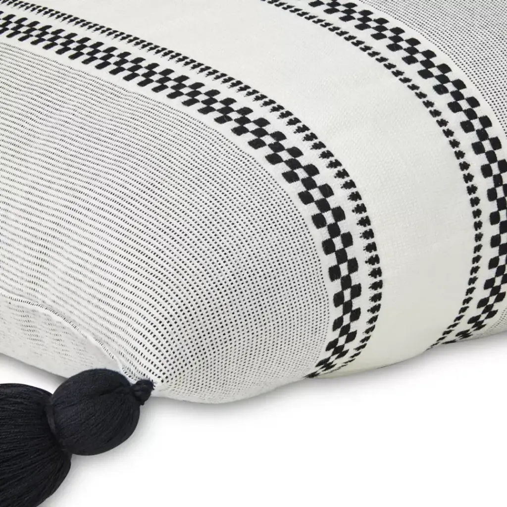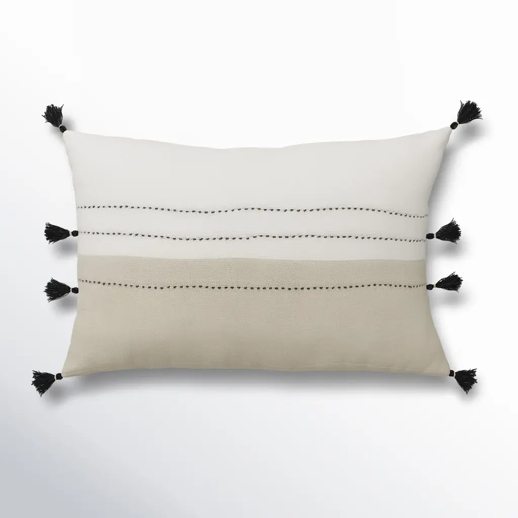 This is everything about a modern pillow. Stripes, grays, linen color with black accents, finished with tassels make it all the more fun.