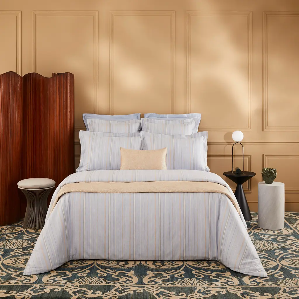 A stripe at once fashionable and timeless, the Ombré Collection from Yves Delorme is in smooth sateen woven with the most sophisticated of mixed threads. Reliefs, heathering and softness in blue-grey shades highlight the lovely jacquard linens.