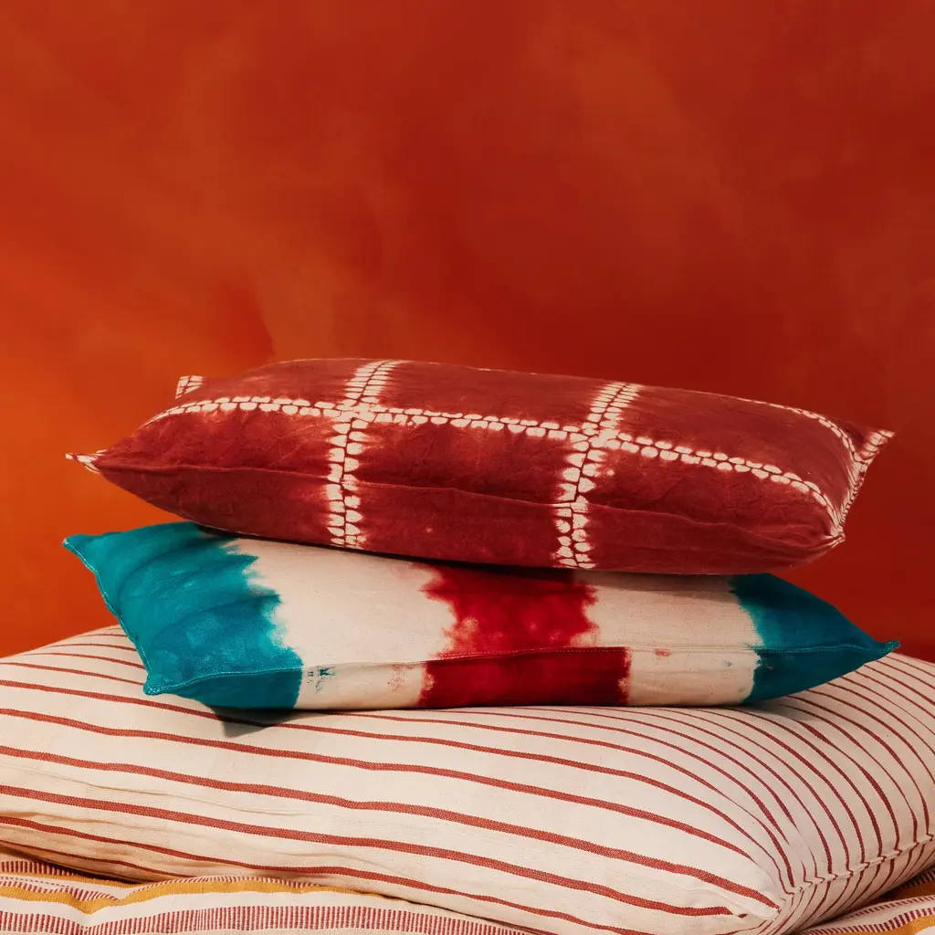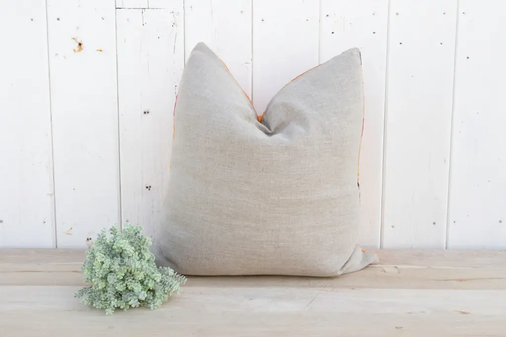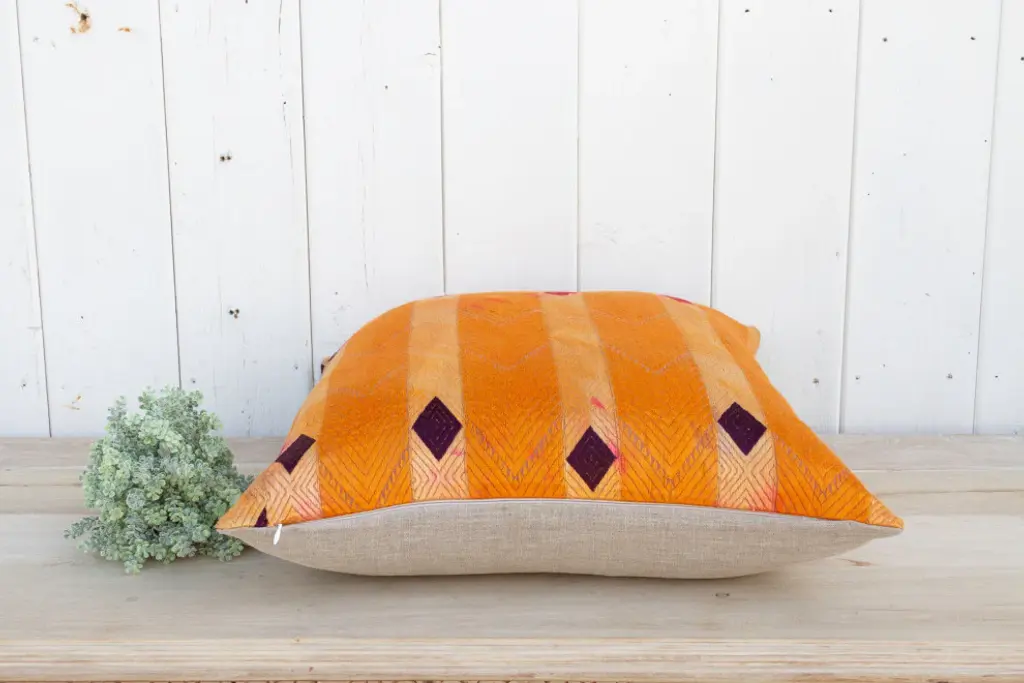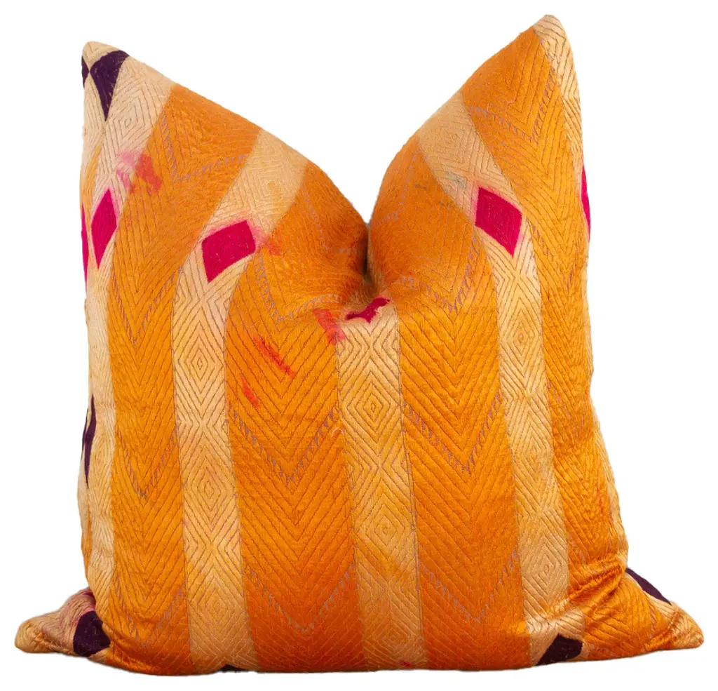 This luxurious Bagh Phulkari pillow features beautiful fine silk embroidery with a diamond pattern on a cotton fabric. This antique Indian pillow is made from an original Phulkari throw, fine throws and tapestries were made by women in Punjab as wedding gifts or use on other important ceremonies. Phulkari means "flower work"� in Punjabi, and it describes the technique of creating intricate floral and geometric designs on fabric using bright and bold colors. This antique pillow has a hidden zipper, linen back, and comes with a custom down blend insert.