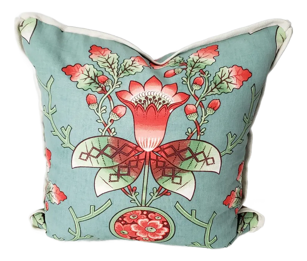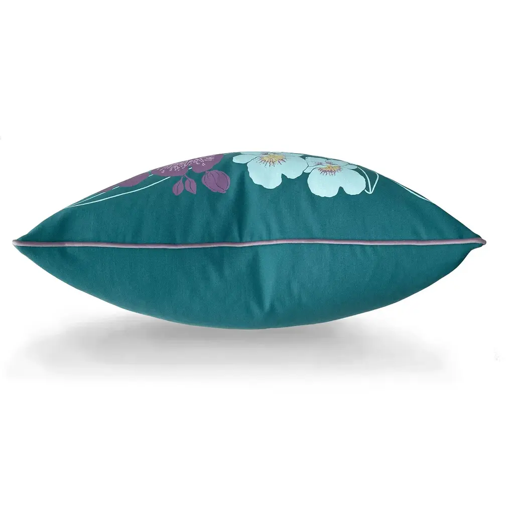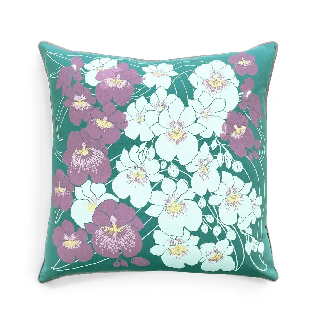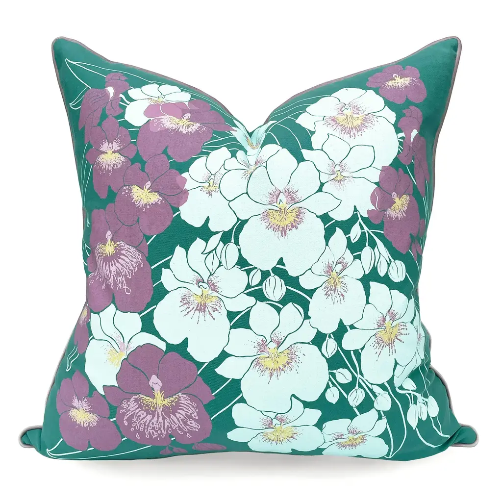 A cascade of orchids brings a delightfully tropical touch to any space 22" pillow, cotton twill with supersoft mauve velvet piping. Removable zipper cover and a plush down/feather filling. Hand-silkscreened and hand-made in New York