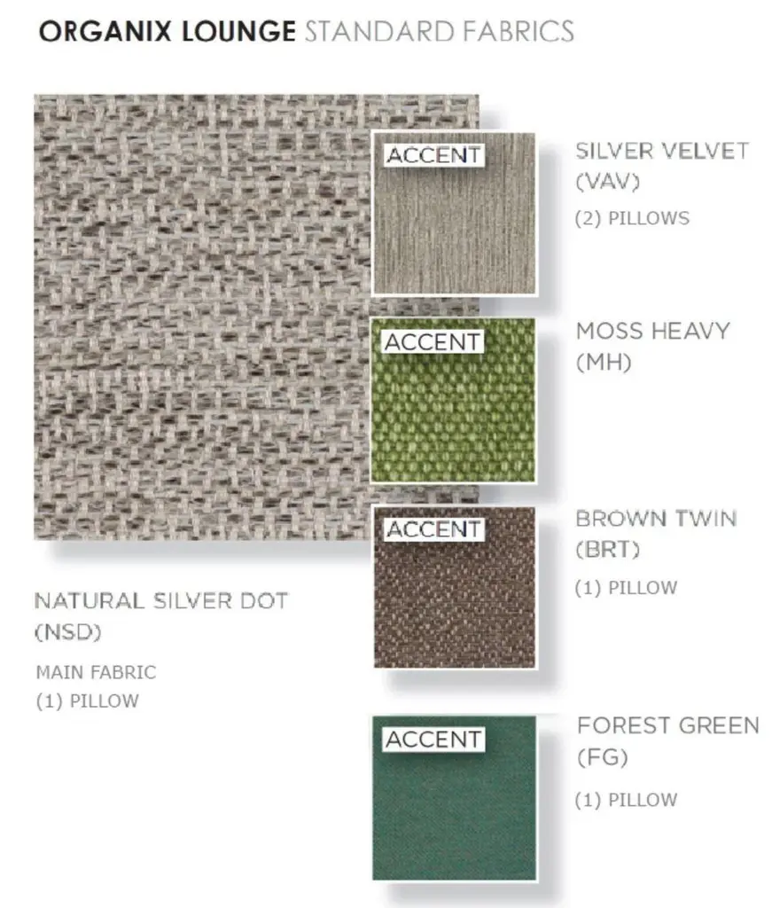 Organix outdoor louge set design by Kris Van Puyvelde.Brand new collection to fit the Organic Outdoor Space for all seasons.Additional Sofas, Coffee Tables, and Poufs available. includesNatura(1) Organix 001 Sofa: Black Legs with Silver Dot NSD Fabric(1) Oragnix 004 Sofa: Black Legs with Silver Dot NSD Fabric(1) Organix 007 Table: Black Legs with Travertine Ceramic Top(1) Throw Pillow: Silver Dot NDS Fabric(2) Throw Pillows: Silver Velvet VAV Fabric(2) Throw Pillows: Heavy Moss HM Fabric(1) Throw Pillow: Brown Twin BRT Fabric(1) Throw Pillow: Forest Green FG Fabric.