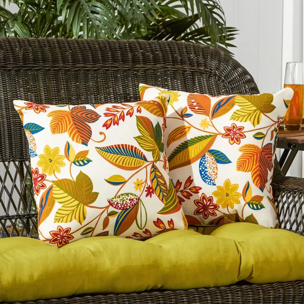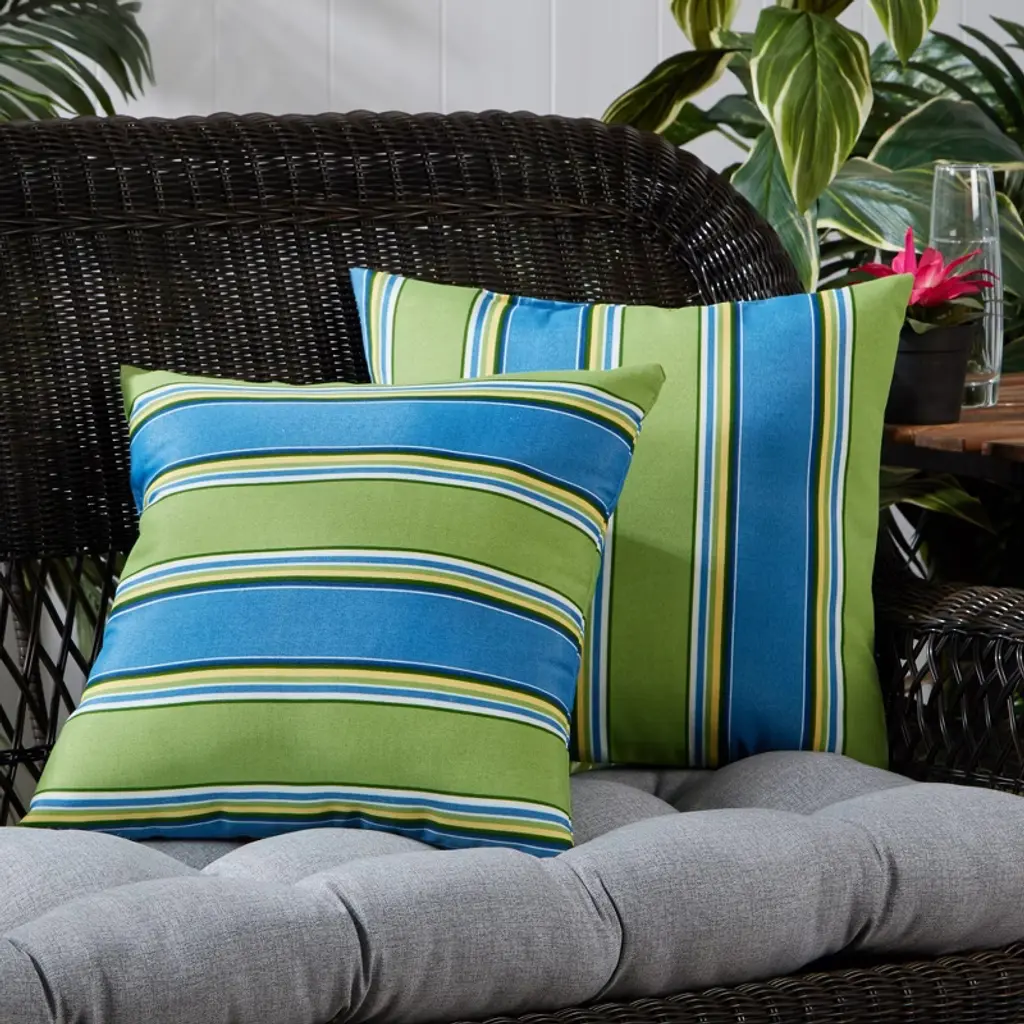 Add a stylish and colorful accent to your outdoor furniture with this set of two Kensington Garden 17-inch square outdoor accent pillows. Each pillow is overstuffed with a soft polyester fill, made from 100% recycled, post-consumer plastic bottles, for added comfort, strength and durability. It's exterior shell is made from a heavy-duty outdoor polyester fabric that is fade, water, stain and mildew resistant. Pillows feature a sewn closure and knife edge design.