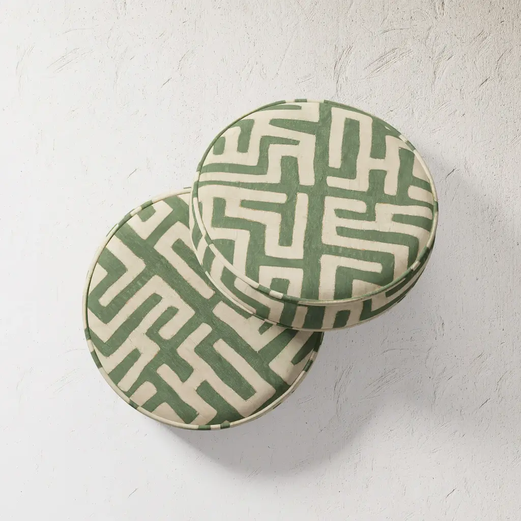 Designed in-house and inspired by fragments from our vast archives, the Kuba Cloth pattern is intended to be mixed and matched for a richly layered space - whether indoor or out. Adorn a neutral sofa or chaise with our other green hues for a tonal look. Each double-sided printed pillow is mildew proof and has UV and water resistant properties.