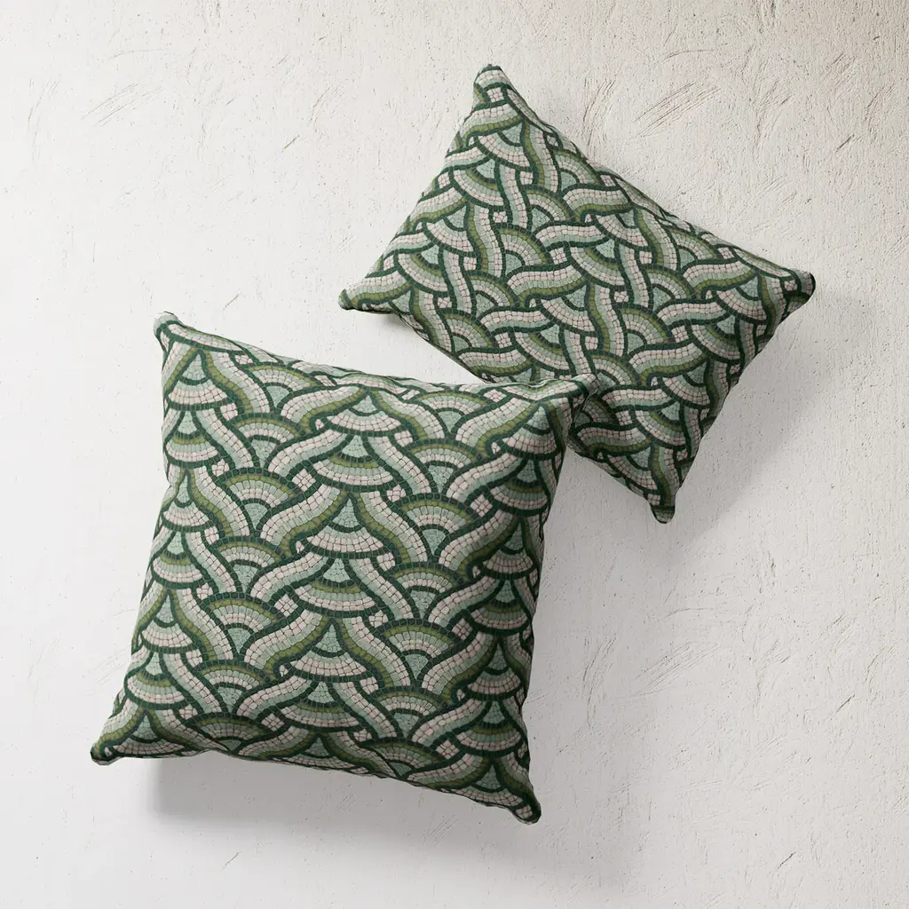Designed in-house and inspired by fragments from our vast archives, the Woven Mosaic knot pattern is intended to be mixed and matched for a richly layered space - whether indoor or out. Adorn a neutral sofa or chaise with our other green hues for a tonal look. Each double-sided printed pillow is mildew proof and has UV and water resistant properties.