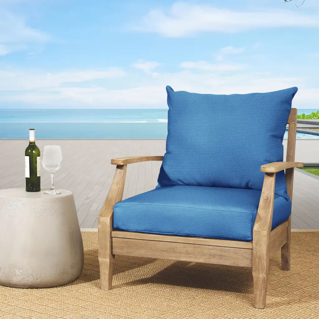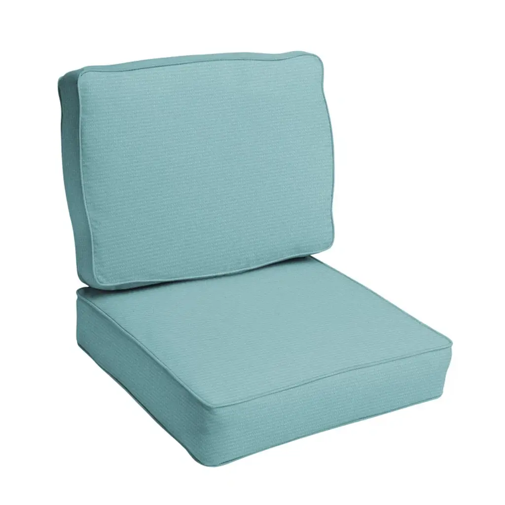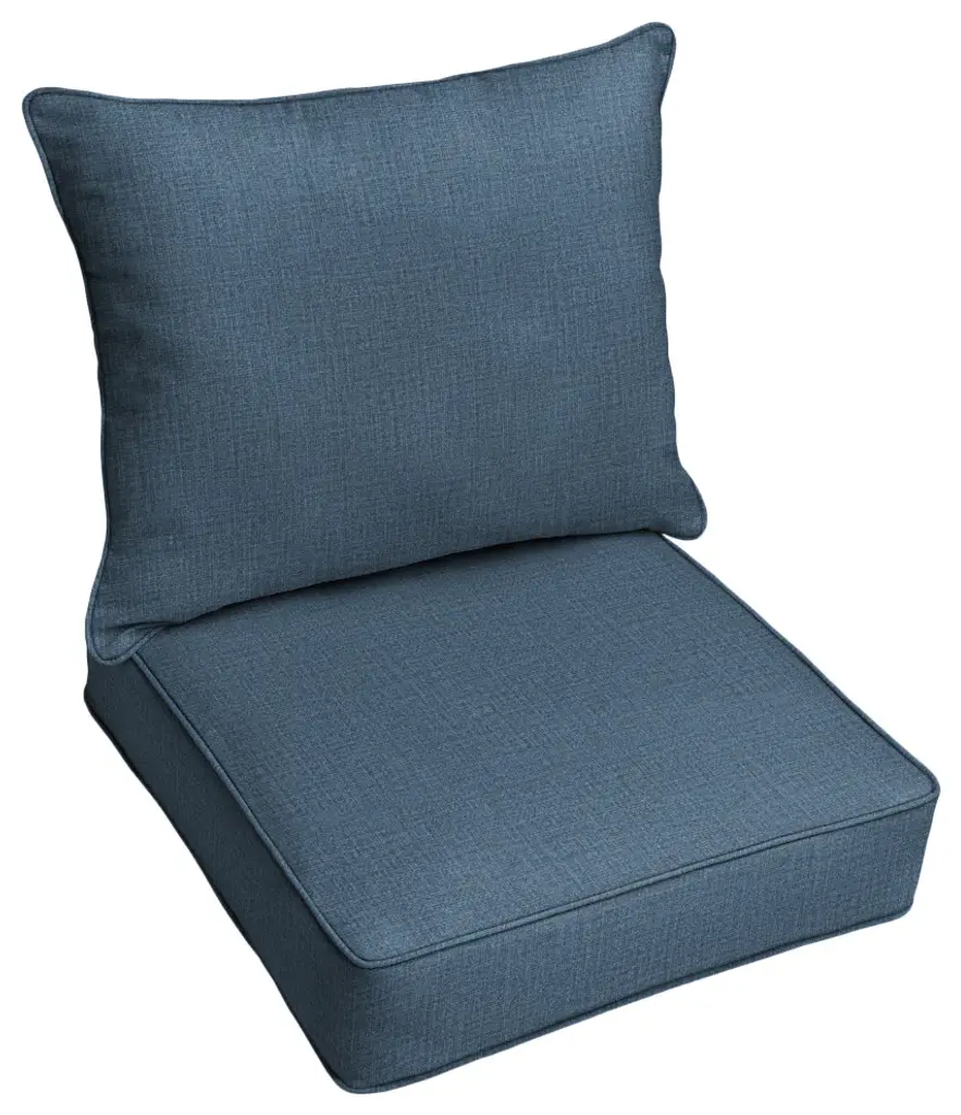 Enjoy the fresh air with friends and family with the help of this cozy chair pillow and cushion set! Featuring a stunning solid textured fabric in a rich, blue hue, this cushion set will awaken your outdoor space and give you the perfect excuse to sit back and relax! Crafted out of a performance material right here in North America, this chair pillow and cushion set is built to withstand all of the sun, stains, and outdoor elements that come your way. Outdura is the trusted brand for performance upholstery fabric for outdoor and indoor use.-Outdura fabrics are made from 100% solution-dyed acrylic with color pigments infused to the core of fibers, ensuring colorfastness, UV resistance, and durability.- • Ideal for casual indoor and outdoor use• Includes one (1) back pillow and one (1) seat cushion• Cushion cover can be removed for easy cleaning. Pillow cover is not removable.• Available in a variety of sizes and colors to ensure that you find the perfect match for your furniture• Pillow and cushion only. Furniture not included.• • Made in North America•