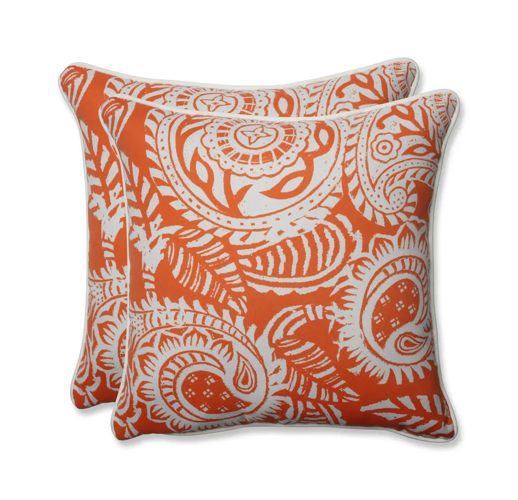 Feel the heat of summer with this lusciously fruity orange and crisp white paisley adding bright color to your festive poolside. Lazy twirls of paisley dot the surface of the fabric, mixed with leaves and feather shapes giving this a playful tribal feeling which is polished by matching white edging. This pair of square throw pillows will be perfect for fun afternoons in the sun.Includes two (2) outdoor pillows made with 100-percent polyester fabric, resists weather and fading in sunlight; Suitable for indoor and outdoor usePlush Fill - 100-percent polyester fiber fillingEdges of outdoor pillows are trimmed with matching fabric and cord to sit perfectly on your outdoor patio furniture; Made in USAEasy Care - lightly spot clean or hand wash outdoor pillow fabric with mild detergent and cool water; then let air dryMeasures: 18.5-inch length X 18.5-inch width X 5-inch depth (measurements may vary up to 1-inch since item is handcrafted)Material Fill: 100% Polyester FiberMaterial Textile: 100% Polyester FiberCare and Cleaning: Spot Clean OnlyPurpose: Outdoor/IndoorProtective Qualities: Fade Resistant , UV Protection , Weather ResistantShape: Square