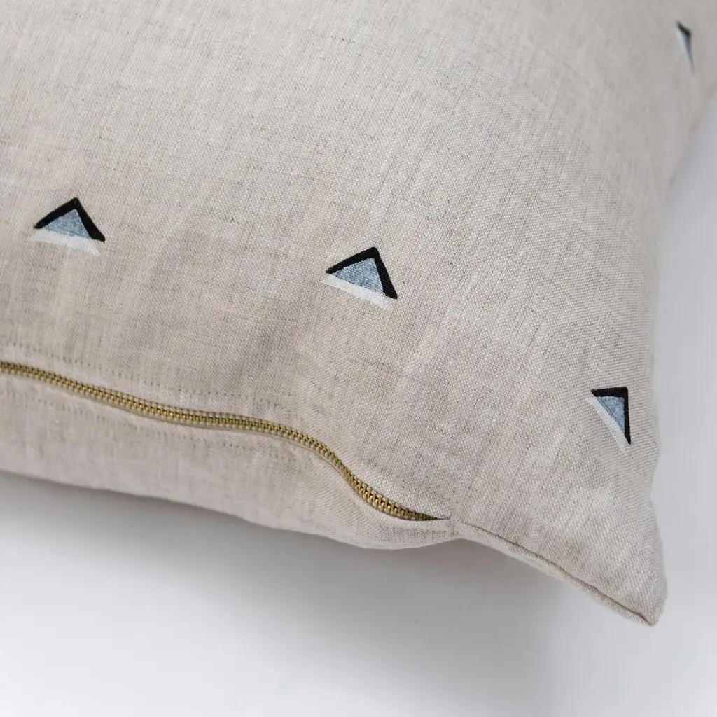 This pillow features Overlapping Triangles by Caroline Z Hurleywith a knife edge finish. Designed by Caroline Z Hurley in her Brooklyn studio and block-printed in New Bedford, Massachusetts. Each shape is cut and individually stamped onto the linen by hand. Pillow includes a feather/down fill insert and hidden zipper closure.