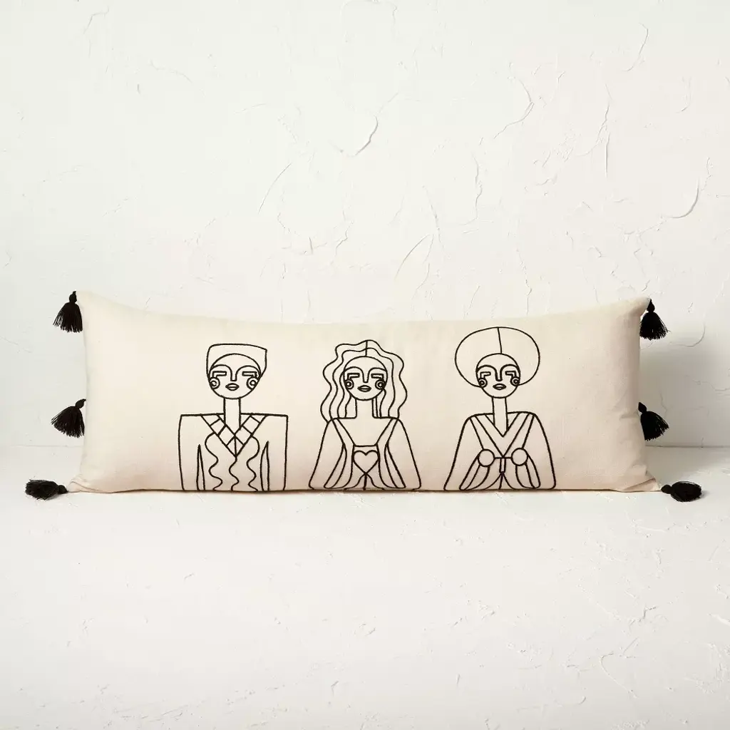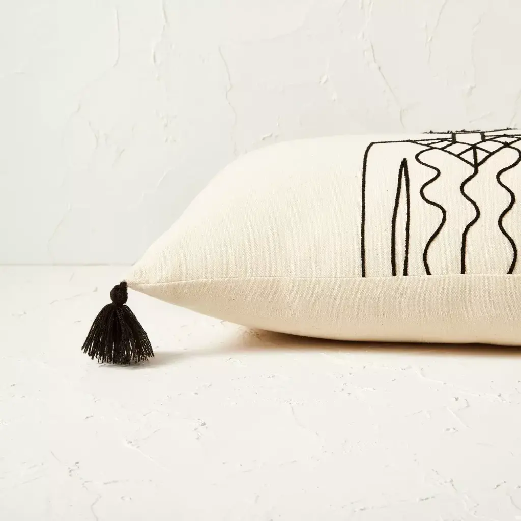 If you're looking for an elegant decorative accent for your bed or sofa, look no further than this Oblong Oversized Embroidered Decorative Throw Pillow from Opalhouse™ designed with Jungalow™. This oblong throw pillow features three embroidered human figures in black against a natural tan backdrop for a contrasting look that's accented by six black tassels around the edges of the pillow. Made with a 100% cotton exterior with soft interior filling, this oversized pillow is also perfect for sitting and lounging. Plus, the solid colors make this pillow easy to pair with any existing decor color scheme.