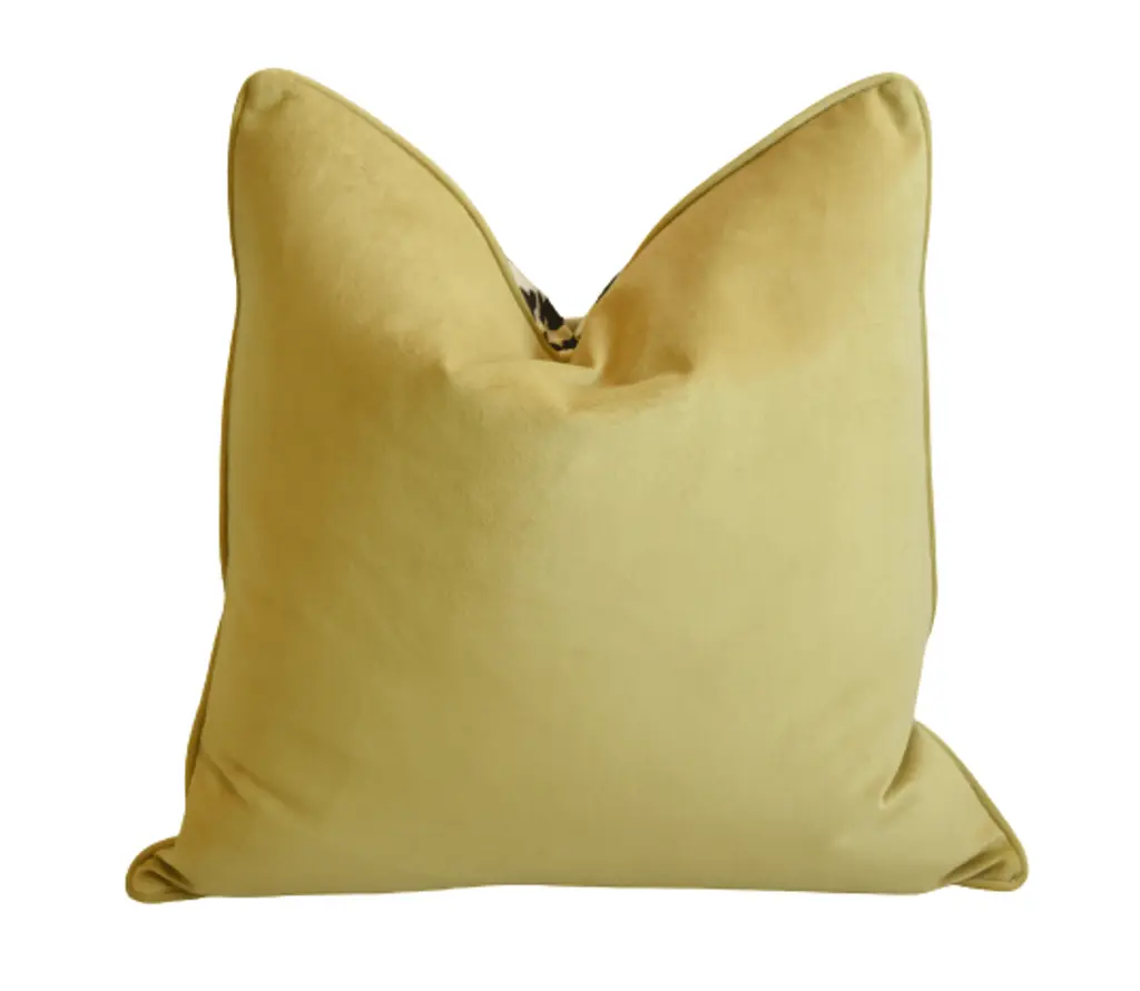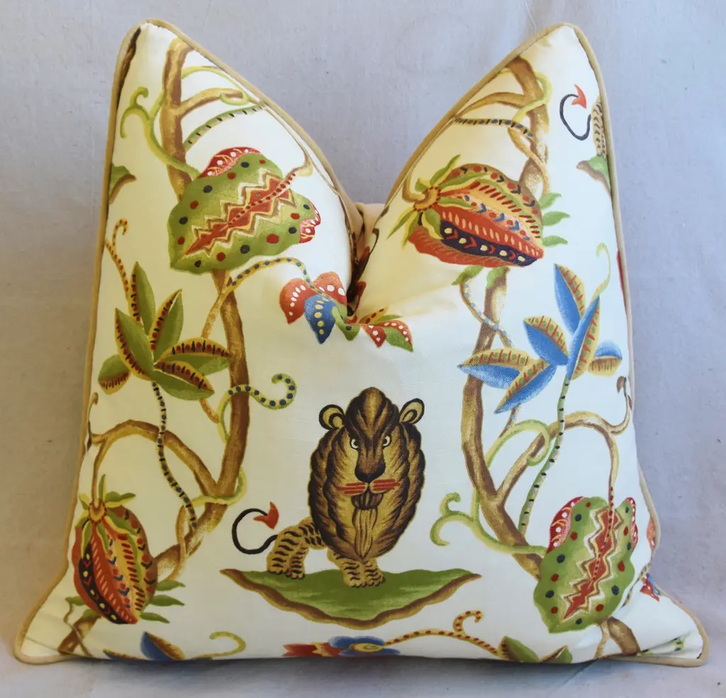 Custom-tailored pillow in P. Kaufmann Fabrics called "Bazaar Paradise" with a colorful lion and flower design. Gold cotton-velvet fabric back. Custom velvet cord trim. Zipper closure. Plump goose down-and-feather insert. Excellent new, unused condition.