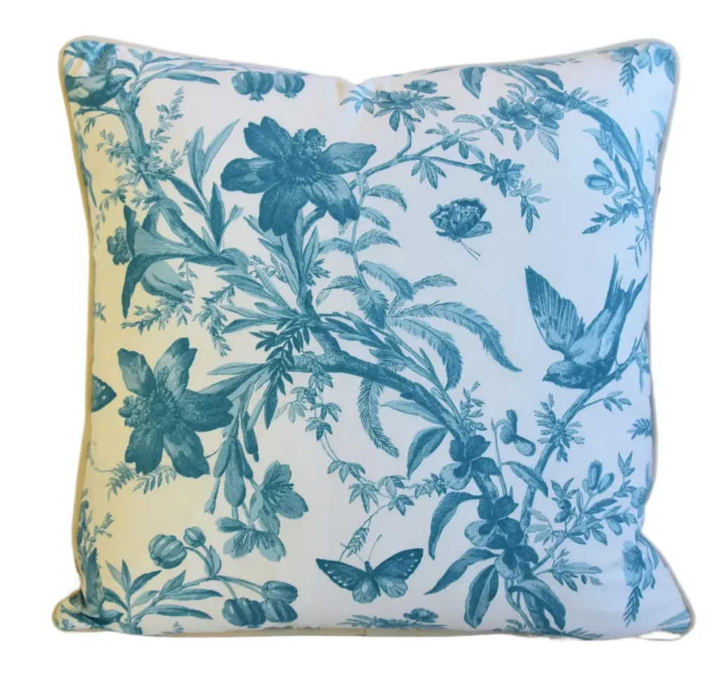 Custom-tailored pillow in designer P. Kaufmann cotton fabric printed with a beautiful design of birds and butterflies on intertwining floral branches in a teal/aqua color way. Cream cotton-velvet back. Custom cord trim. Zipper closure. Plump goose down-and-feather insert. The placement of the design may vary according to the fabric cut. Excellent new unused condition!! ***PLEASE NOTE: I will combine shipping whenever possible if you purchase multiple items from my shop. Warm regards, Mike Seratt ***Also don't forget to take a peek at my other current listings...you just might find something you can't live without!!! It's easy just click on my name to the right of any listing highlighted in black "Mike Seratt of The Prized Pig" and presto it will bring you to my storefront!!! Cheers!!! Mike Seratt I SHIP OUT IMMEDIATELY, SO THE ESTIMATION YOU SEE FOR THE DELIVERY TIMELINE IS CHAIRISH'S OVERALL GENERAL TIMELINE, BUT I WILL GET THIS OUT THE NEXT DAY AND DELIVERY IS USUALLY 5-7 DAYS AT MOST