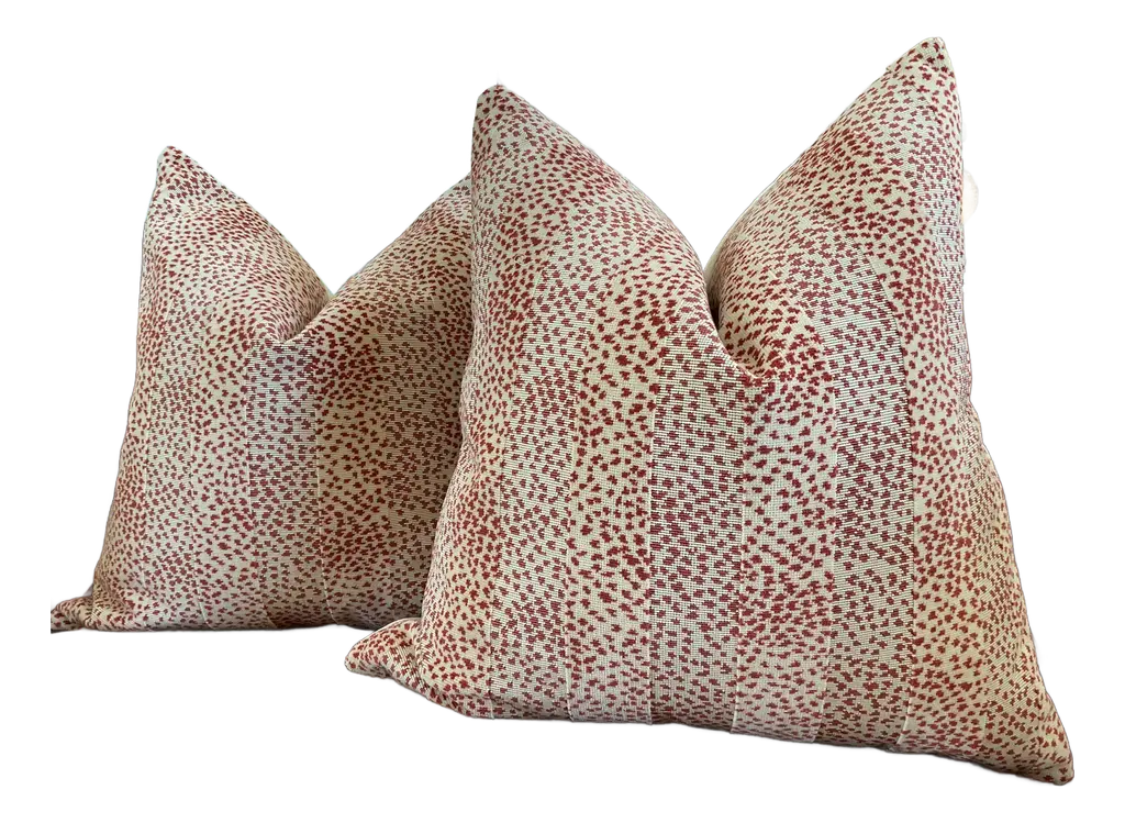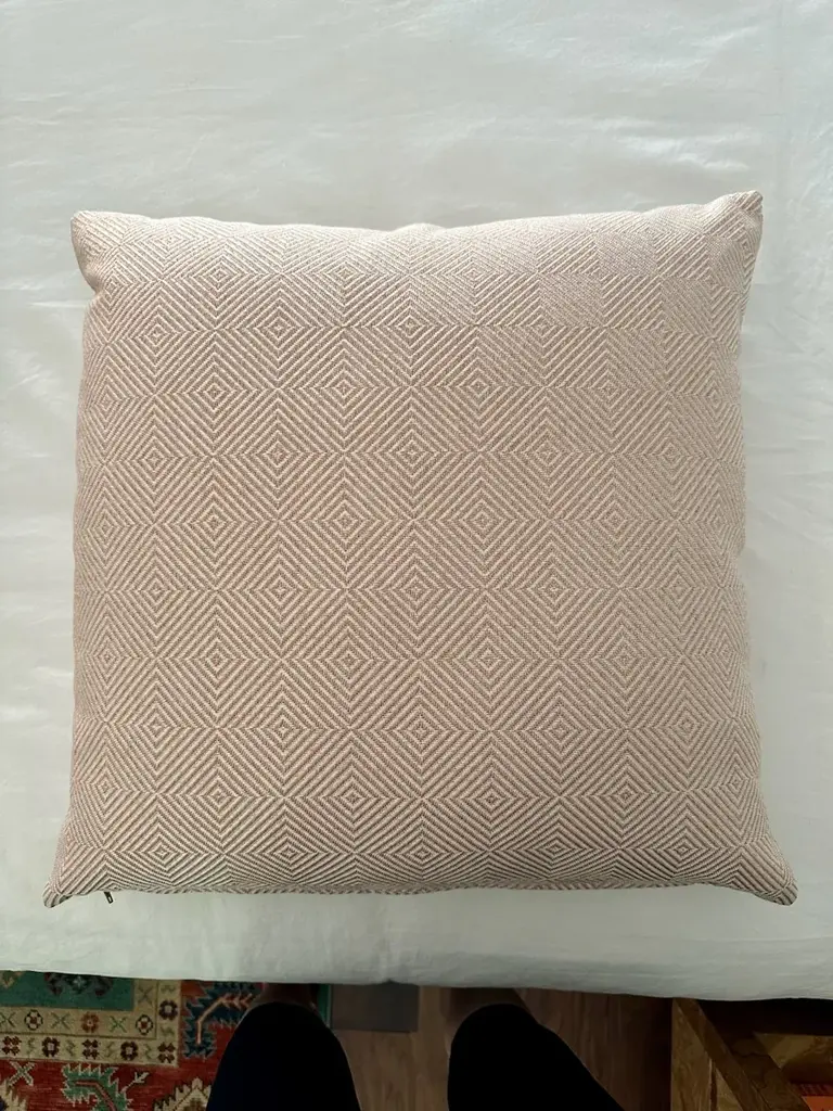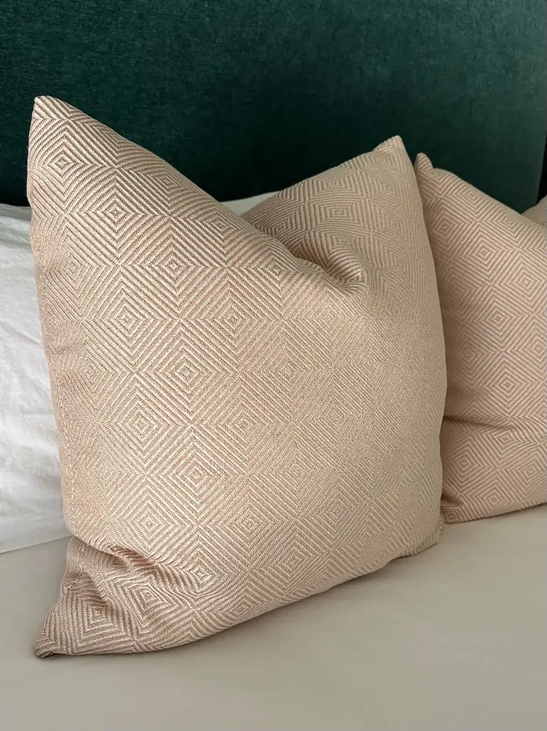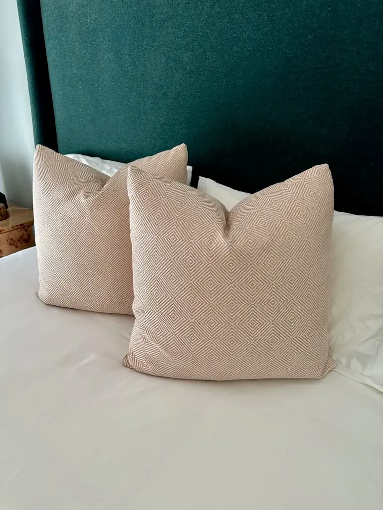 Pair of Large Throw pillows with Trillium fill (synthetic down). Zippers allow for cleanability. Dry clean recommended. Fabricut fabric VIA POINT: Blush which is a diamond pattern in a soft salmon & cream color.