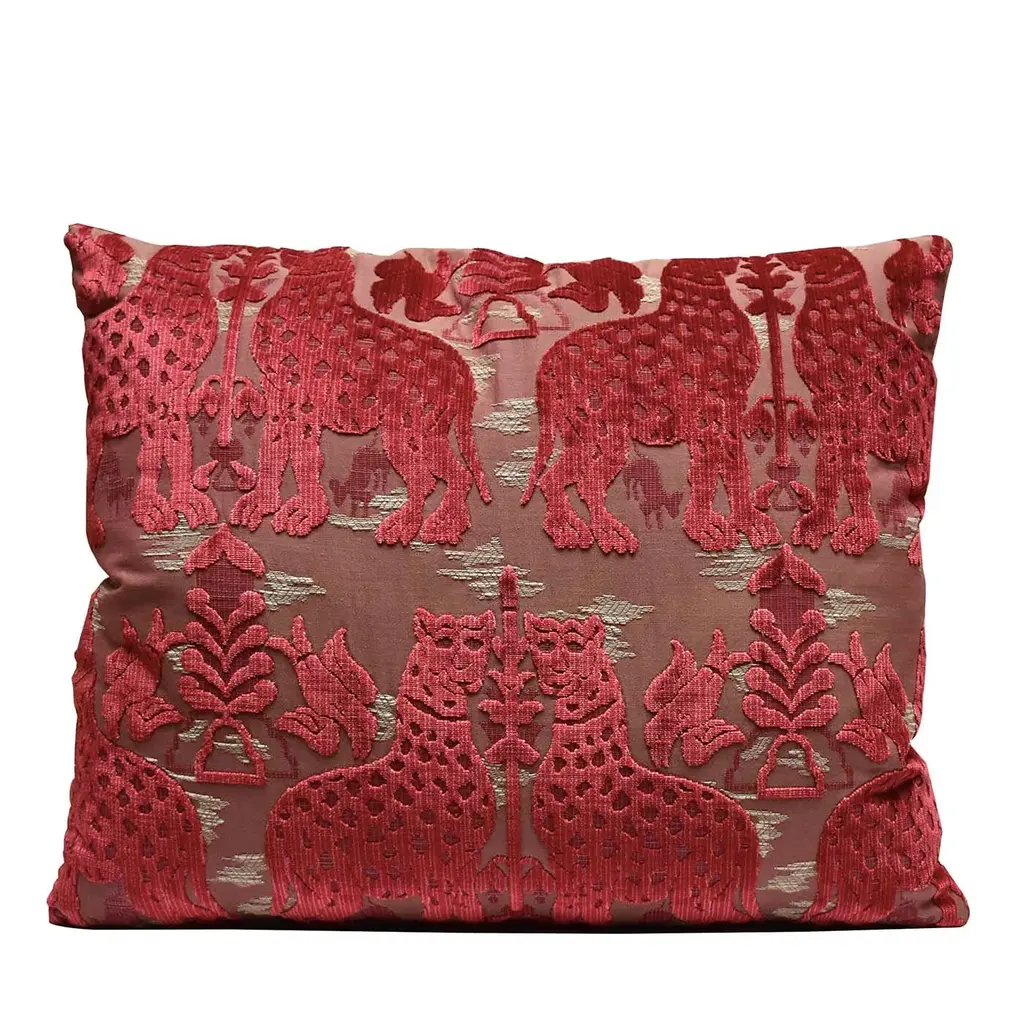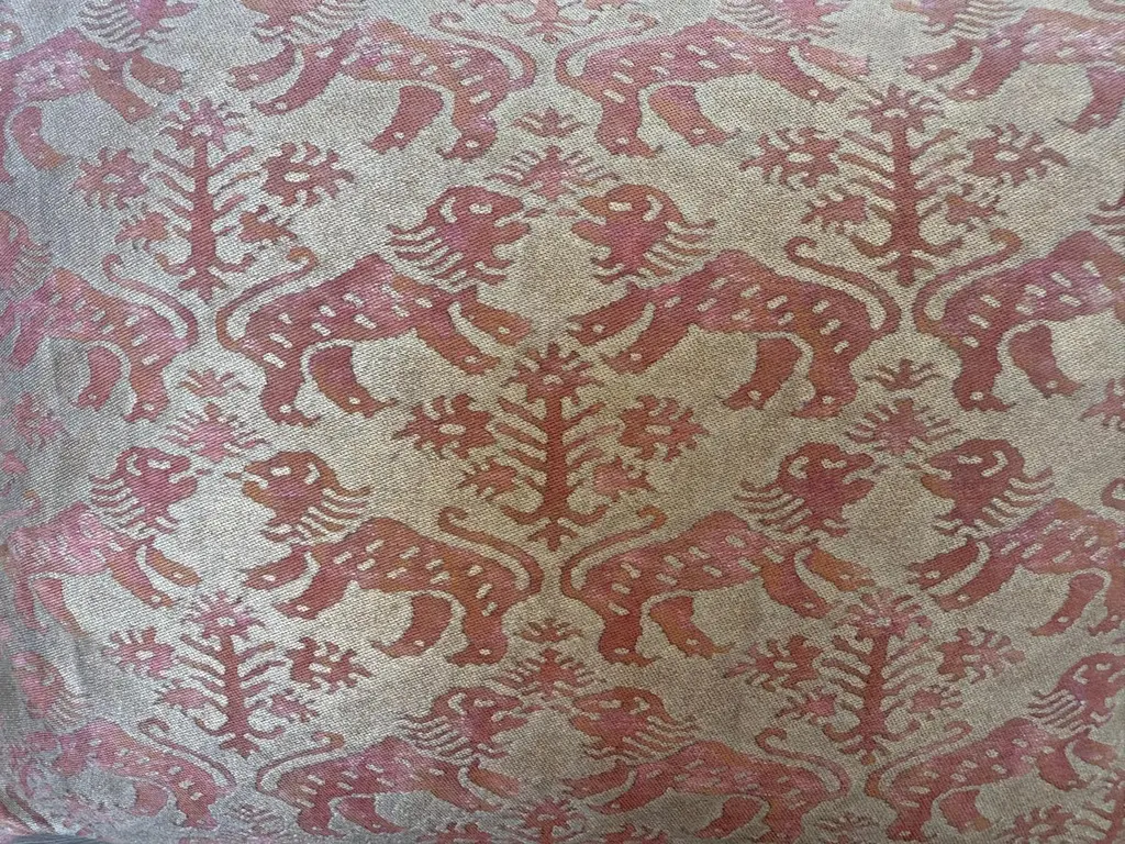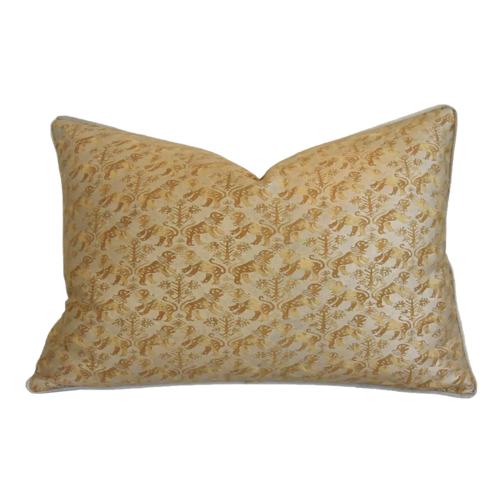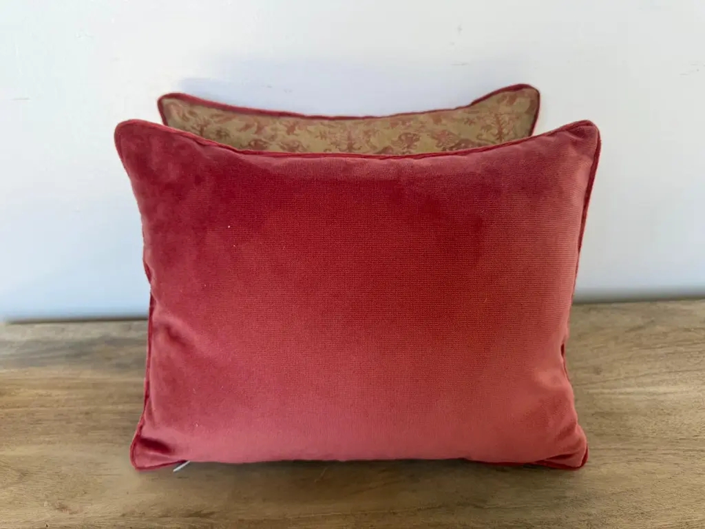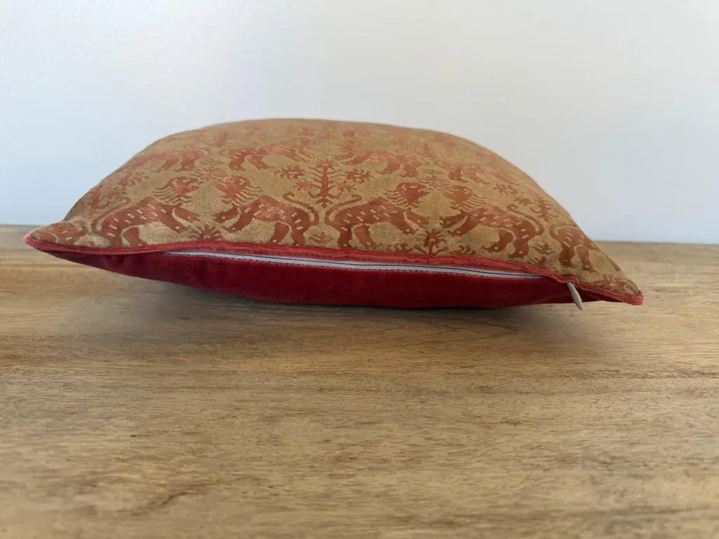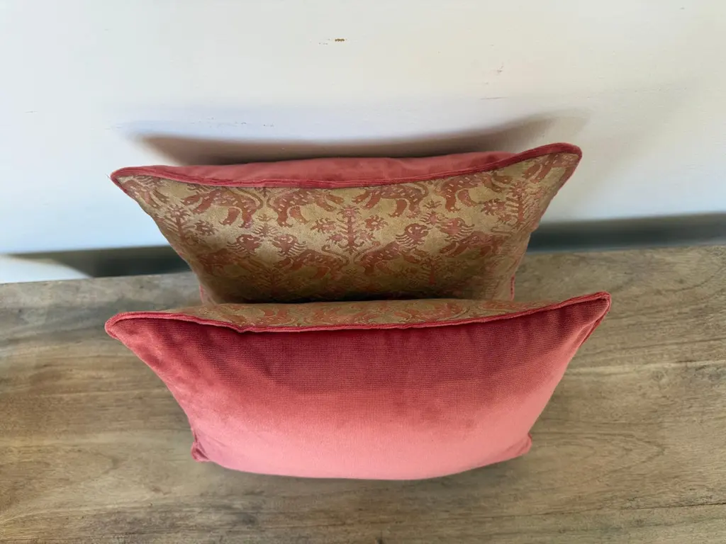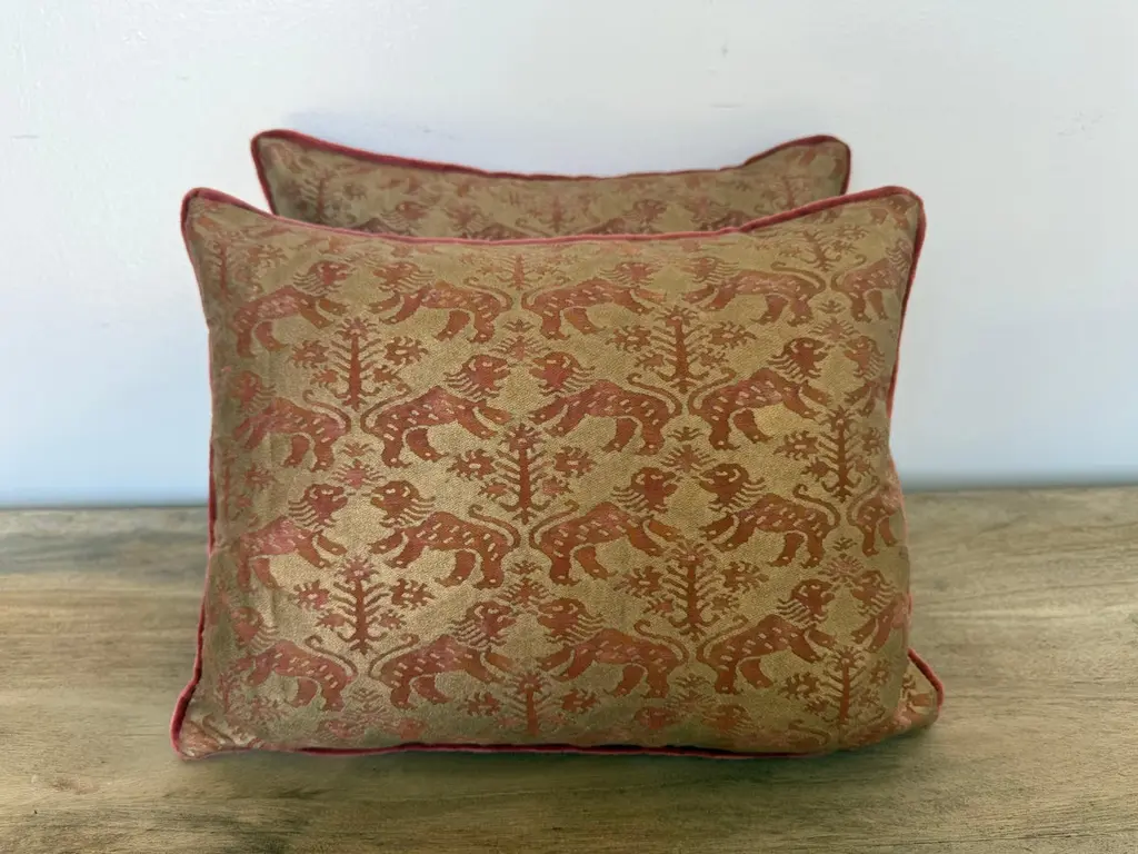 A striking pair of custom pillows crafted by Melissa Levinson, featuring authentic Fortuny fabric in the historic Richelieu pattern. This celebrated design, first introduced by Mariano Fortuny in Venice, is distinguished by its procession of stylized Venetian lions flanking ornamental trees, symbolizing both strength and heritage. Presented here in warm terracotta red against a soft gold ground, the textile exudes Old World refinement and timeless appeal.Each pillow is finished with tailored precision, backed in a coordinating plush custom velvet, carefully chosen to complement the centuries-old Venetian textile tradition while adding contemporary depth and softness. The edges are neatly piped for a refined finish, highlighting Melissa Levinson’s signature approach of blending antique and vintage fabrics with modern sensibility.