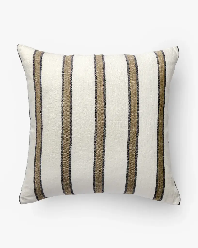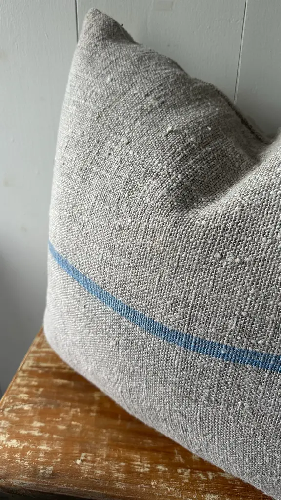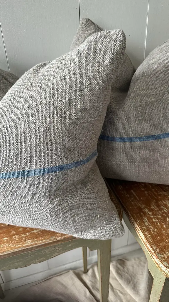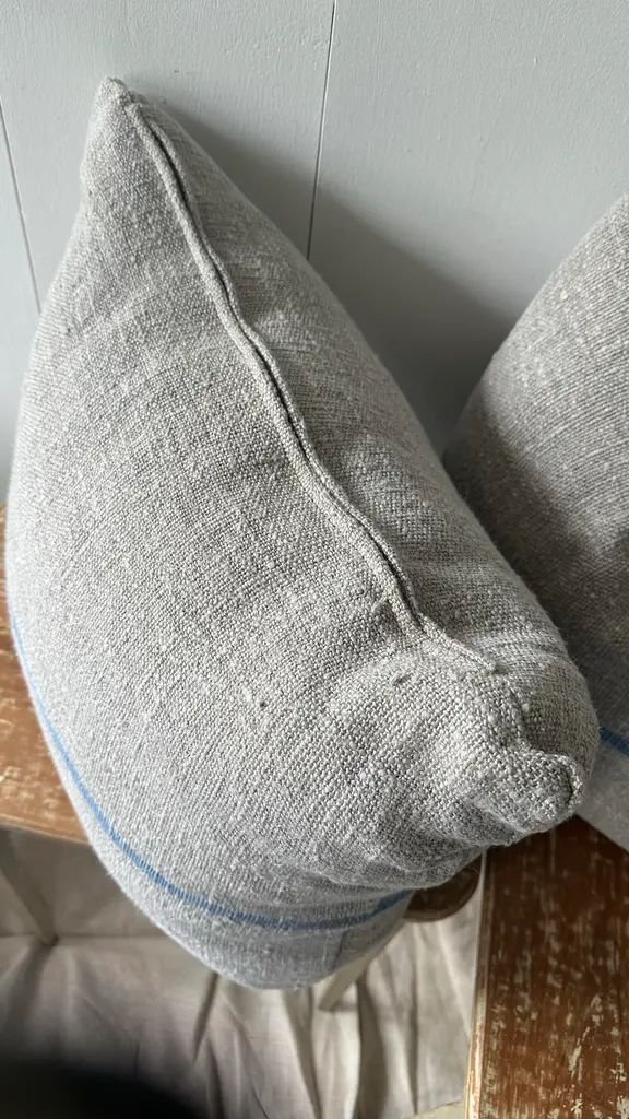 Newly made 22 x 22” down and feather filled throw pillows in vintage heavy linen. Grey with French blue stripe