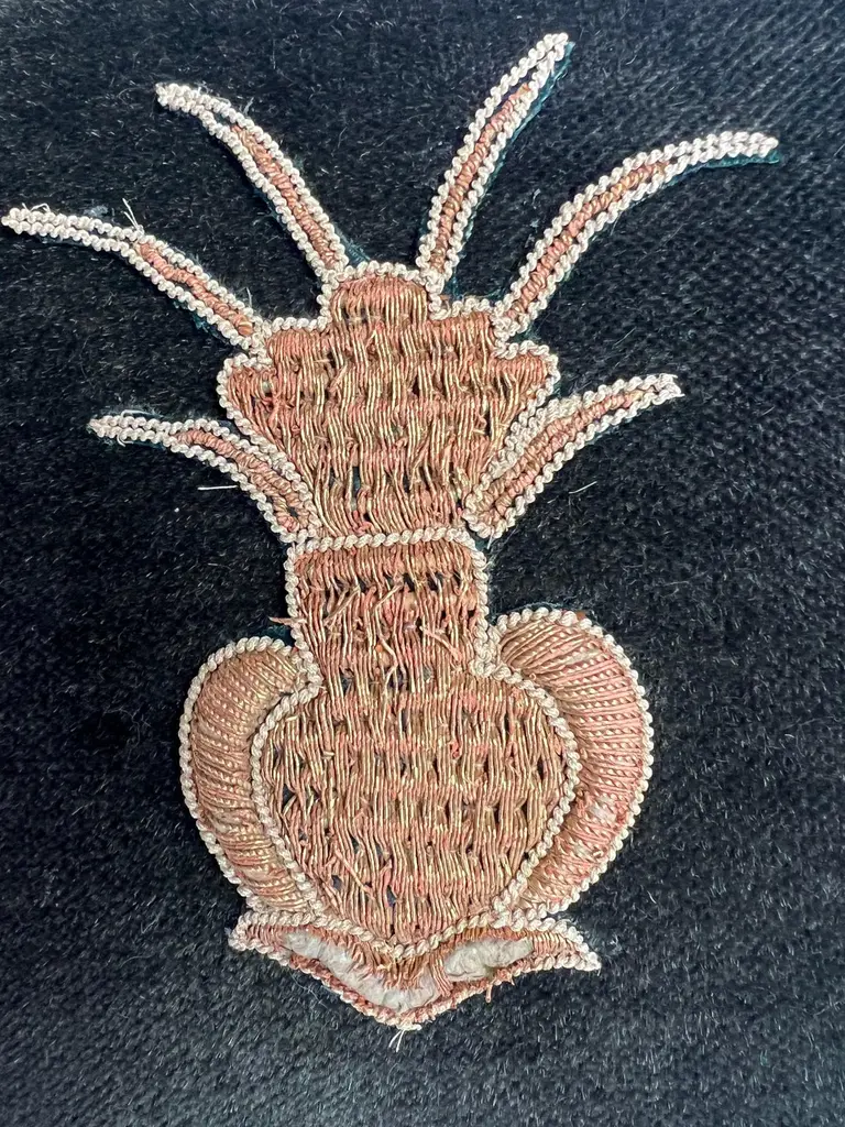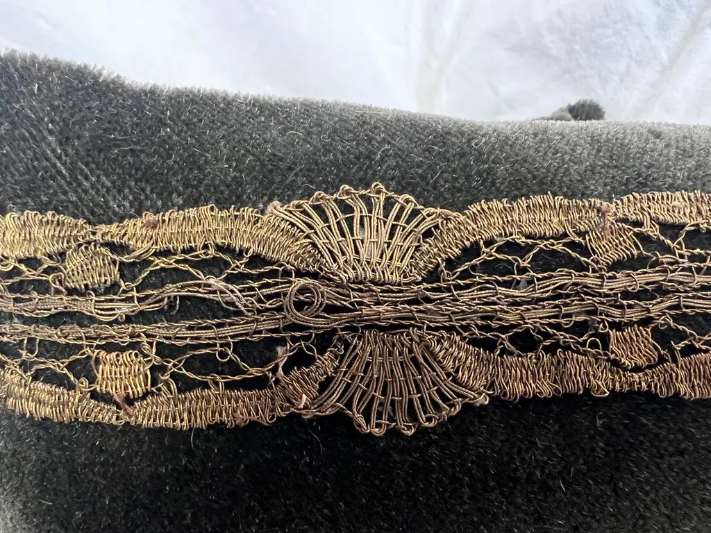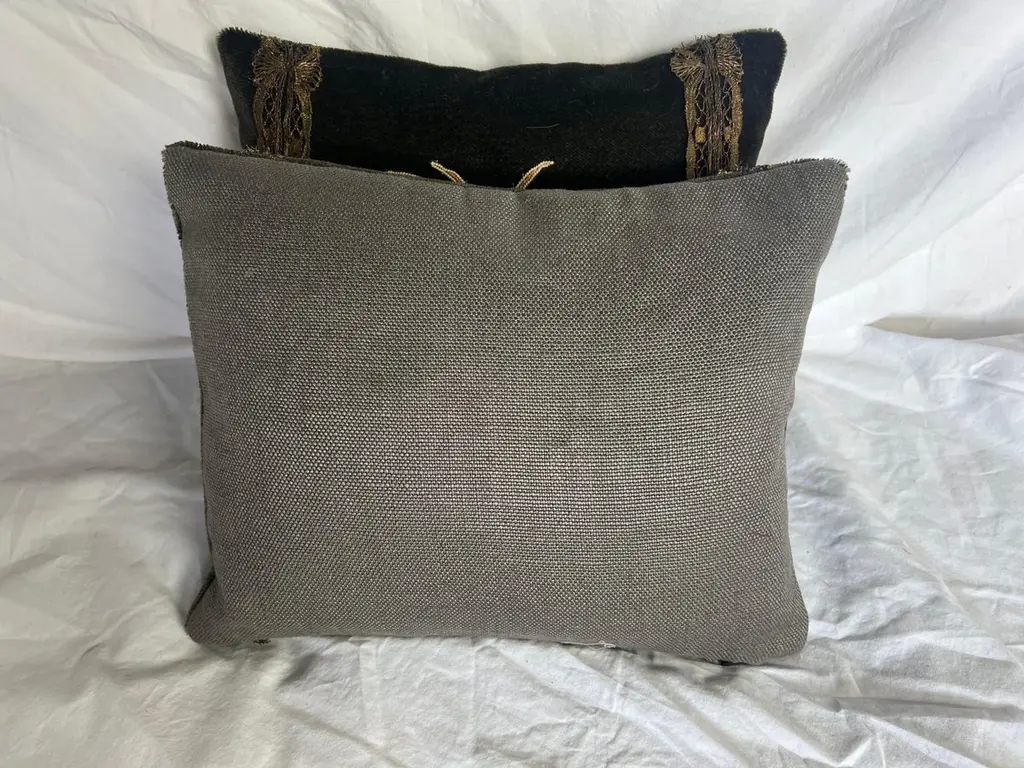Pair of custom pillows made with 19th century metallic embroidered pieces applied to rich, brown velvet fronts and silk backs. Each pillow is adorned with intricate gold metallic embroidery featuring a central motif resembling a stylized urn motif or floral design with branching elements. Notice the handmade 19th century metallic trim running along the vertical edges of each pillow, adding to their opulent appearance. These pillows would be great accent in any decor.