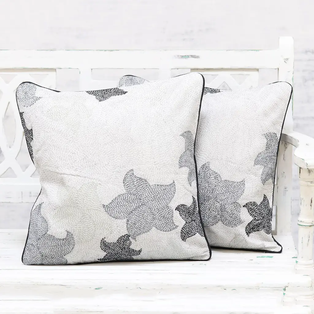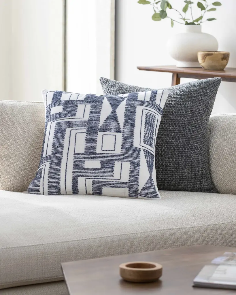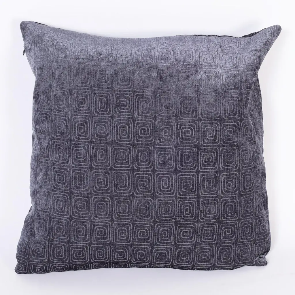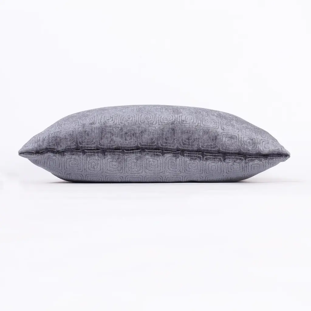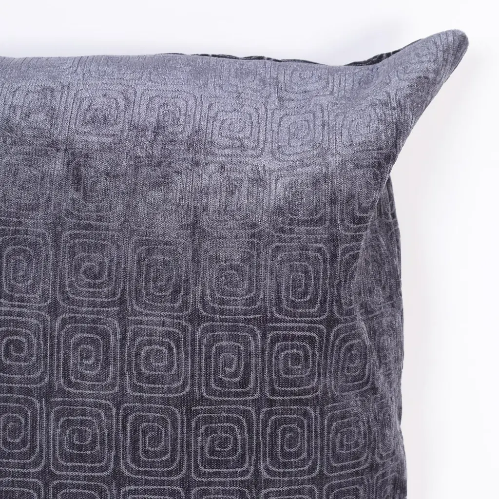 Pair of pillows crafted in velvetine relief with a repeating modern design.