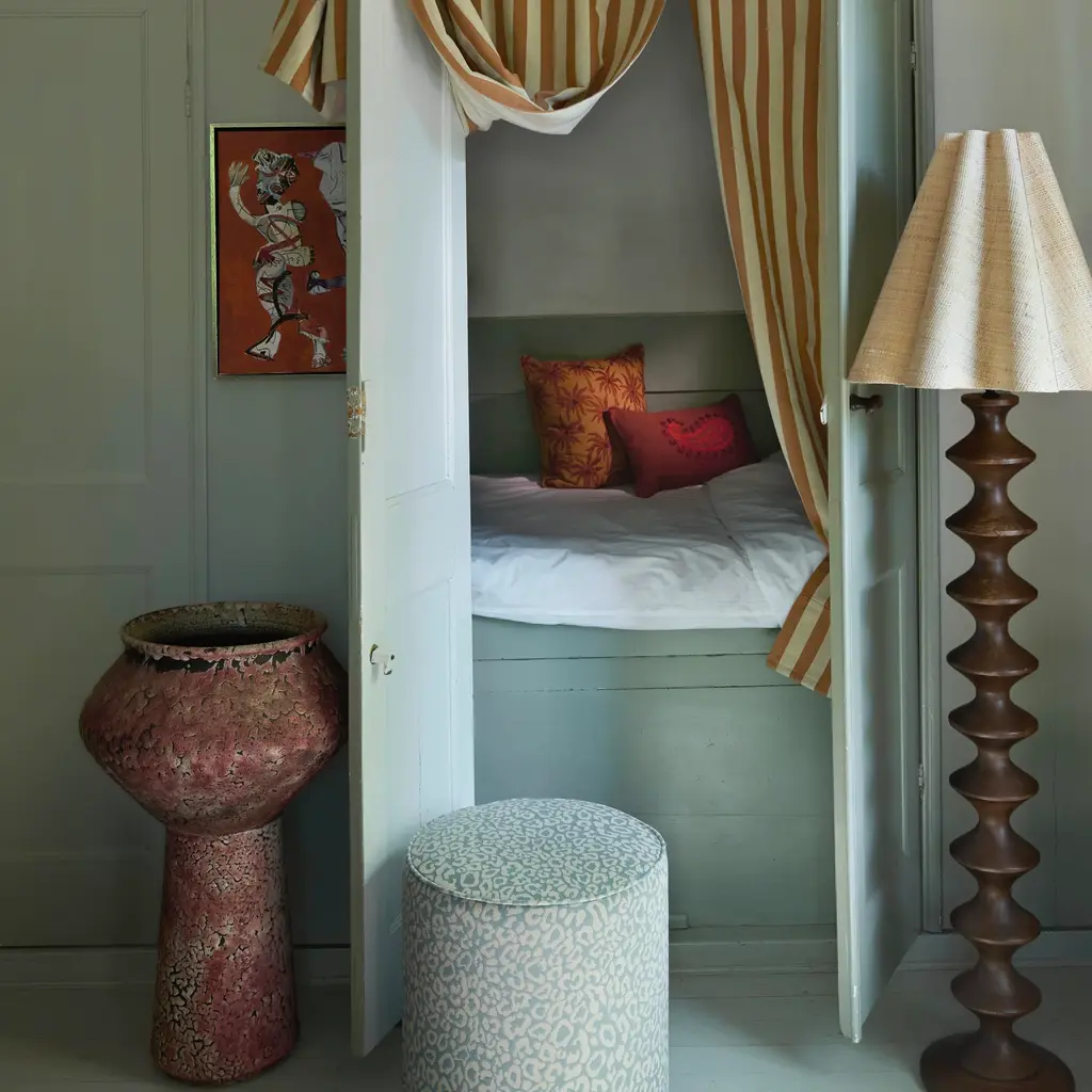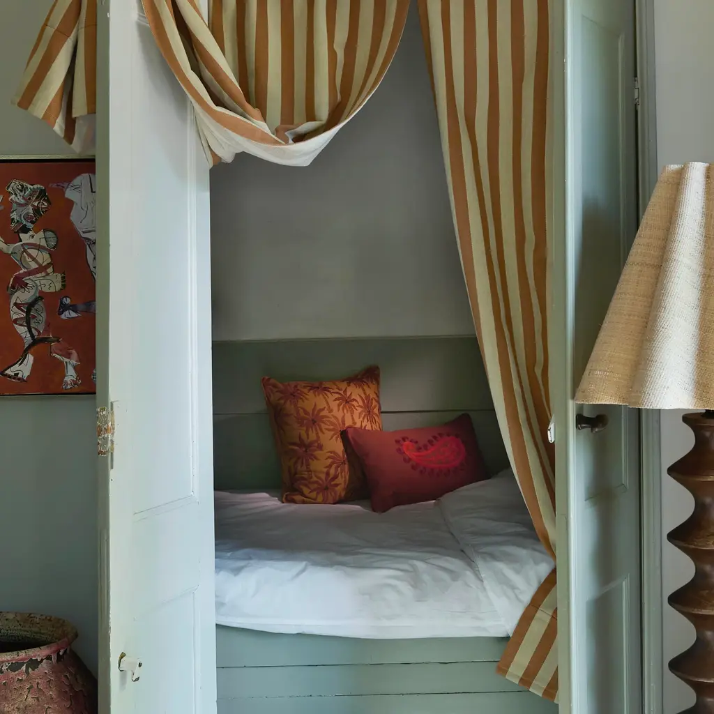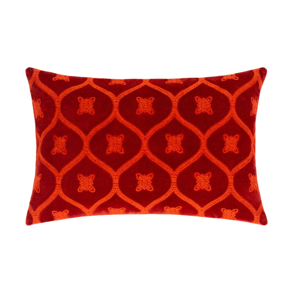 This cushion combines bold design with timeless elegance. The spice-colored base is adorned with striking coral paisley embroidery in a Suzani-inspired style, giving the piece an artisanal, global character. The reverse features playful stripes, offering a versatile alternative look. Crafted from 100% organic cotton duck, the cover is tightly woven, smooth, and naturally soft. The insert is made from recycled down and feathers, combining eco-conscious craftsmanship with luxurious comfort. A versatile accent pillow that brings warmth, depth, and character to your sofa, armchair, or bed. Details: Dimensions: 20” x 12” (50 x 30 cm) Cover: 100% organic cotton duck Fill: recycled down & feather insert Double-sided: Suzani-inspired paisley front, striped reverse Colors: Spice with coral accents Care: Dry clean recommended