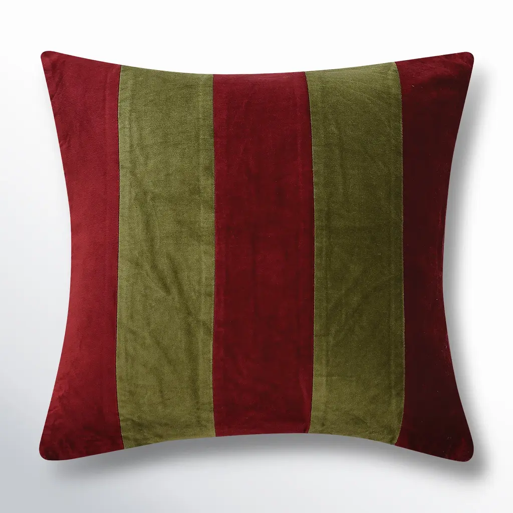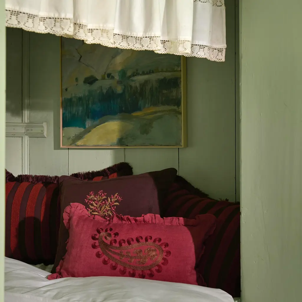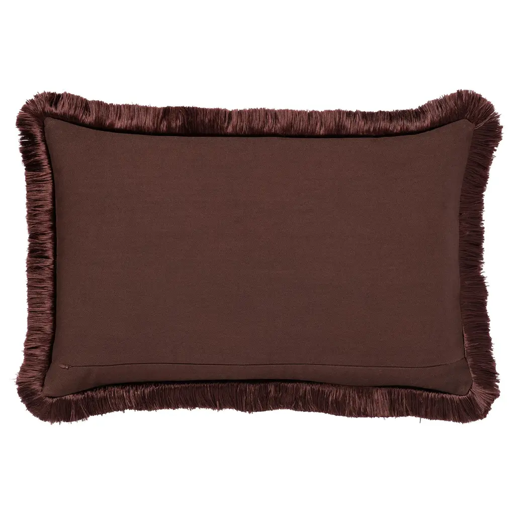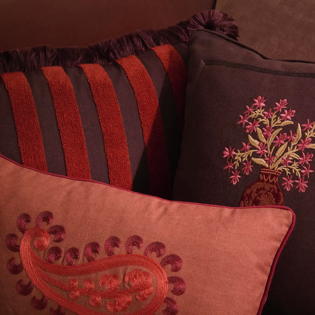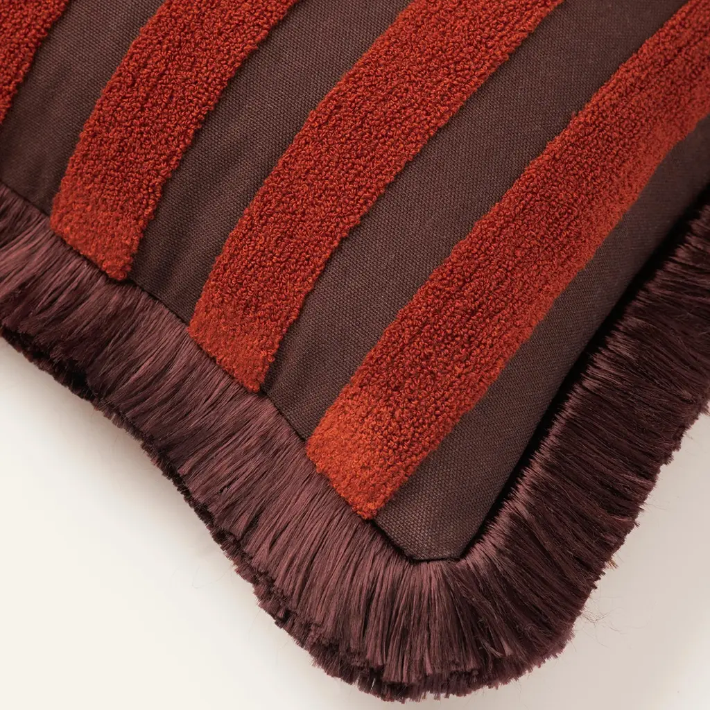 Add refined warmth and sophistication to your home with this striped cushion in rich chocolate brown and deep coral. The bold contrast of the velvet-like stripes paired with a luxurious fringe trim creates an elegant statement piece, perfect for enhancing any sofa, armchair, or bed. Crafted from 100% organic cotton duck, the cover features a strong, tightly woven fabric that is both smooth and naturally soft. The insert is made from recycled down and feathers, offering eco-conscious comfort without compromising on luxury. A timeless accent pillow that blends classic design with modern sustainability, ideal for layering with solids or patterns to create depth and character in your living space. Details: Dimensions: 24” x 16” (60 x 40 cm) Cover: 100% organic cotton duck Fill: recycled down & feather insert Colors: Chocolate with coral stripes, chocolate fringe Care: Dry clean recommended